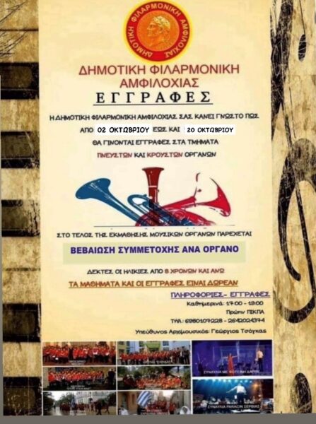 Ξεκινούν οι εγγραφές στη Δημοτική Φιλαρμονική Αμφιλοχίας από 2 Οκτωβρίου έως και 20 Οκτωβρίου στα τμήματα θεωρίας και εκμάθησης πνευστών κ...