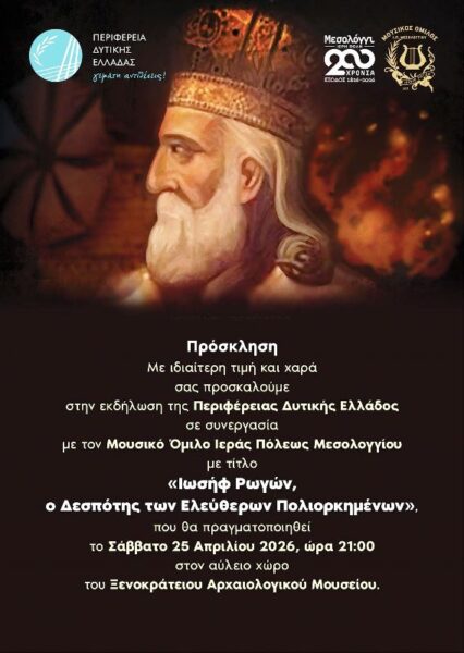 ΙΩΣΗΦ ΡΩΓΩΝ: Ο ΔΕΣΠΟΤΗΣ ΤΩΝ ΕΛΕΥΘΕΡΩΝ ΠΟΛΙΟΡΚΗΜΕΝΩΝ, Ξενοκράτειο Αρχαιολογικό Μουσείου, Ι.Π. Μεσολογγίου ώρα 21:00