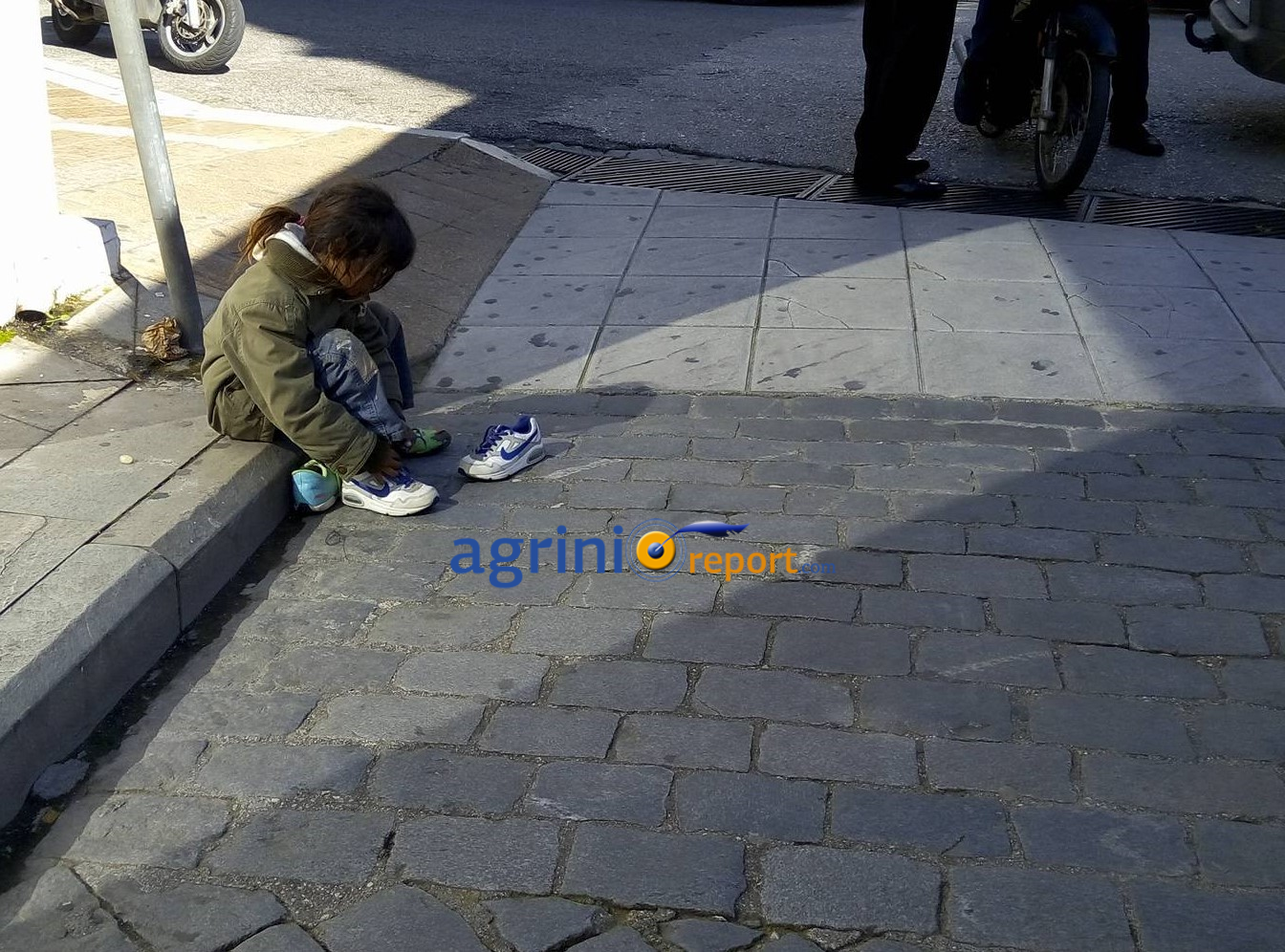 Σήμερα το πρωί, ο φακός του agrinioreport.com κατέγραψε ένα τέτοιο μάθημα. Επί της στοάς Παπαγιάννη, υπήρχε ένα μικρό κορίτσι Ρομά γύρω στα 5 το οποίο περιφερόταν αναζητώντας μερικά χρήματα ή λίγη τροφή. Τα παπούτσια τα οποία φορούσε ήταν μεγαλύτερα αλλά, προφανώς, δεν είχε άλλο ζευγάρι για να προστατεύσει τα πόδια της.