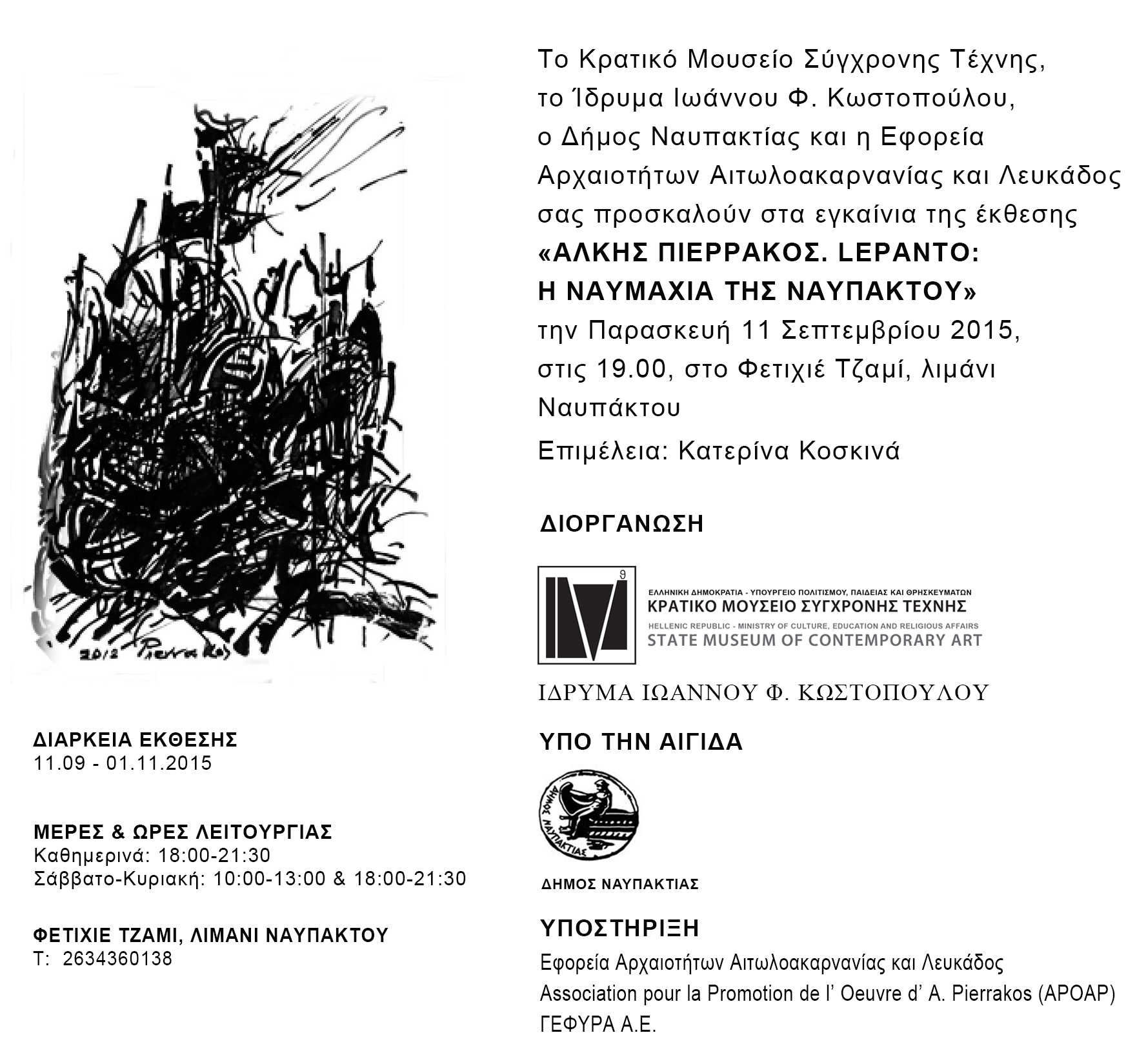 Το σημαντικότατο αυτό ιστορικό γεγονός που έλαβε χώρα τον Οκτώβριο του 1571, παρουσιάζεται από τον Άλκη Πιερράκο με γρήγορες όσο και στιβαρές πινελιές σινικής μελάνης σε χαρτί, με το Ιόνιο Πέλαγος ως αφαιρετικό σκηνικό και τη ζωγραφική του ως αφηγηματική και εικονοπλαστική δύναμη. Τα ασπρόμαυρα σχέδια υπογραμμίζουν την ικανότητα του εικαστικού λόγου να λειτουργεί, να επικαιροποιεί την ιστορική μνήμη, να μεταφέρει μηνύματα και να διεγείρει το συναίσθημα. Τα έργα, αν και αναφέρονται αφαιρετικά και δυναμικά στην κρίσιμη για την εξέλιξη του ευρωπαϊκού πολιτισμού Ναυμαχία της Ναυπάκτου, η οποία καθόρισε εν πολλοίς την Ευρωπαϊκή τύχη μετά από τη σύγκρουση των δυνάμεων του χριστιανικού δυτικού κόσμου και του Ισλάμ, παραπέμπουν στις σημερινές, καθημερινές εικόνες άγριων συγκρούσεων και αποτρόπαιων πράξεων, με δραματικές επιπτώσεις και πολλά αθώα θύματα σε όλο τον πλανήτη και ειδικότερα στη Μεσόγειο.