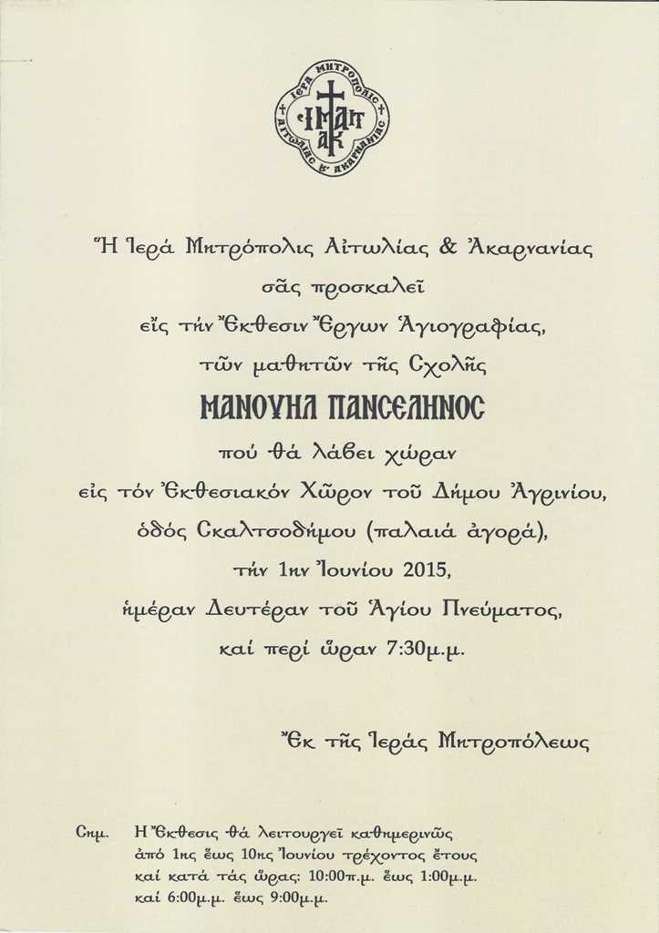 Η Ιερά Μητρόπολις Αιτωλίας και Ακαρνανίας σας προσκαλεί στην Έκθεση της Σχολής Αγιογραφίας της Ιεράς Μητροπόλεως, όπου θα παρουσιαστούν έργα των μαθητών με γενικό θέμα: Μανουήλ Πανσέληνος.