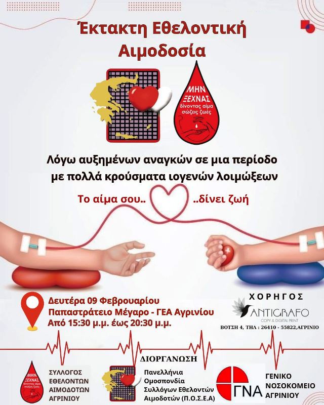 Ο Σύλλογος Εθελοντών Αιμοδοτών Αγρινίου και το Γενικό Νοσοκομείο Αιτωλοακαρνανίας Νοσηλευτική Μονάδα Αγρινίου (Τμήμα Αιμοδοσίας) οργανώνουν και σας καλούν να συμμετέχετε στην Απογευματινή Εθελοντική Αιμοδοσία, την Δευτέρα 09/02/2026 και ώρα 15.30 – 20.30 στο Παπαστράτειο Μέγαρο της Γυμναστικής Εταιρείας Αγρινίου (στην περιοχή Συντριβάνι).