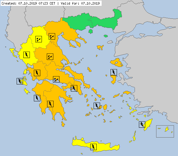 1. Σήμερα Δευτέρα (07-10-2019), ισχυρές βροχές και καταιγίδες προβλέπονται, από το πρωί στην κεντρική Μακεδονία, τη Θεσσαλία και τις Σποράδες, από τις προμεσημβρινές ώρες στο Ιόνιο, την Ήπειρο, τη δυτική Στερεά, την Πελοπόννησο, την ανατολική Στερεά, την Αττική και την Εύβοια και πιθανόν τη δυτική Μακεδονία. Από το απόγευμα στις Κυκλάδες, πιθανόν την Κρήτη και από το βράδυ στα νησιά του ανατολικού Αιγαίου και τη νύχτα στα Δωδεκάνησα.