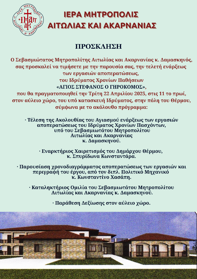 Την Τρίτη της Διακαινησίμου Εβδομάδος, 22 Απριλίου 2025 και ώρα 11:00’ το πρωί θα πραγματοποιηθεί ο Αγιασμός για την έναρξη των εργασιών αποπερατώσεως του Ιδρύματος Χρονίων Παθήσεων «ΆΓΙΟΣ ΣΤΕΦΑΝΟΣ Ο ΓΗΡΟΚΟΜΟΣ» στο Θέρμο.