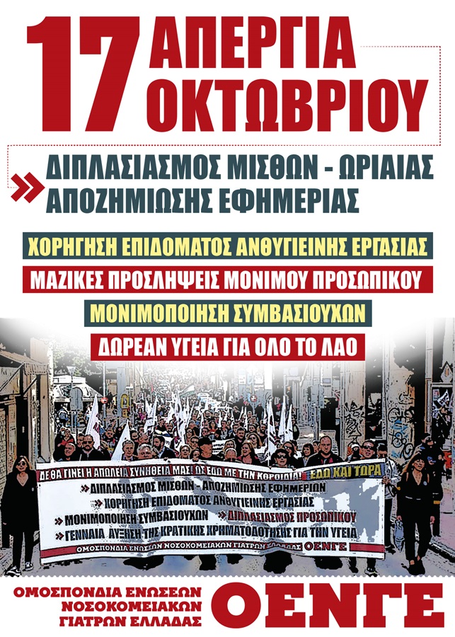 Όλες και όλοι στην Πανυγειονομική Απεργία στις 17 Οκτώβρη και στις απεργιακές συγκεντρώσεις: