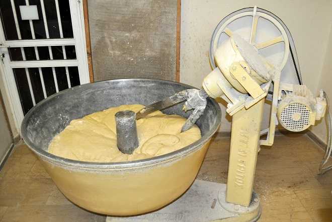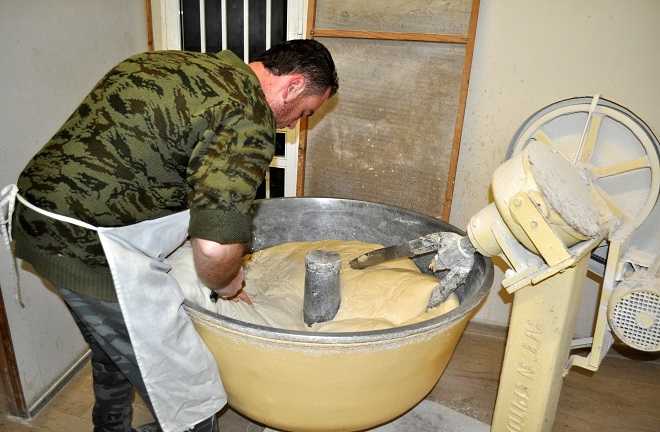Αρχικά, ρίχνεται η επιθυμητή ποσότητα αλευριού στο ζυμωτήριο ανάλογα την ποσότητα που πρέπει να παραχθεί. Άλλοι βάζουν περισσότερο κίτρινο αλεύρι, άλλοι περισσότερο χωριάτικο. Αυτό έγκειται στον κάθε φούρναρη. Μετά το αλεύρι, συνέχεια έχουν το αλάτι και η μαγιά τα οποία μπαίνουν κι αυτά στο ζυμωτήριο, προσπαθώντας όμως να μην έρθει σε επαφή η μαγιά με το αλάτι για την καλύτερη δυνατή απόδοσή της. Στη συνέχεια στο ζυμωτήριο ρίχνεται σταδιακά νερό, όχι όμως όλο μαζί για να μην τριφτεί το ζυμάρι αλλά να αποκτήσει ελαστικότητα.