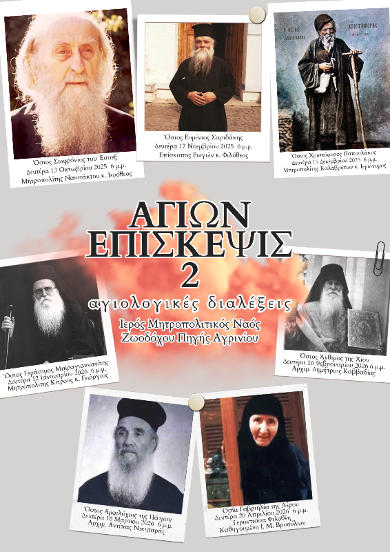 Συνεχίζονται οι αγιολογικές διαλέξεις στον Ιερό Μητροπολιτικό Ναό Ζωοδόχου Πηγής Αγρινίου, με γενικό τίτλο «Αγίων Επίσκεψις 2», οι οποίες είναι αφιερωμένες σε νεοφανείς Αγίους της εποχής μας.