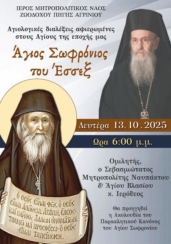 Με ομιλητή τον Σεβασμιώτατο Μητροπολίτη Ναυπάκτου και Αγίου Βλασίου κ. Ιερόθεο θα πραγματοποιηθεί η Α’ Αγιολογική Διάλεξη στον Ιερό Μητροπολιτικό Ναό Ζωοδόχου Πηγής Αγρινίου σήμερα, Δευτέρα 13 Οκτωβρίου 2025 και ώρα 6:00΄ το απόγευμα.