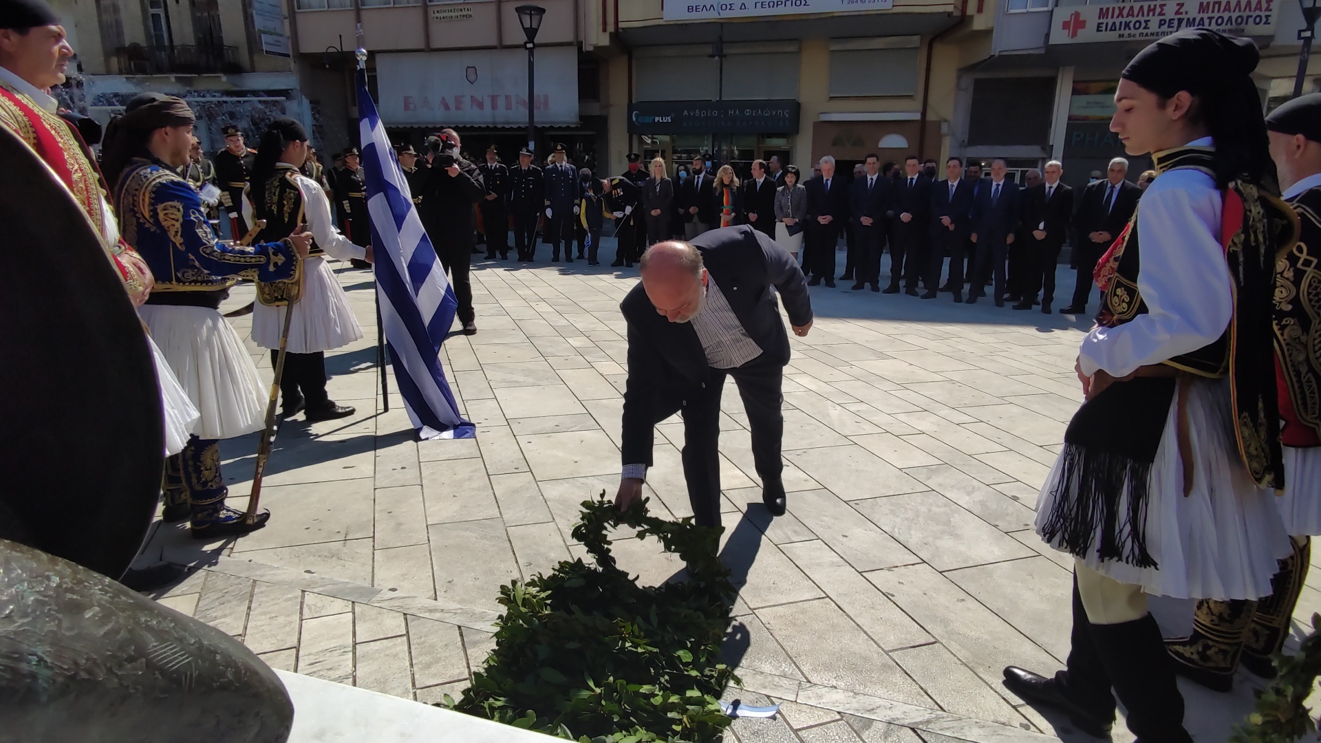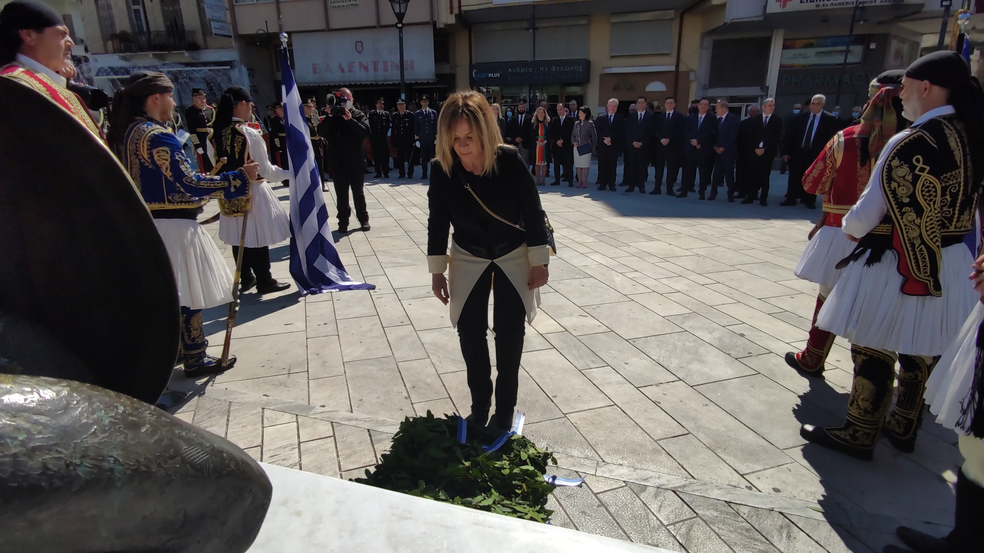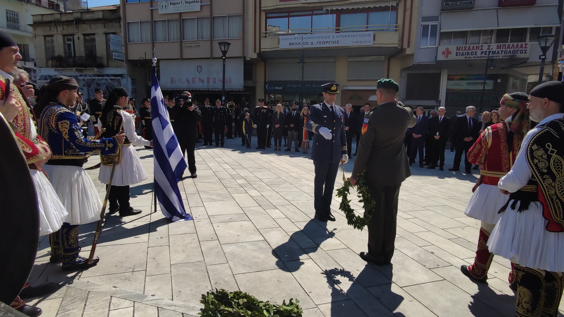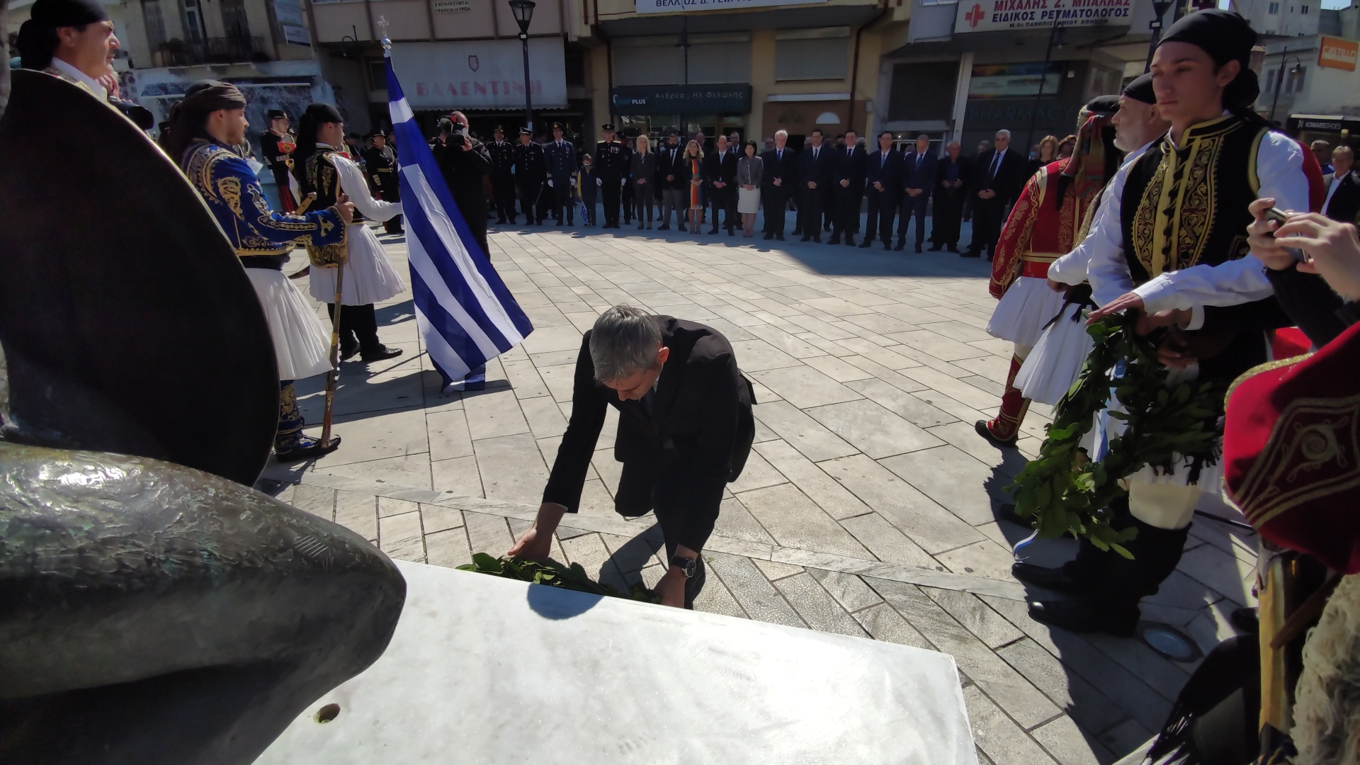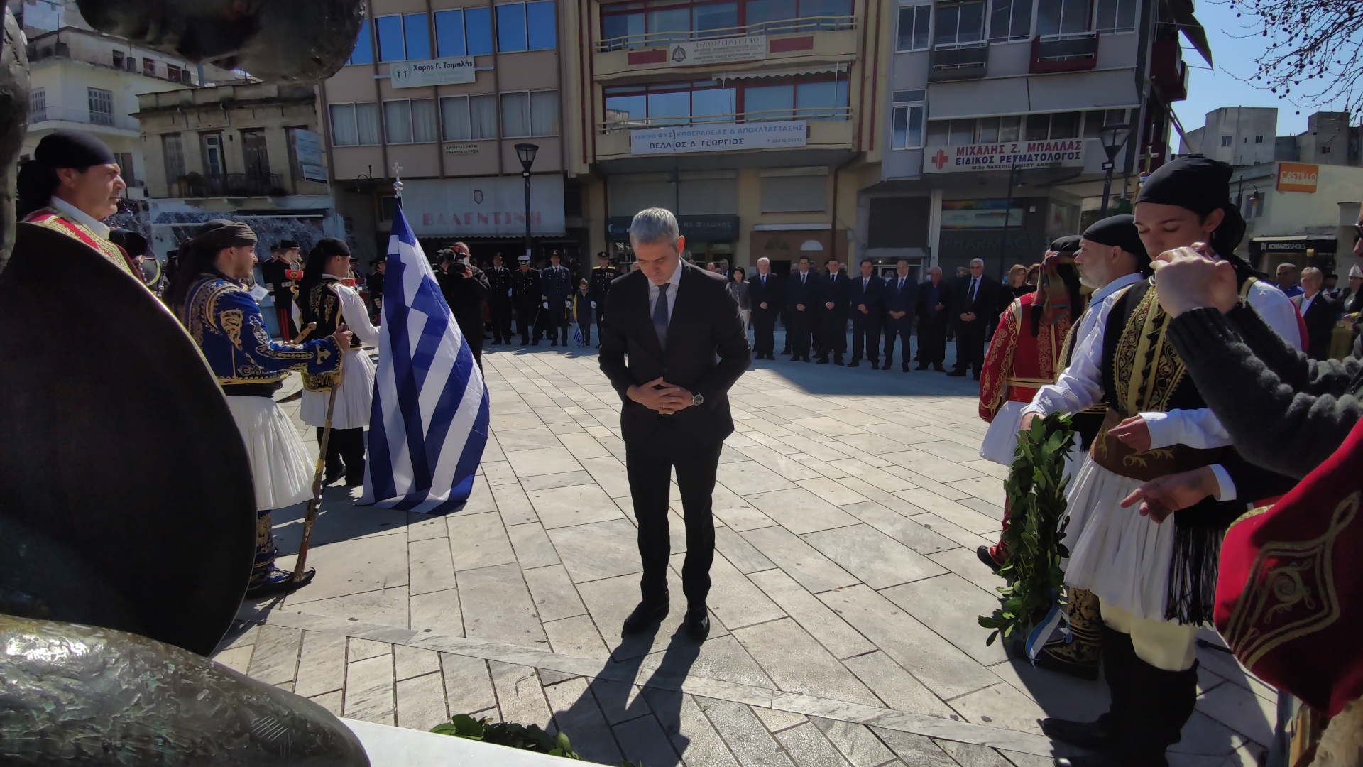 Στην συνέχεια ακολούθησε επιμνημόσυνη δέηση και κατάθεση στεφάνων στο Μνημείο των Πεσόντων στην Πλατεία Μαρίας Δημάδη.