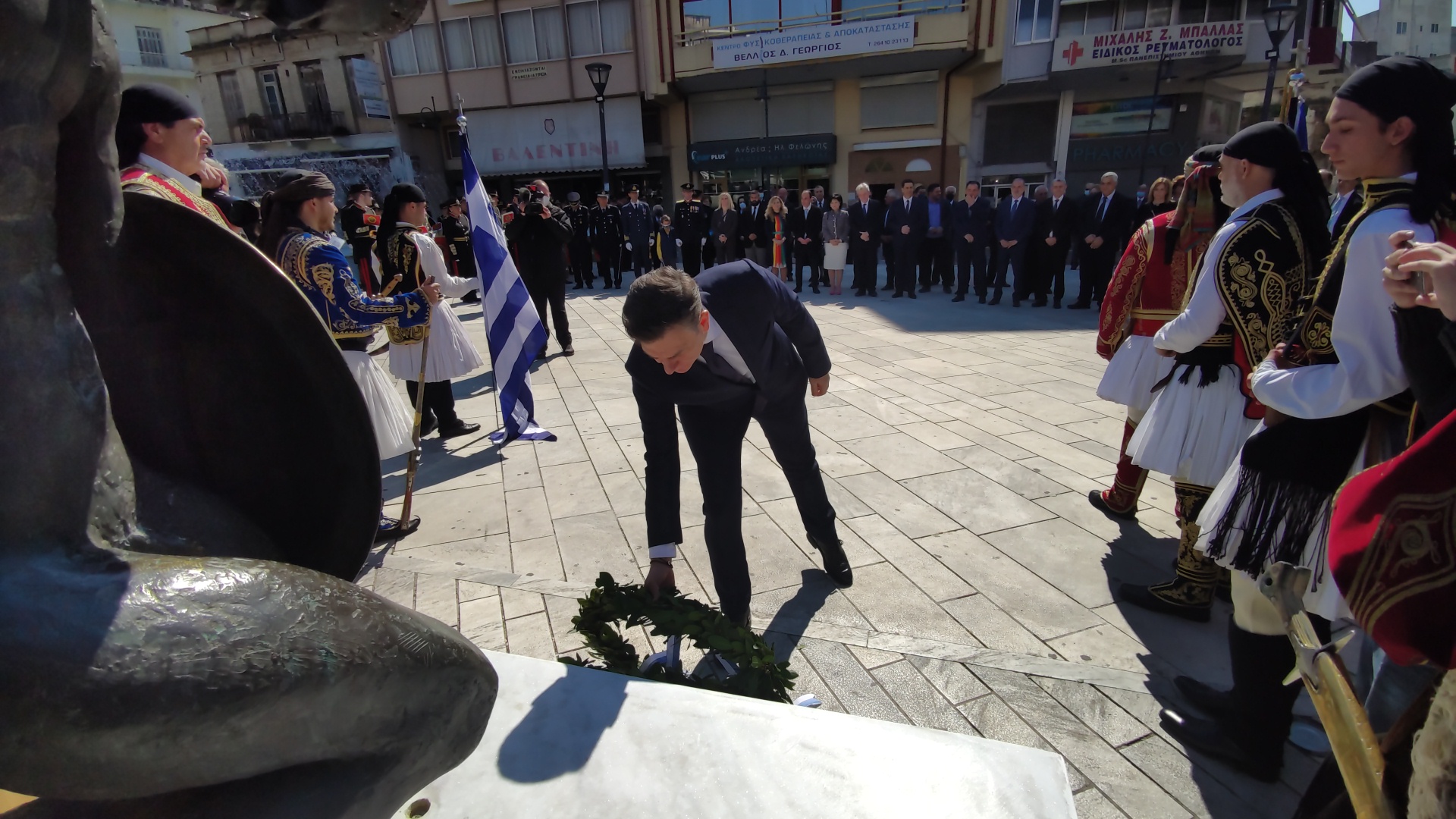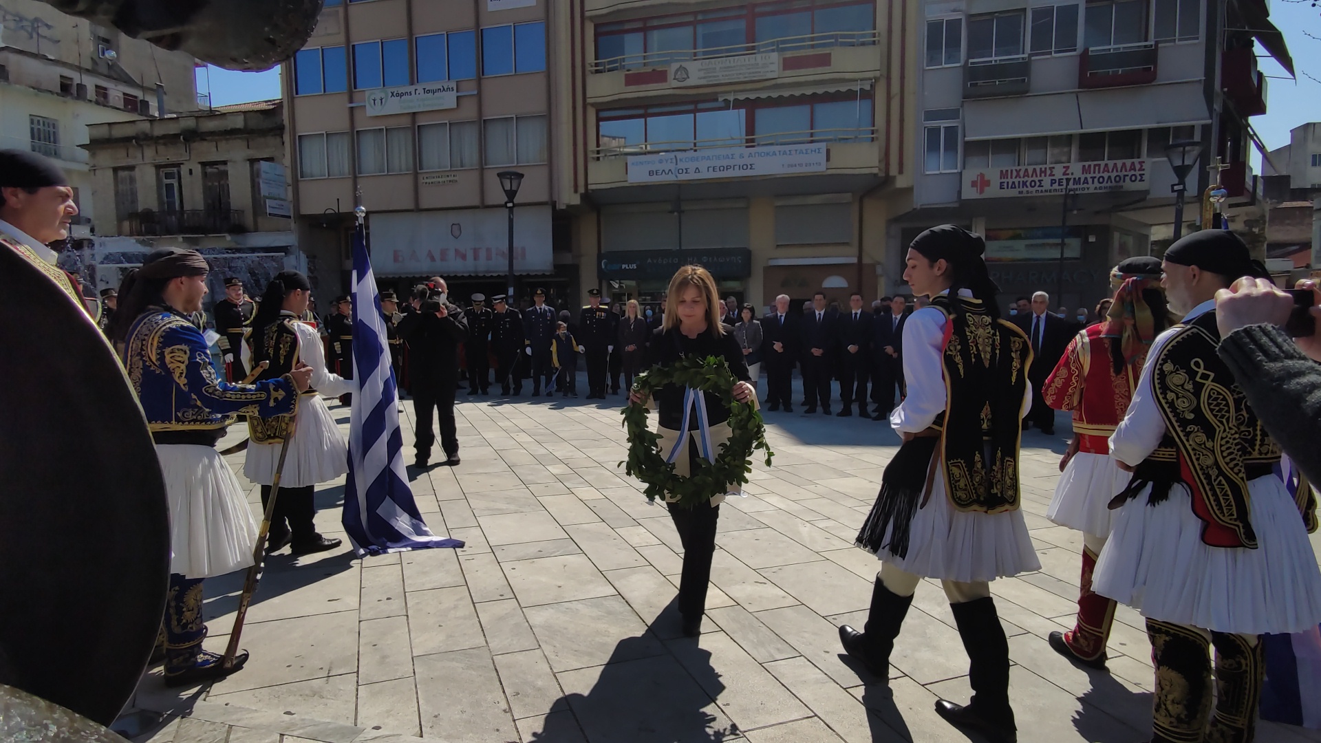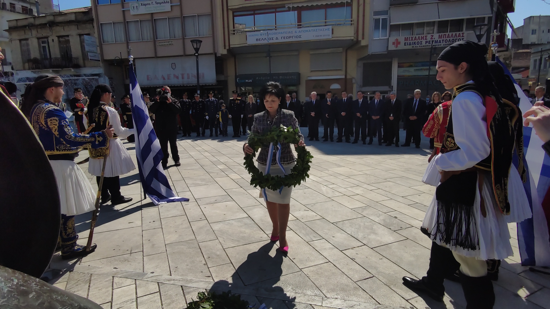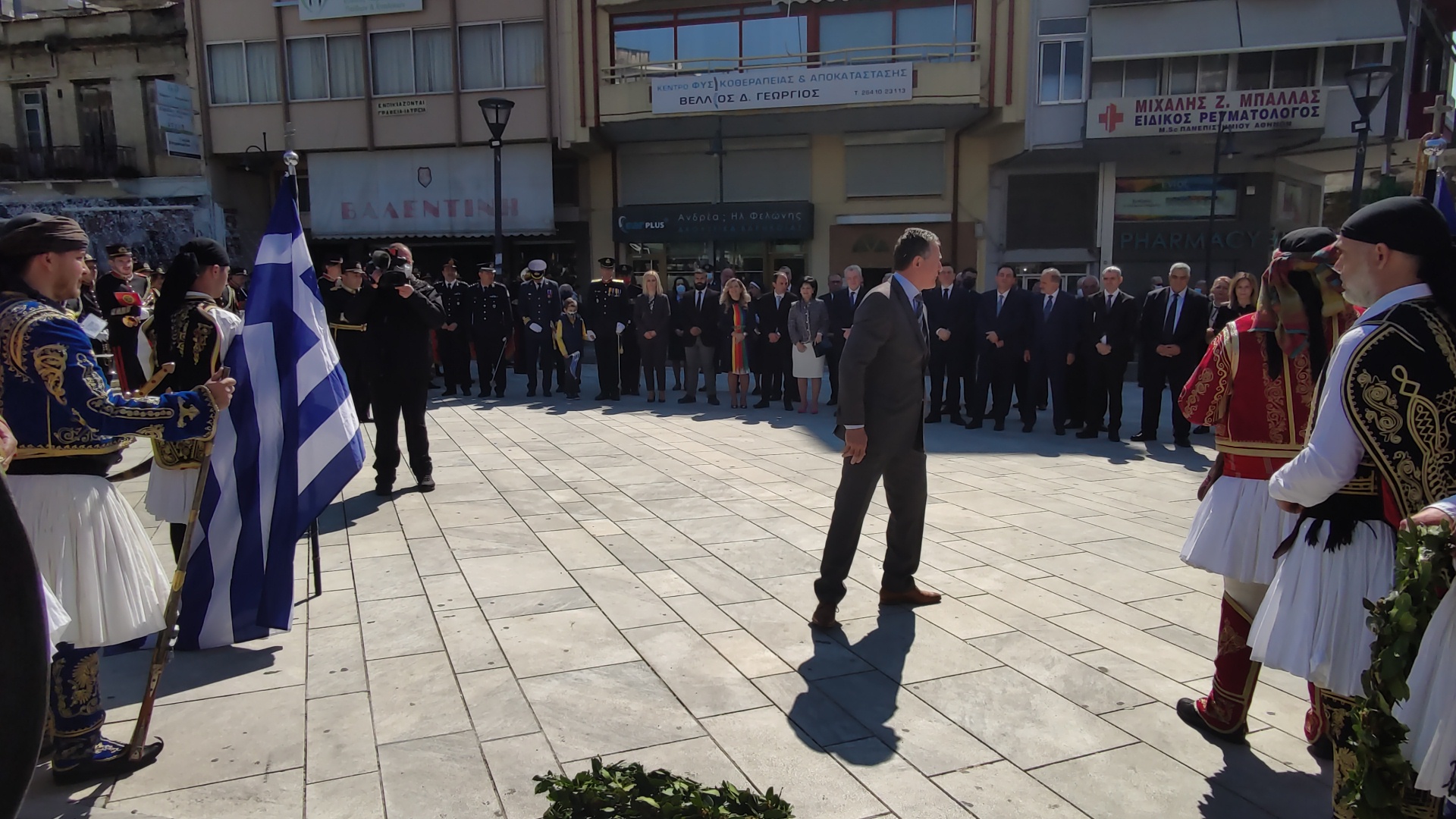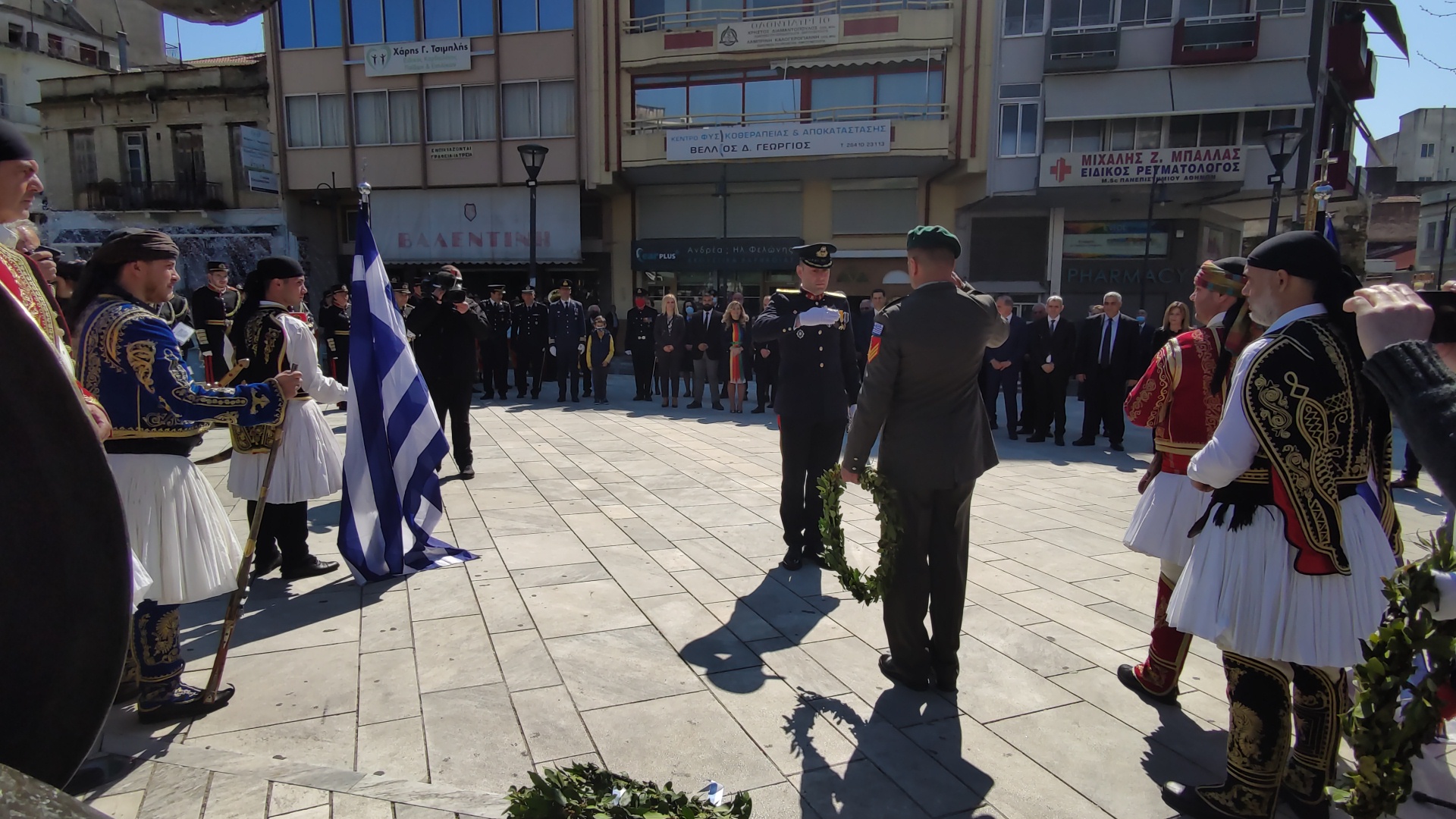Στην συνέχεια ακολούθησε επιμνημόσυνη δέηση και κατάθεση στεφάνων στο Μνημείο των Πεσόντων στην Πλατεία Μαρίας Δημάδη.