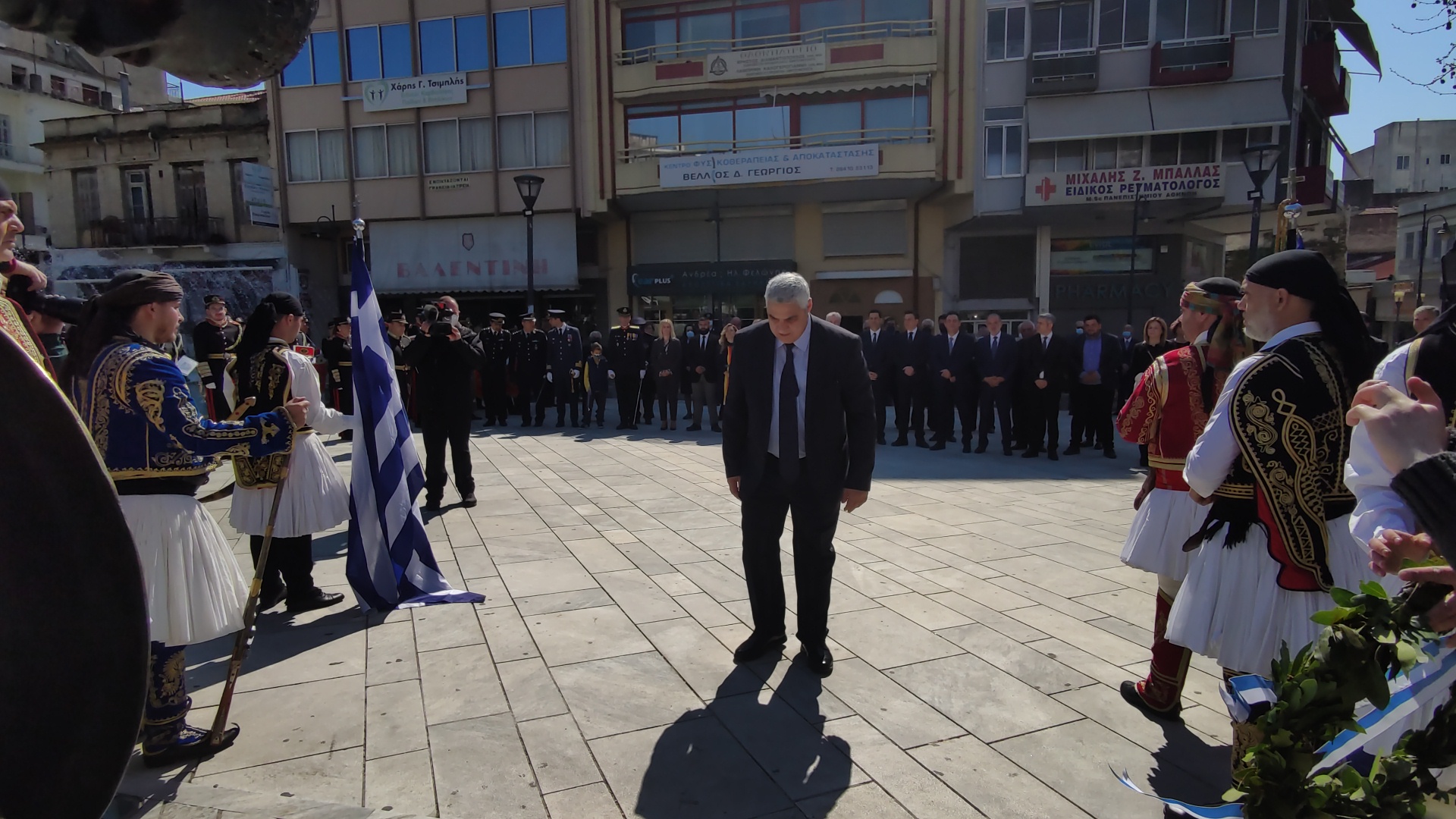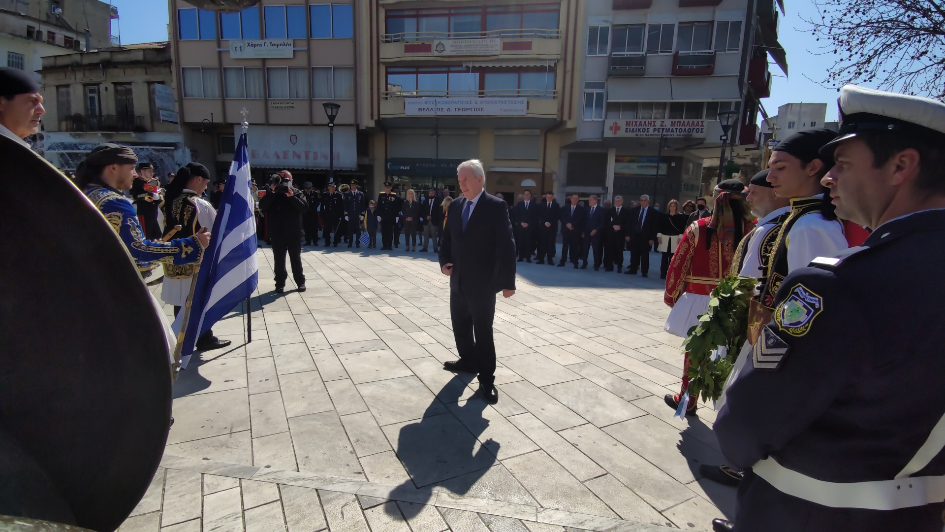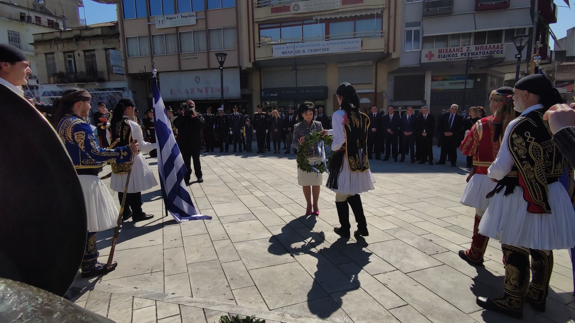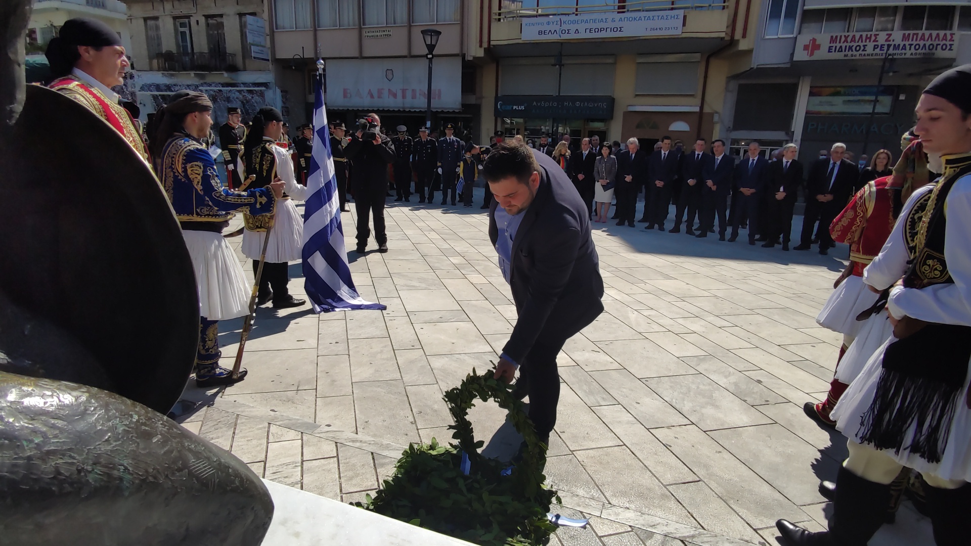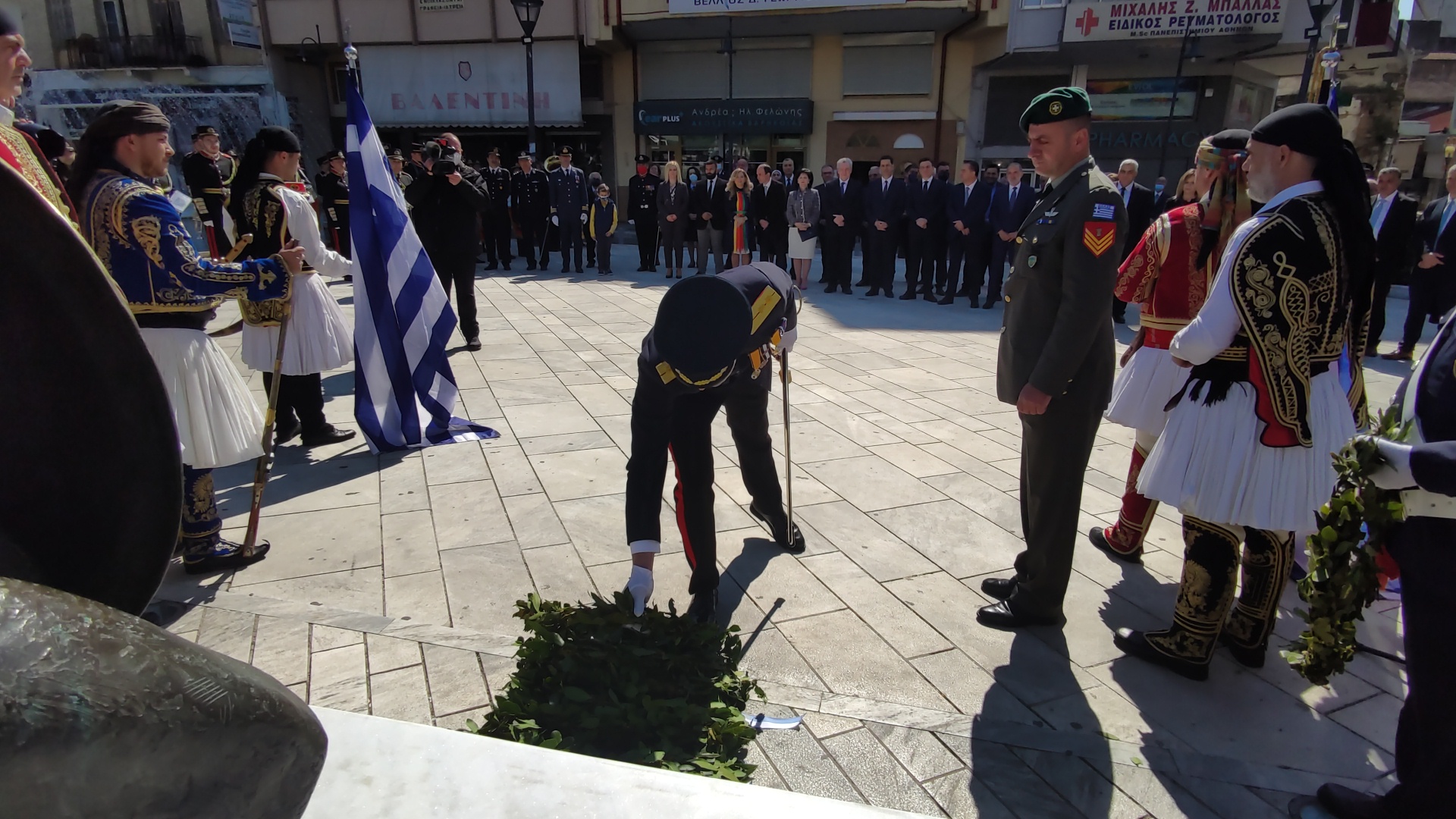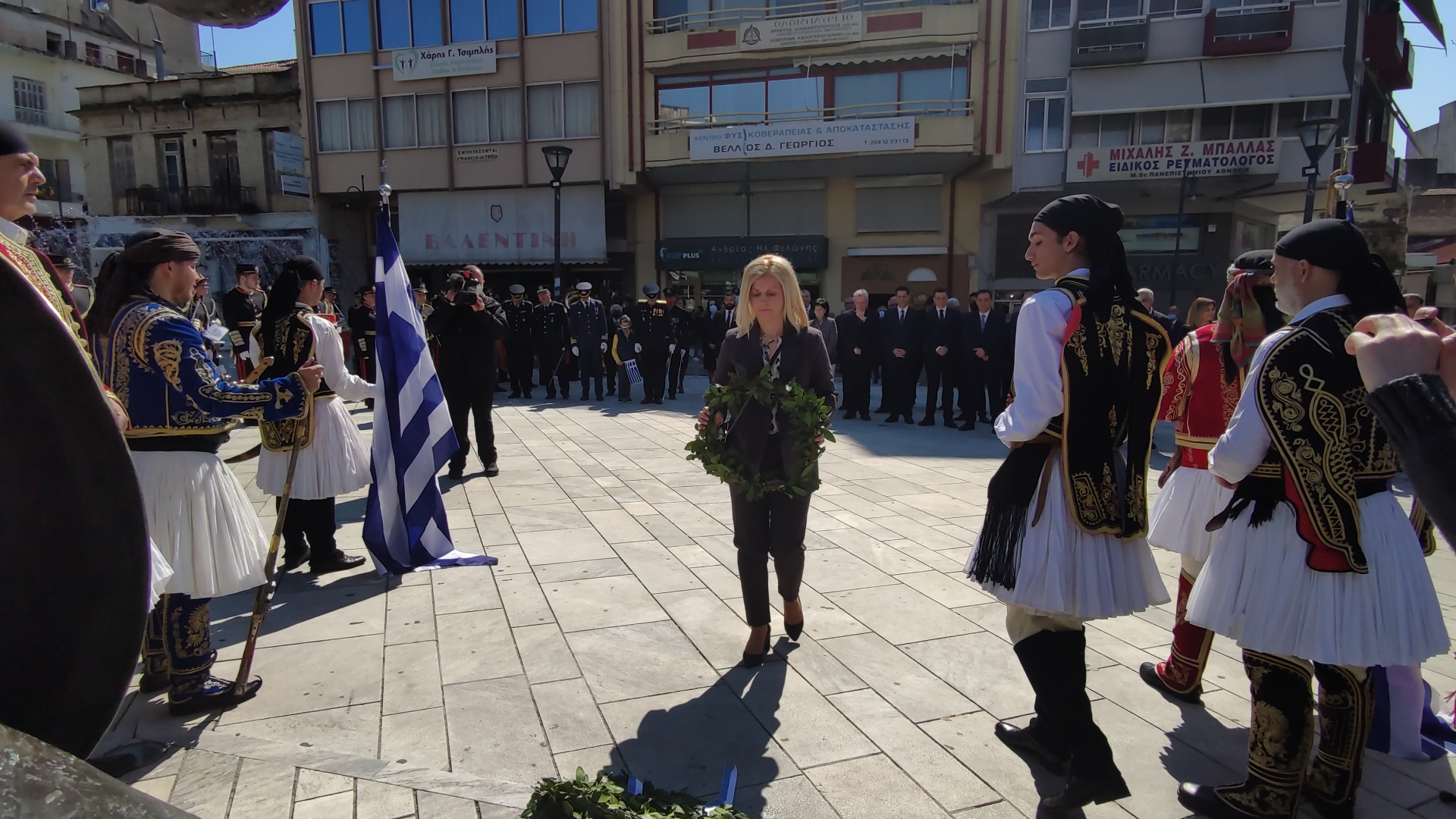 Στην συνέχεια ακολούθησε επιμνημόσυνη δέηση και κατάθεση στεφάνων στο Μνημείο των Πεσόντων στην Πλατεία Μαρίας Δημάδη.