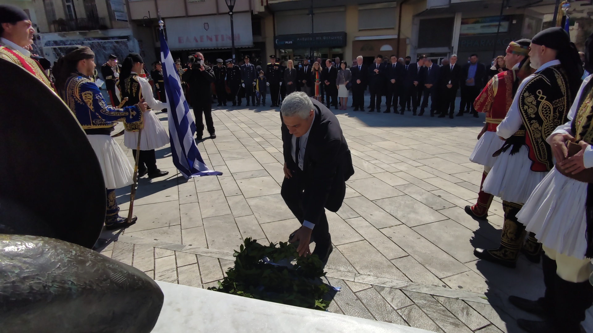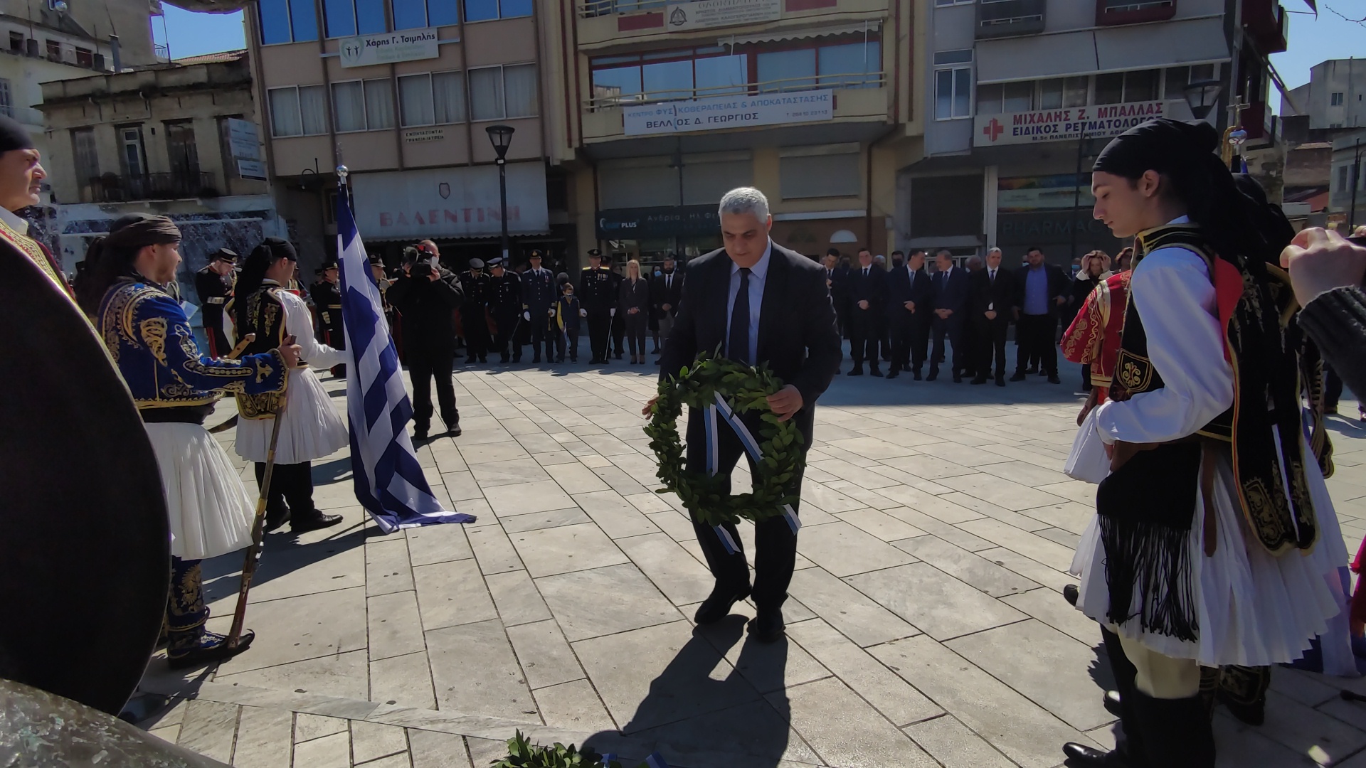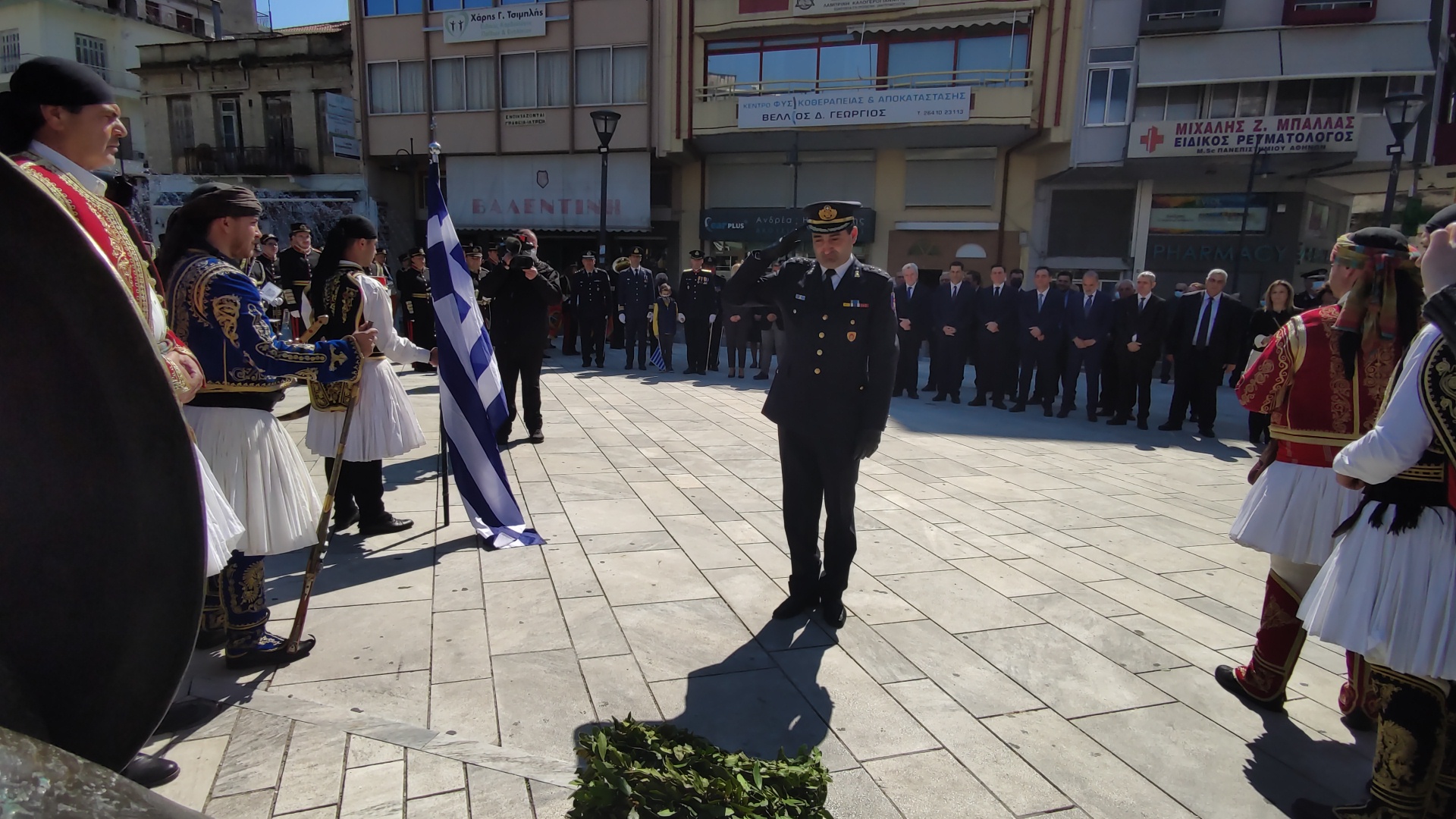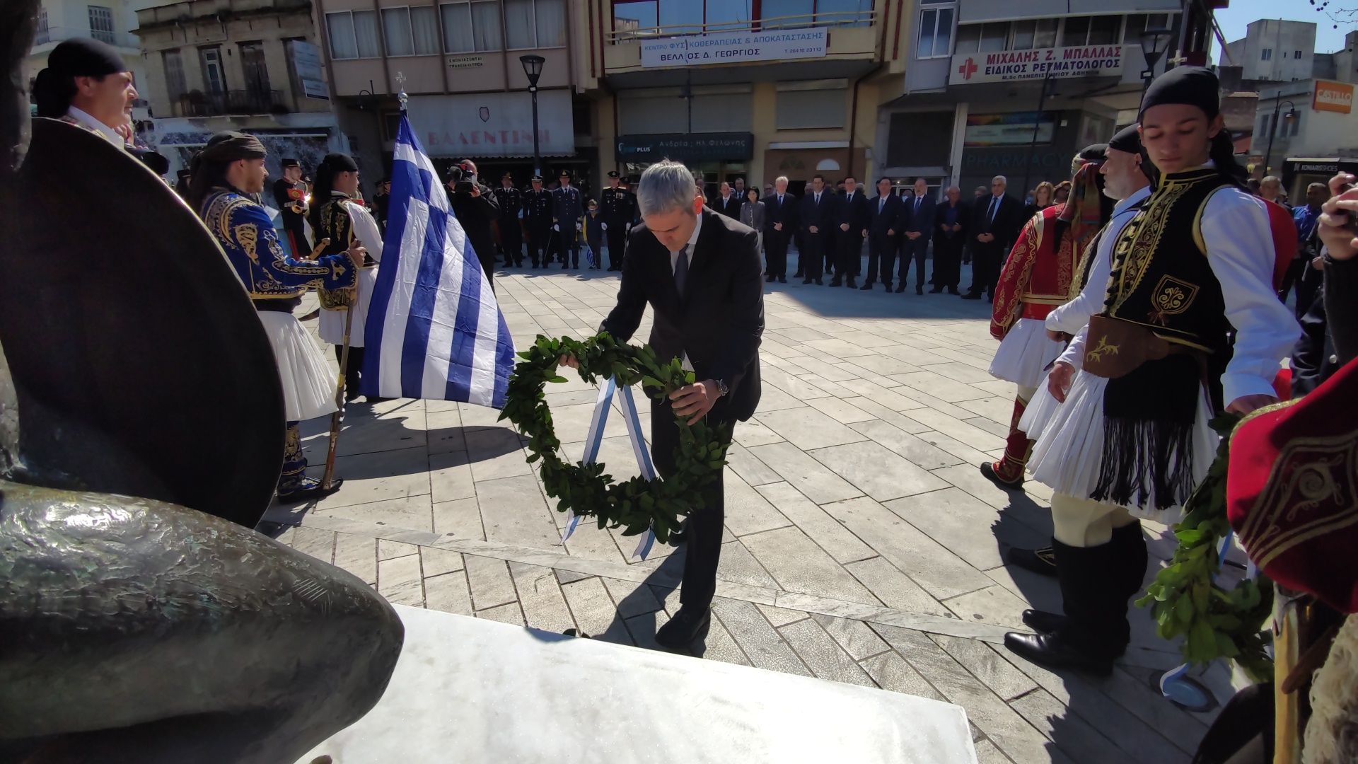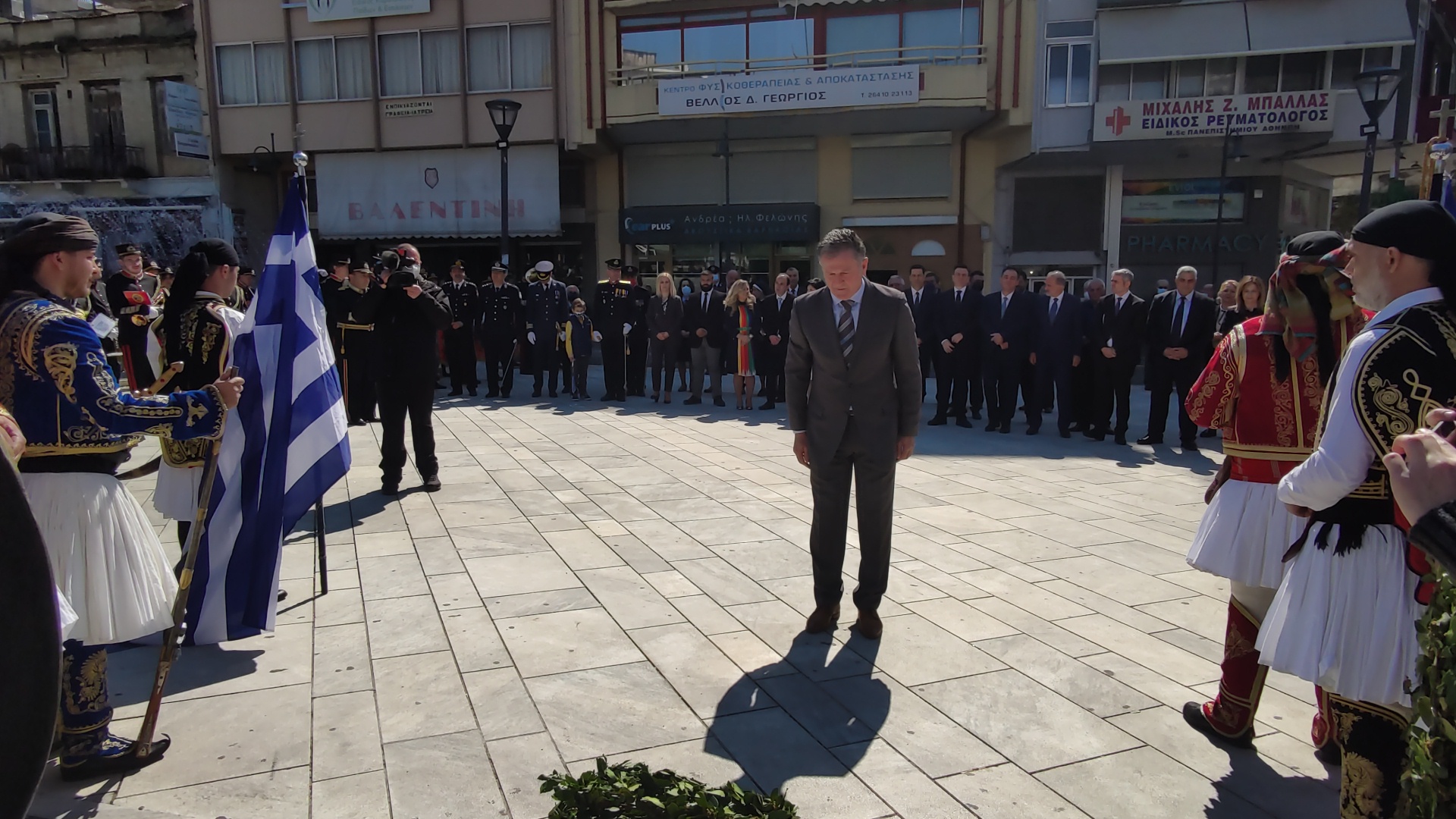 Στην συνέχεια ακολούθησε επιμνημόσυνη δέηση και κατάθεση στεφάνων στο Μνημείο των Πεσόντων στην Πλατεία Μαρίας Δημάδη.