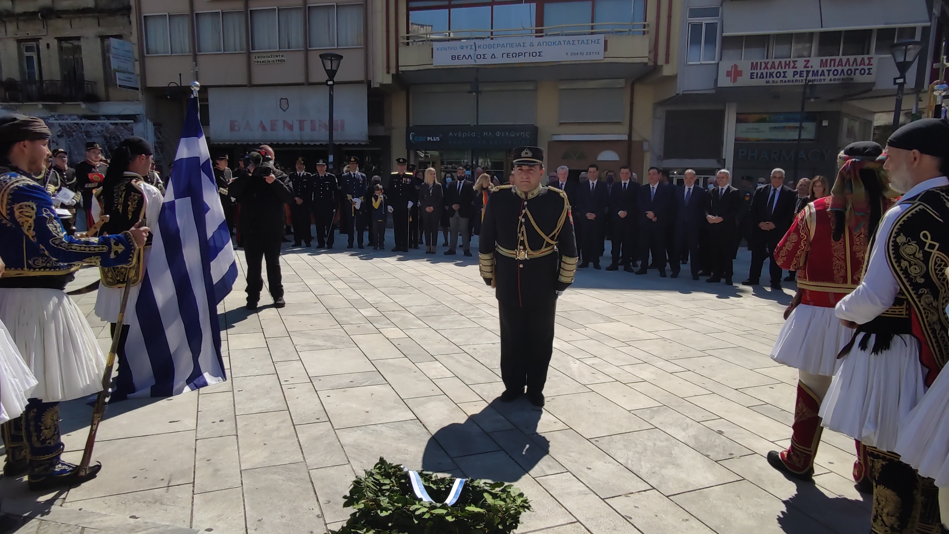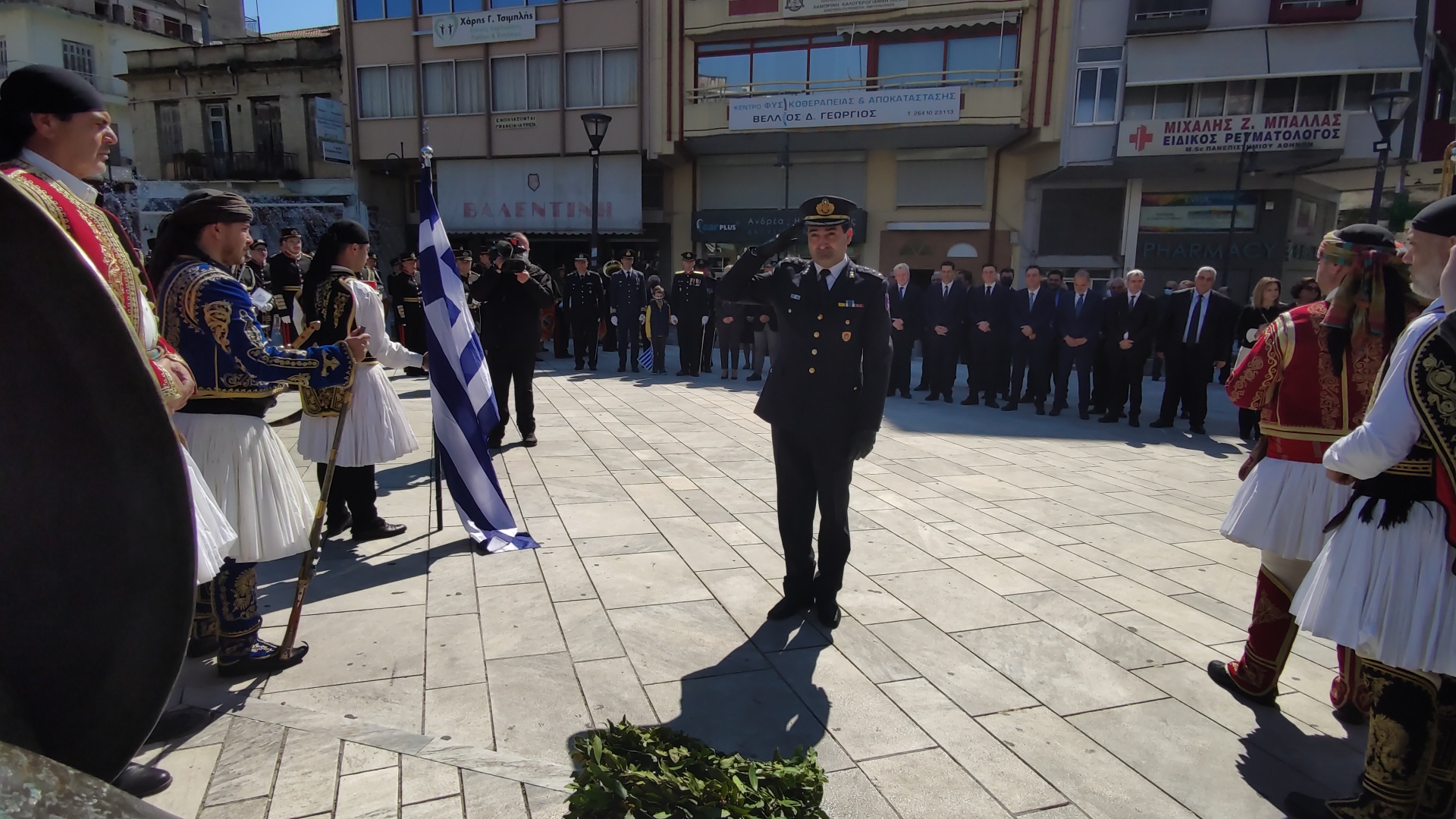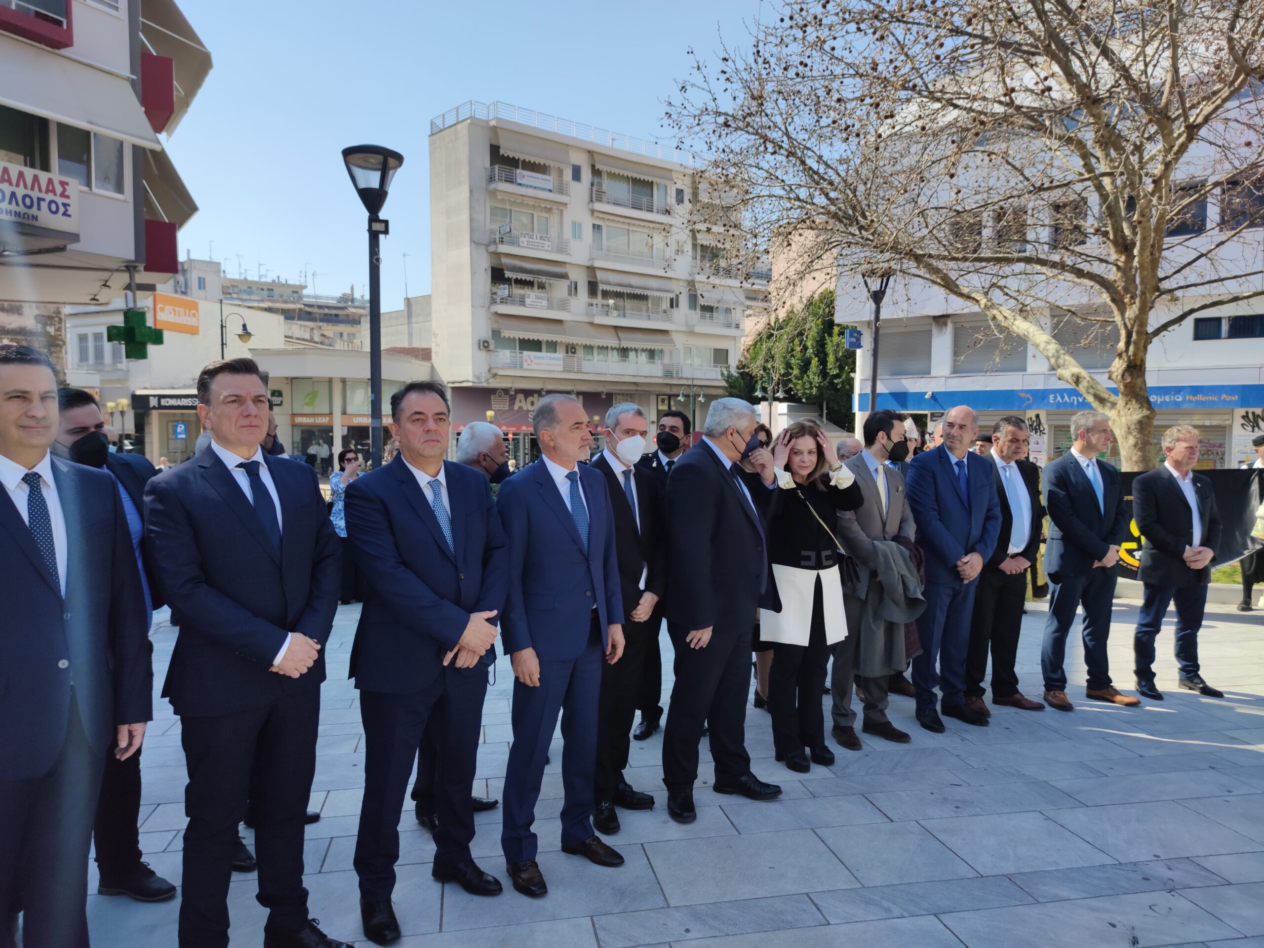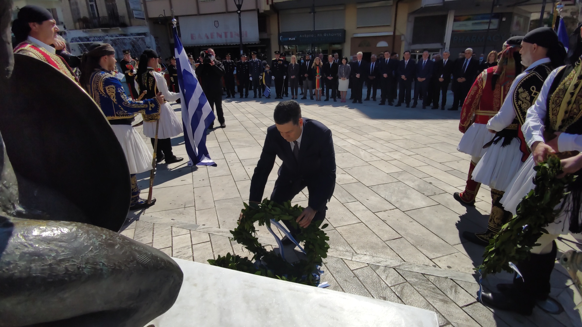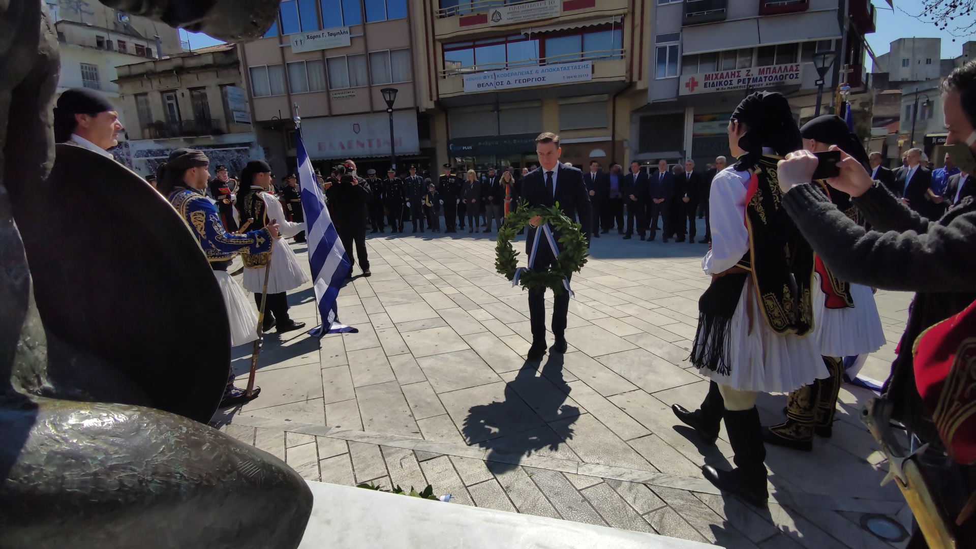 Στην συνέχεια ακολούθησε επιμνημόσυνη δέηση και κατάθεση στεφάνων στο Μνημείο των Πεσόντων στην Πλατεία Μαρίας Δημάδη.