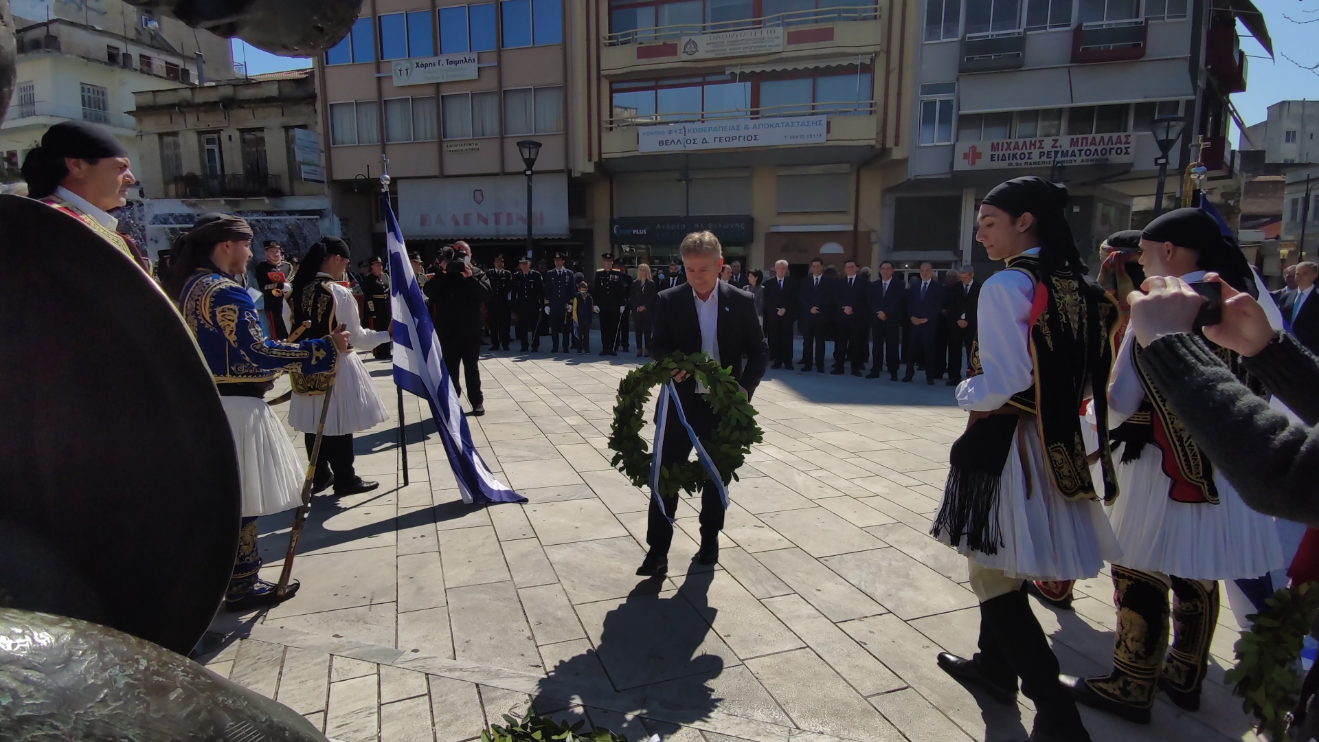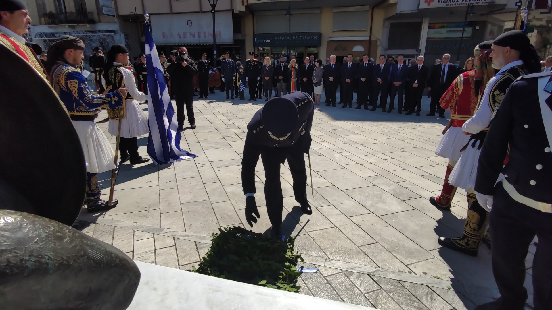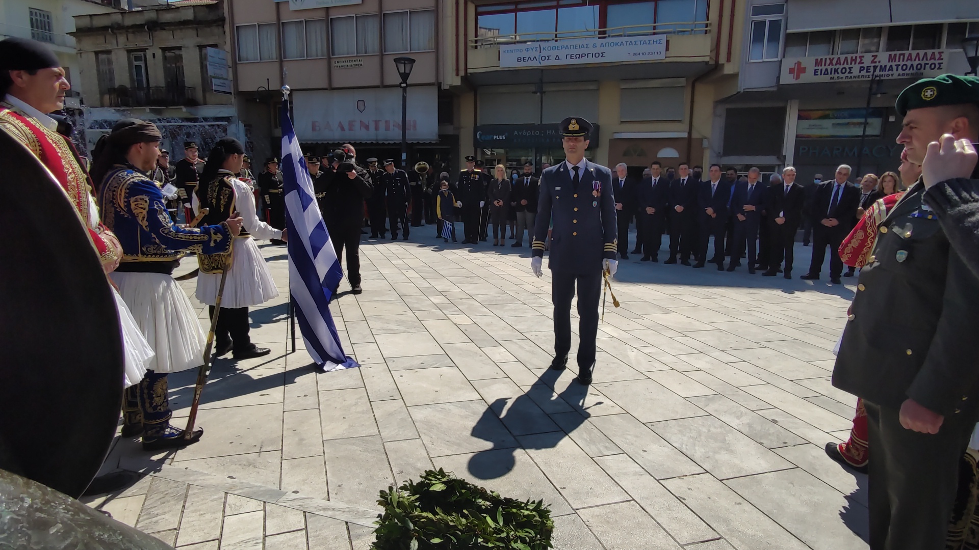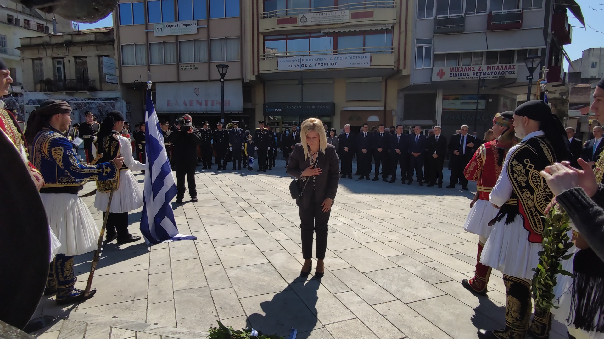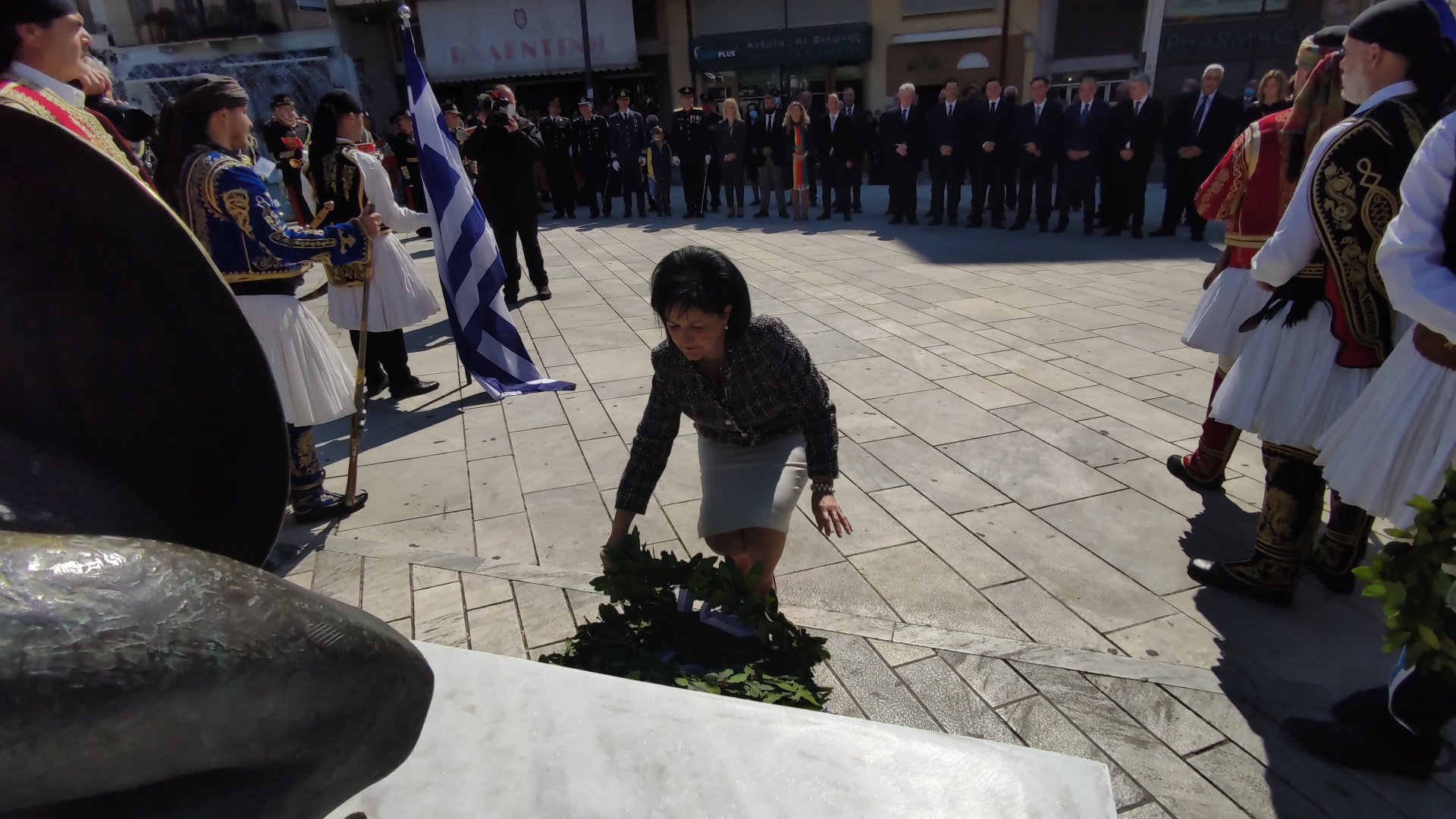 Στην συνέχεια ακολούθησε επιμνημόσυνη δέηση και κατάθεση στεφάνων στο Μνημείο των Πεσόντων στην Πλατεία Μαρίας Δημάδη.