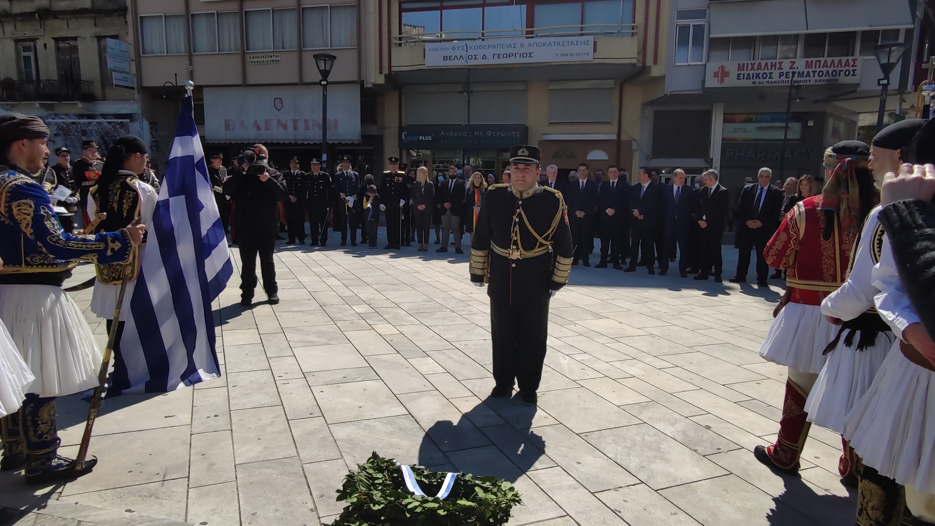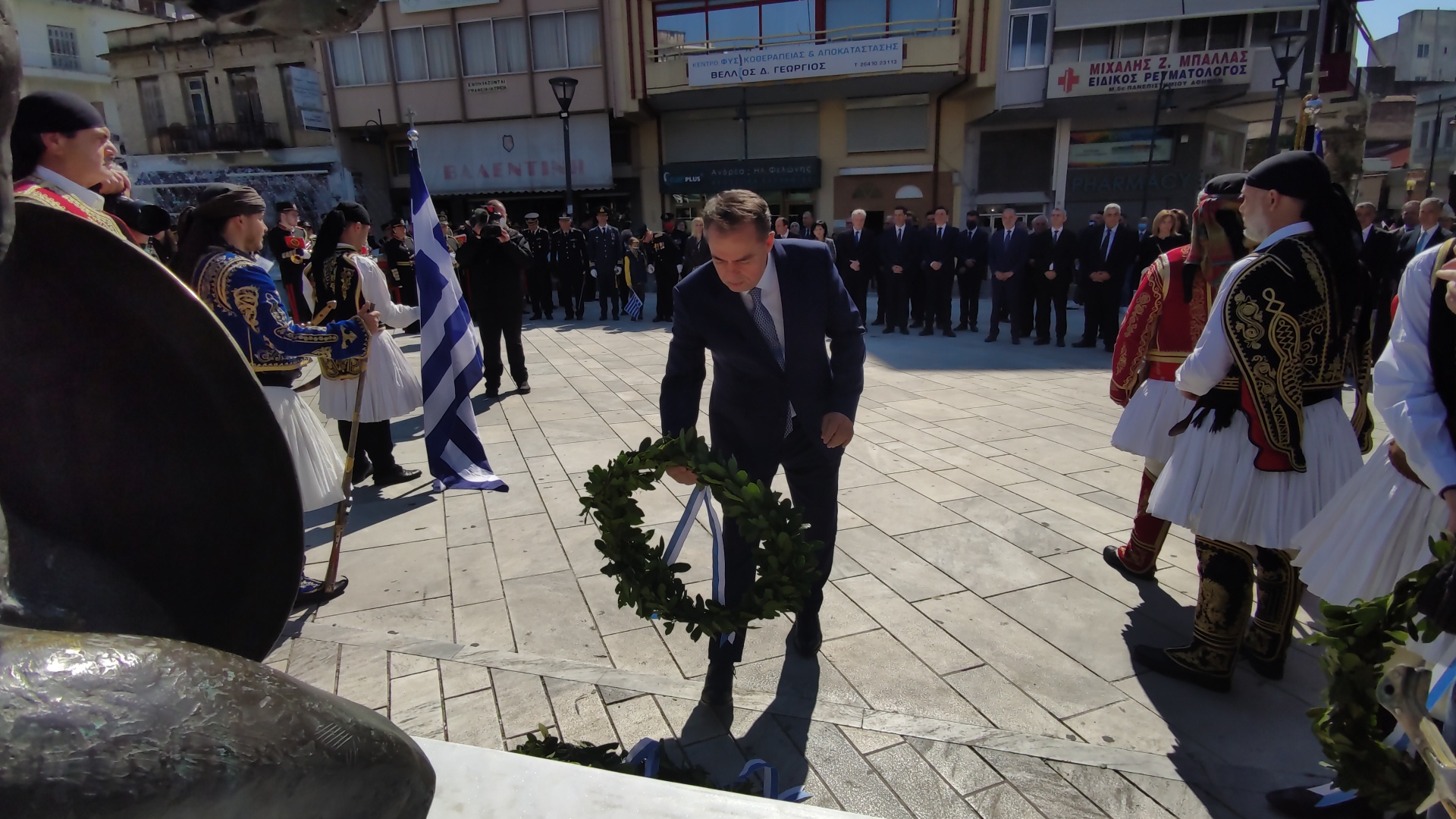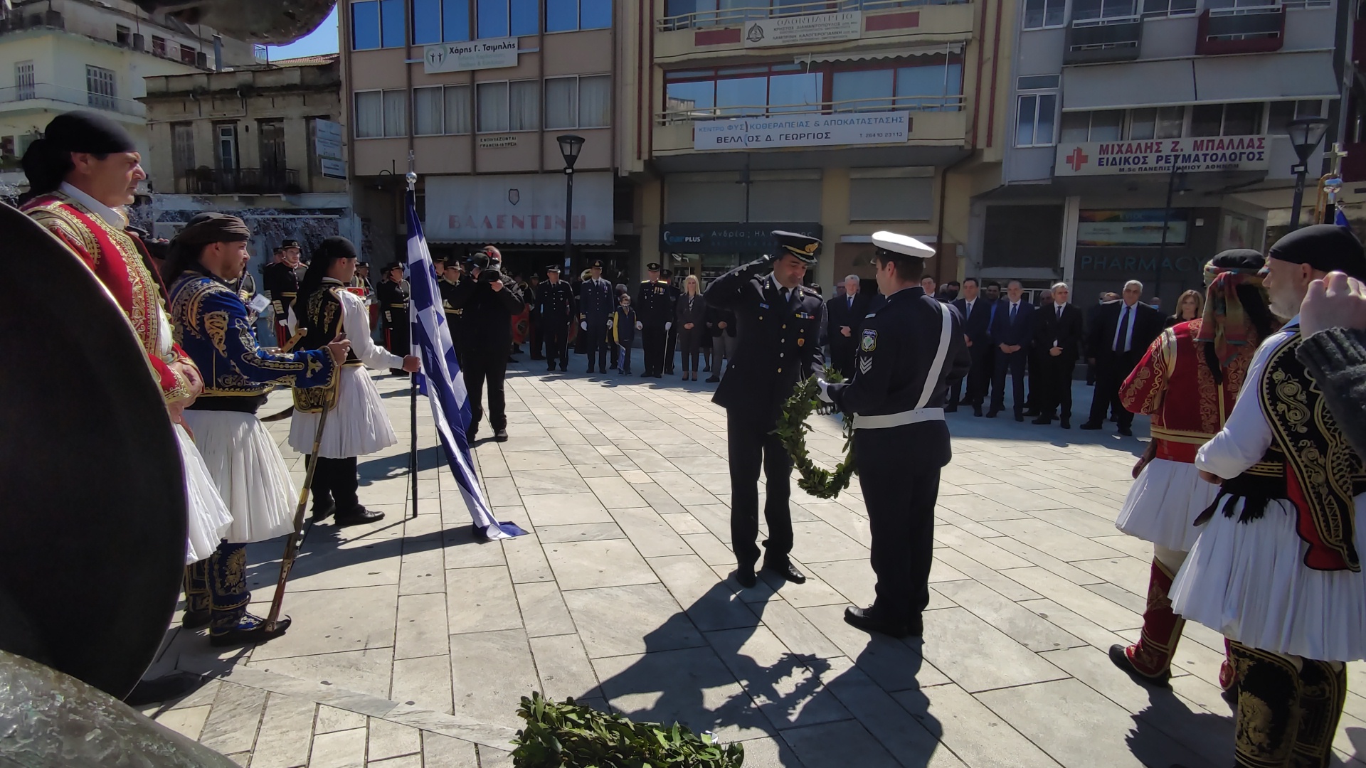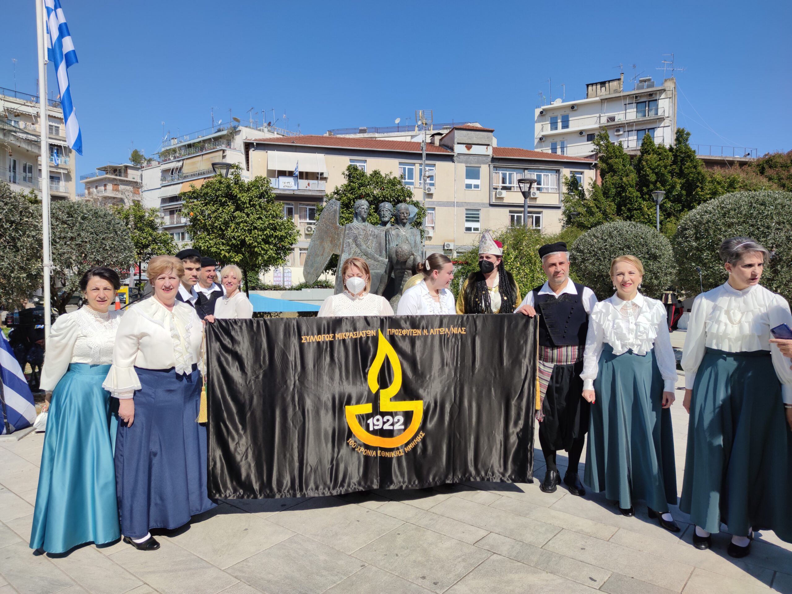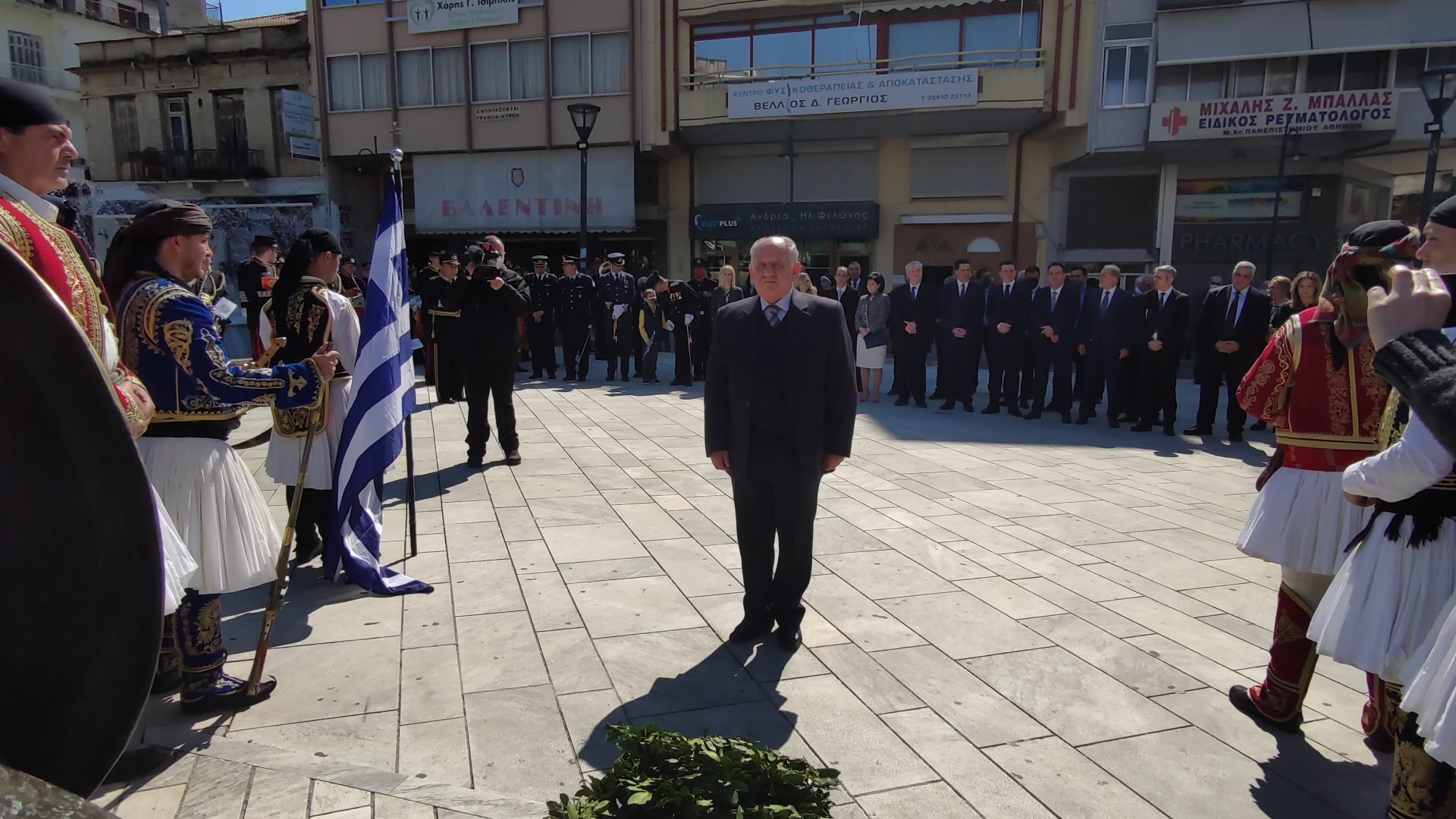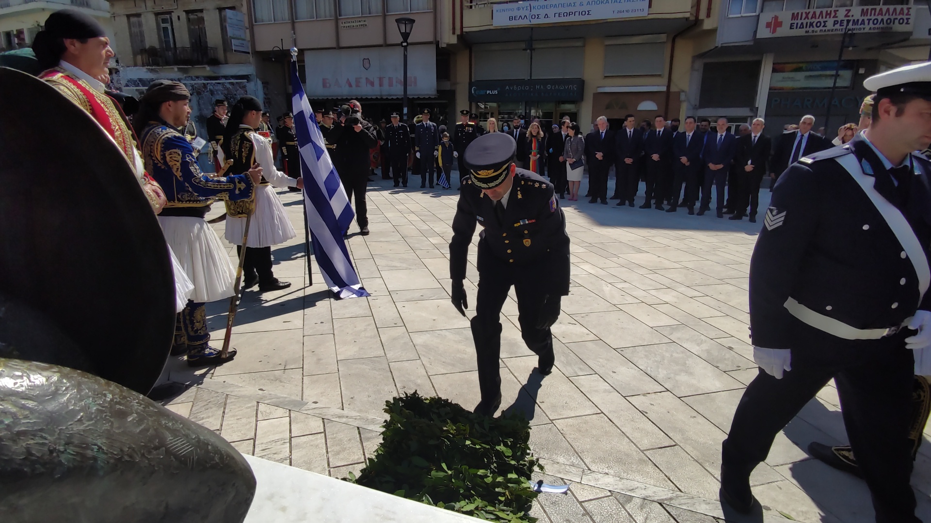 Στην συνέχεια ακολούθησε επιμνημόσυνη δέηση και κατάθεση στεφάνων στο Μνημείο των Πεσόντων στην Πλατεία Μαρίας Δημάδη.