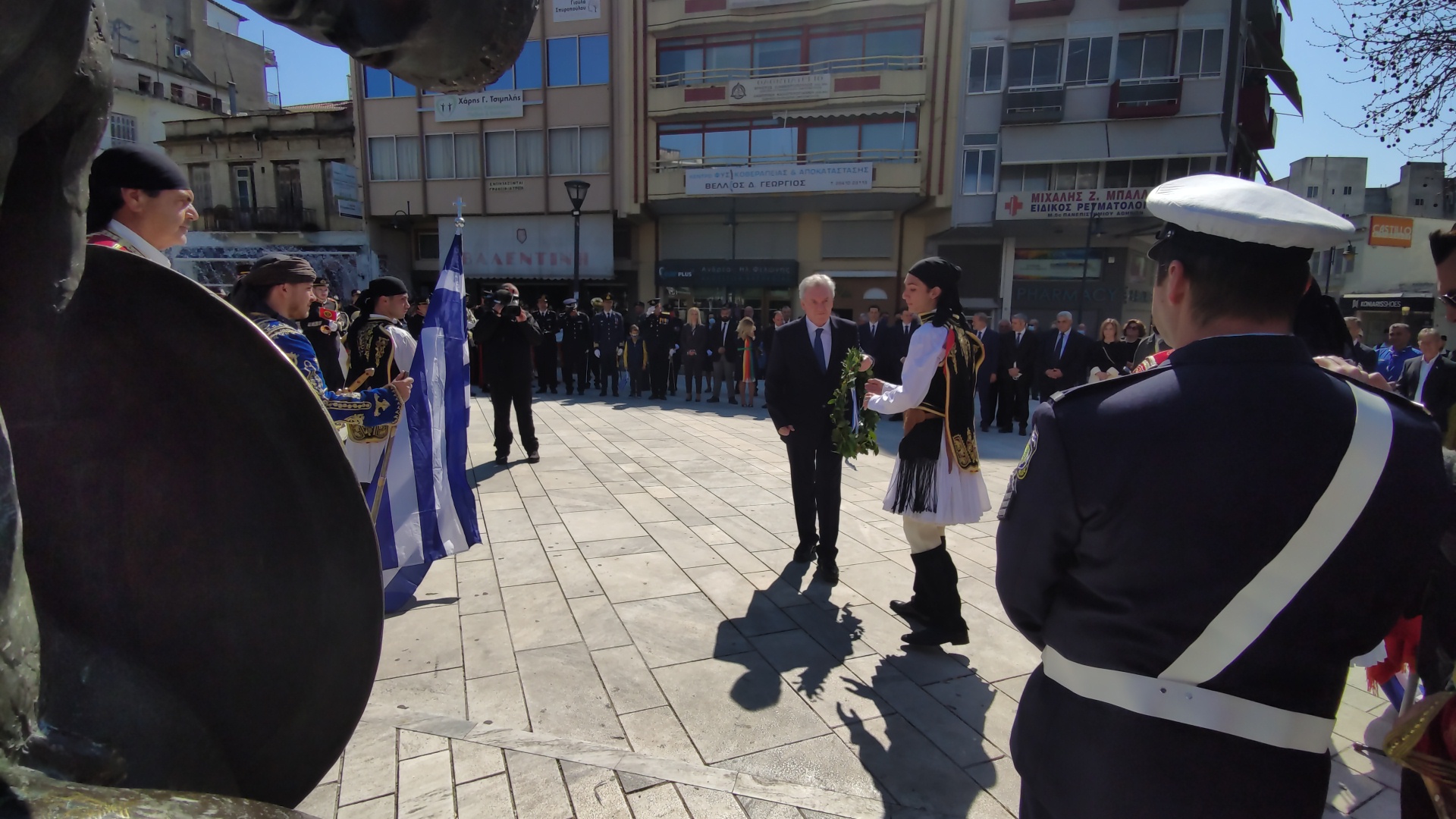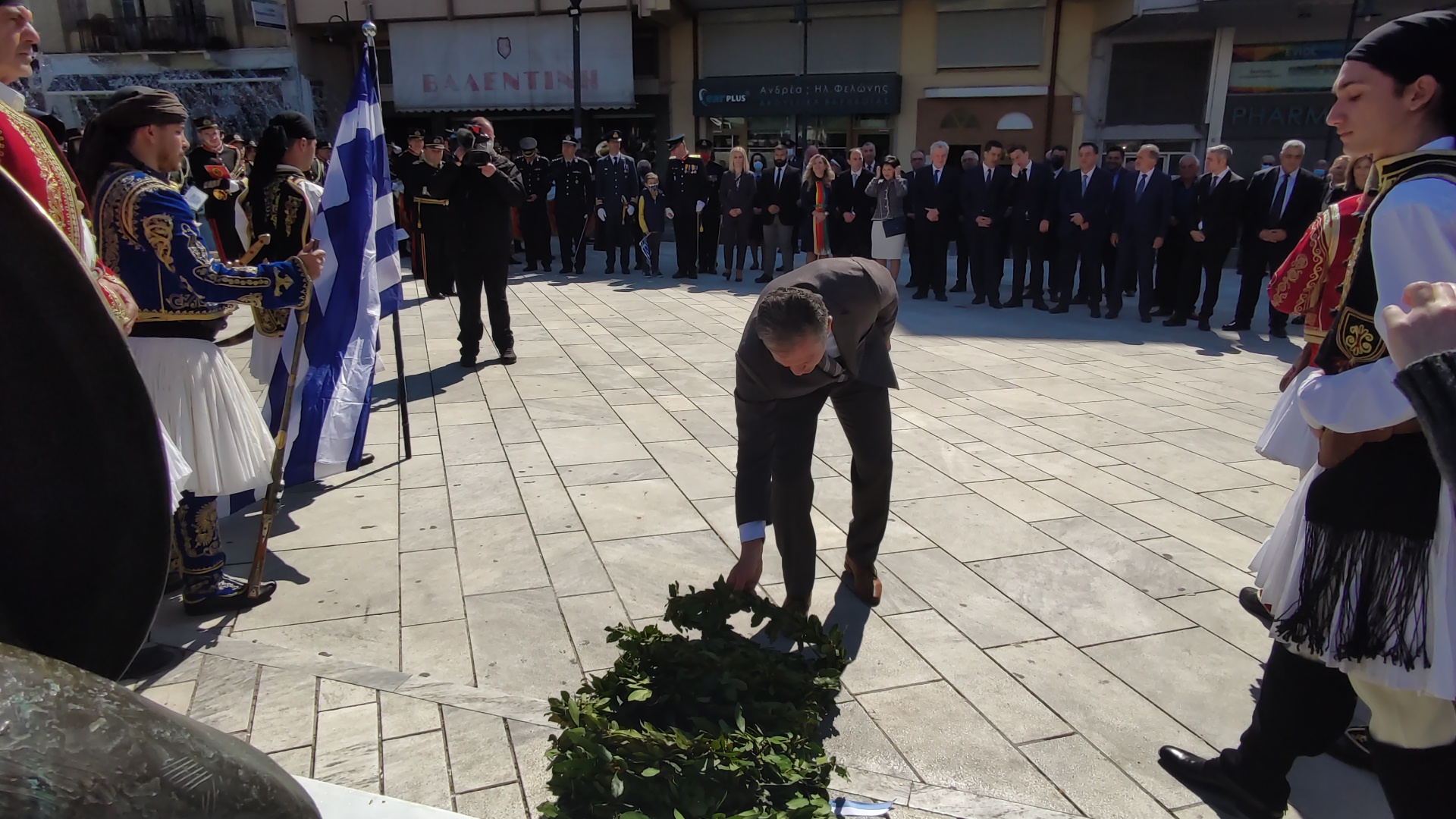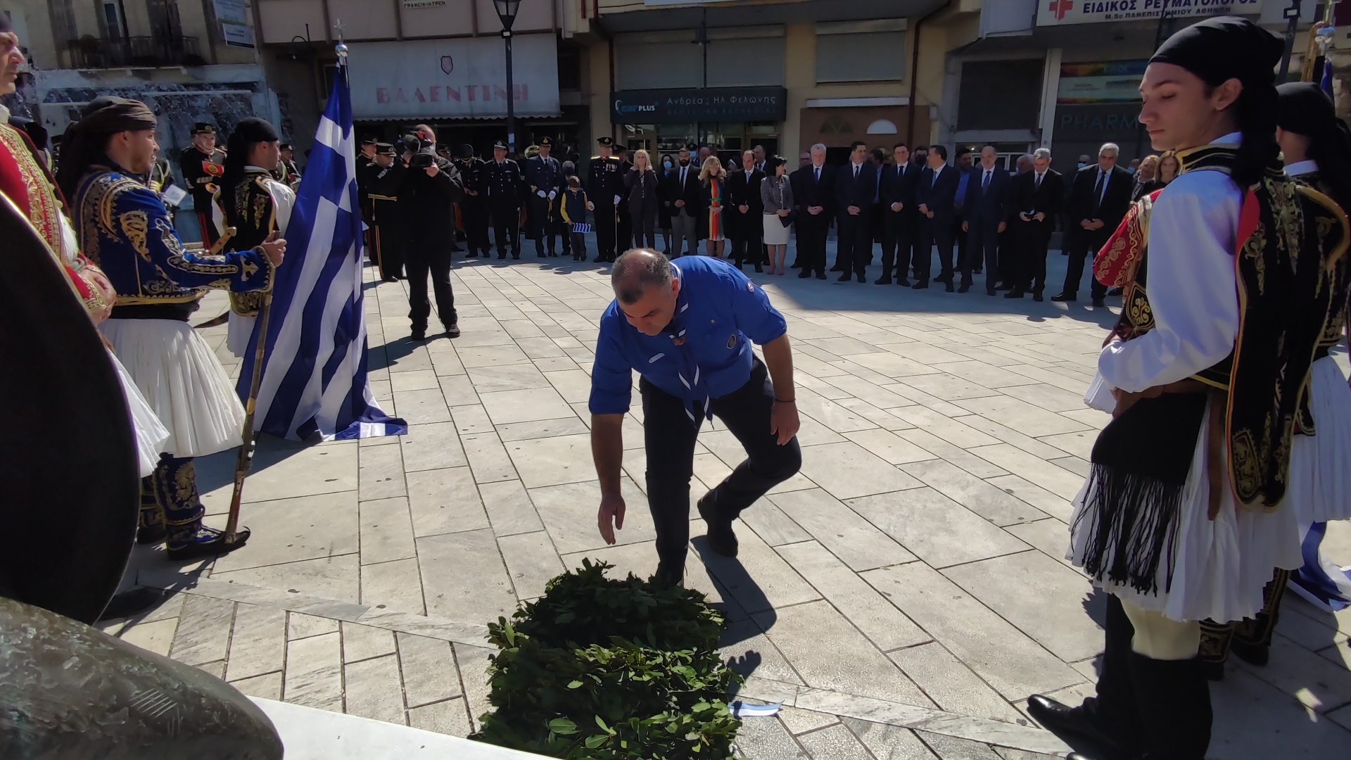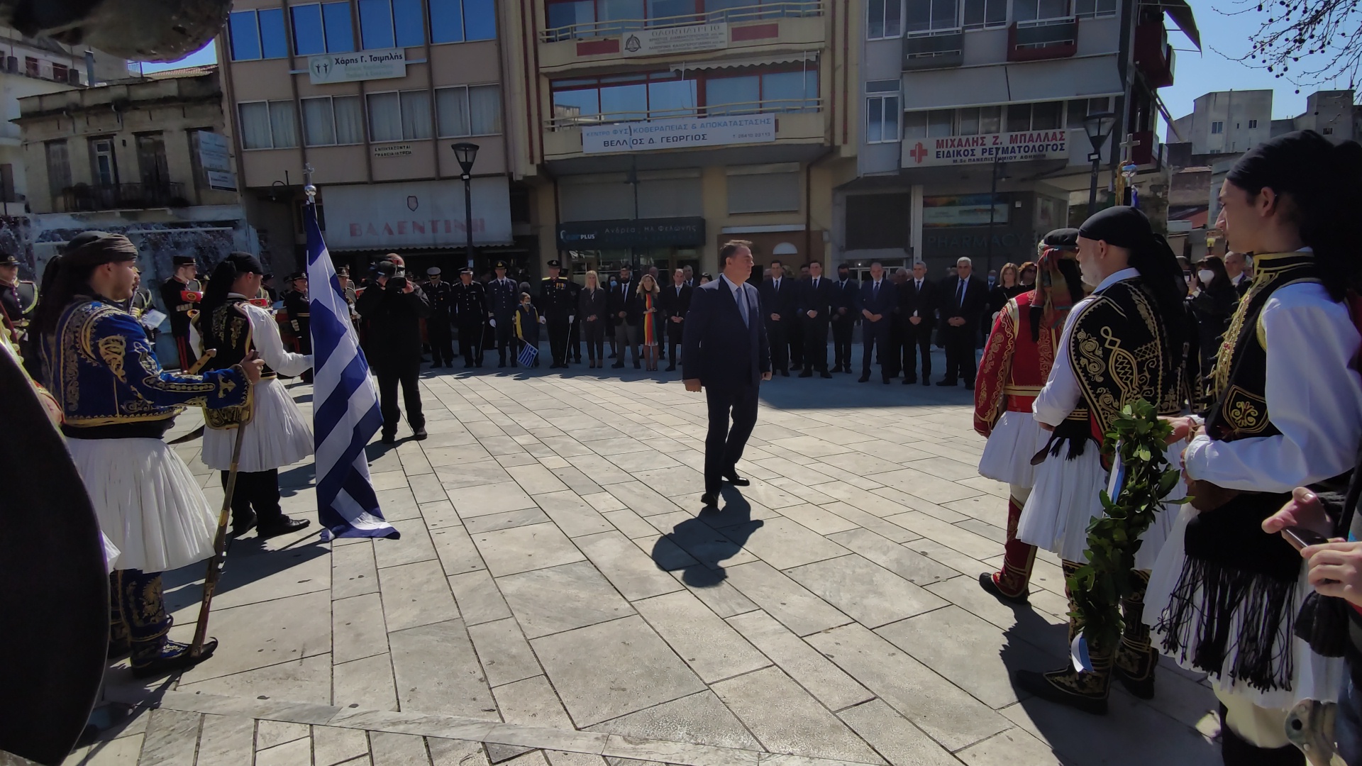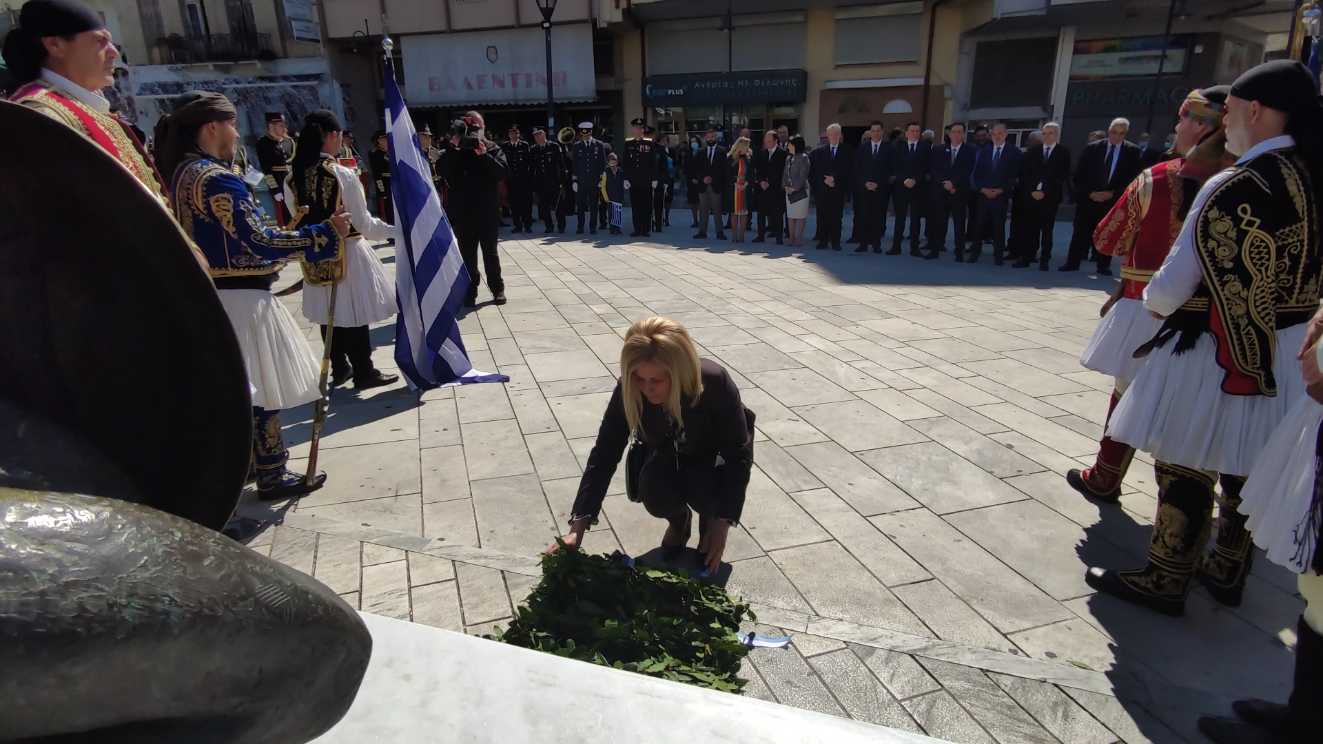Στην συνέχεια ακολούθησε επιμνημόσυνη δέηση και κατάθεση στεφάνων στο Μνημείο των Πεσόντων στην Πλατεία Μαρίας Δημάδη.