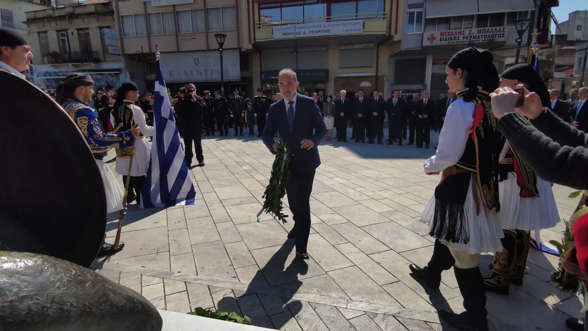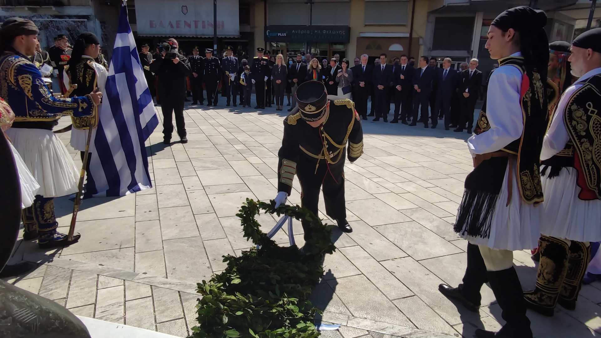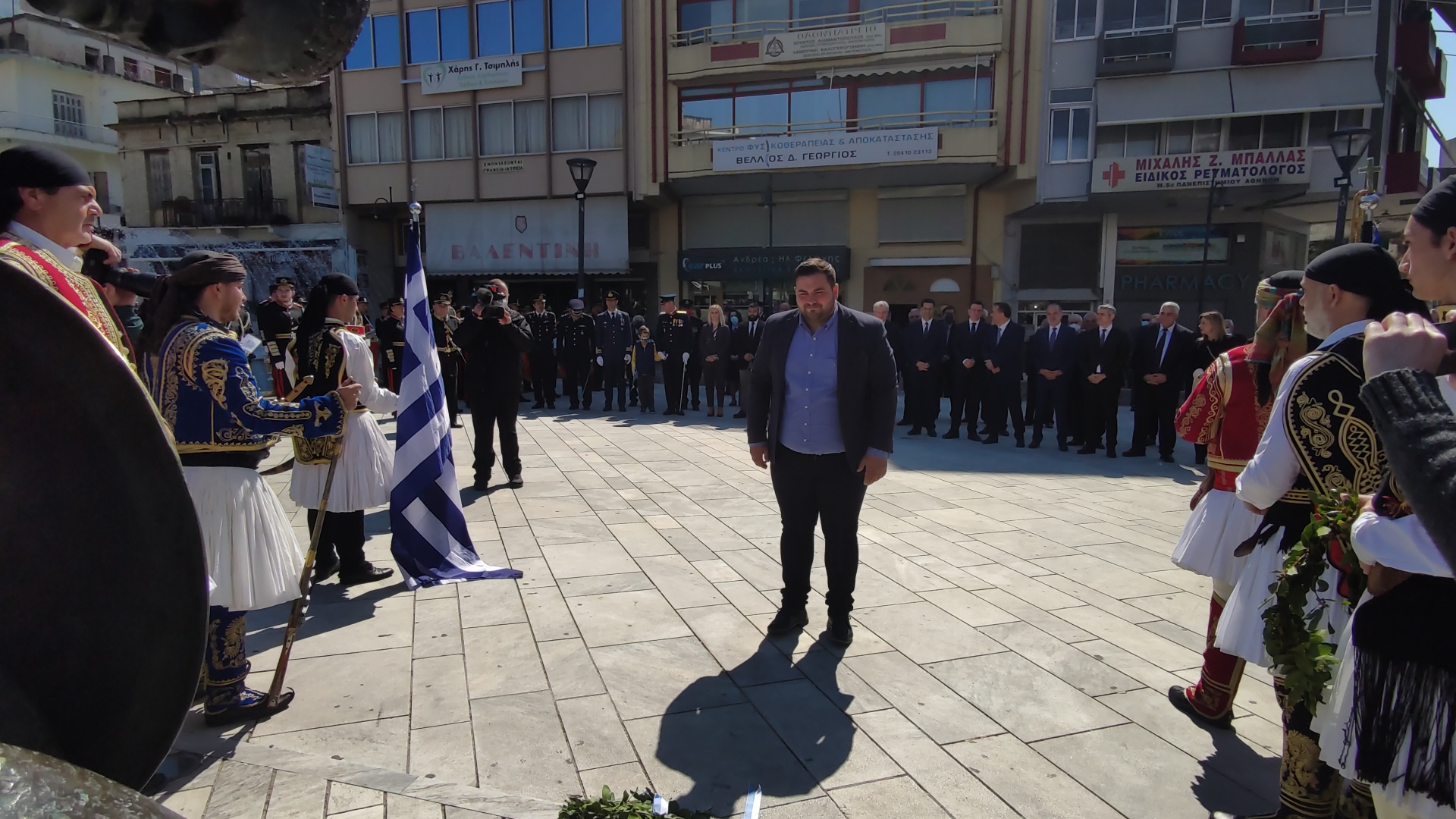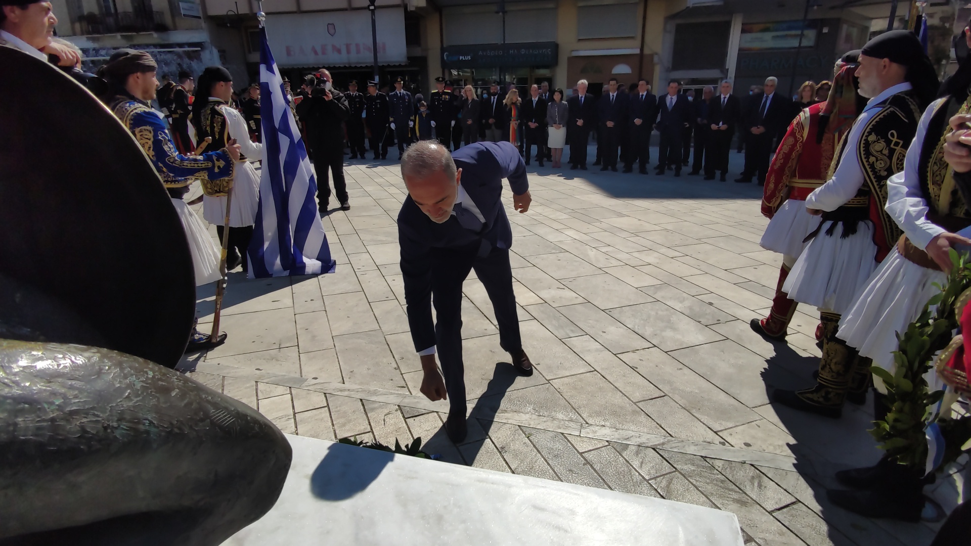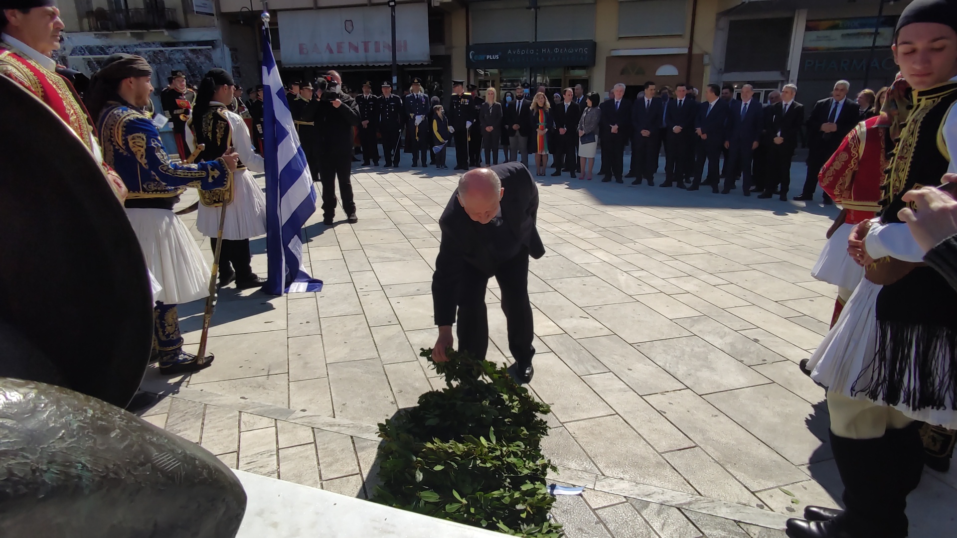 Στην συνέχεια ακολούθησε επιμνημόσυνη δέηση και κατάθεση στεφάνων στο Μνημείο των Πεσόντων στην Πλατεία Μαρίας Δημάδη.