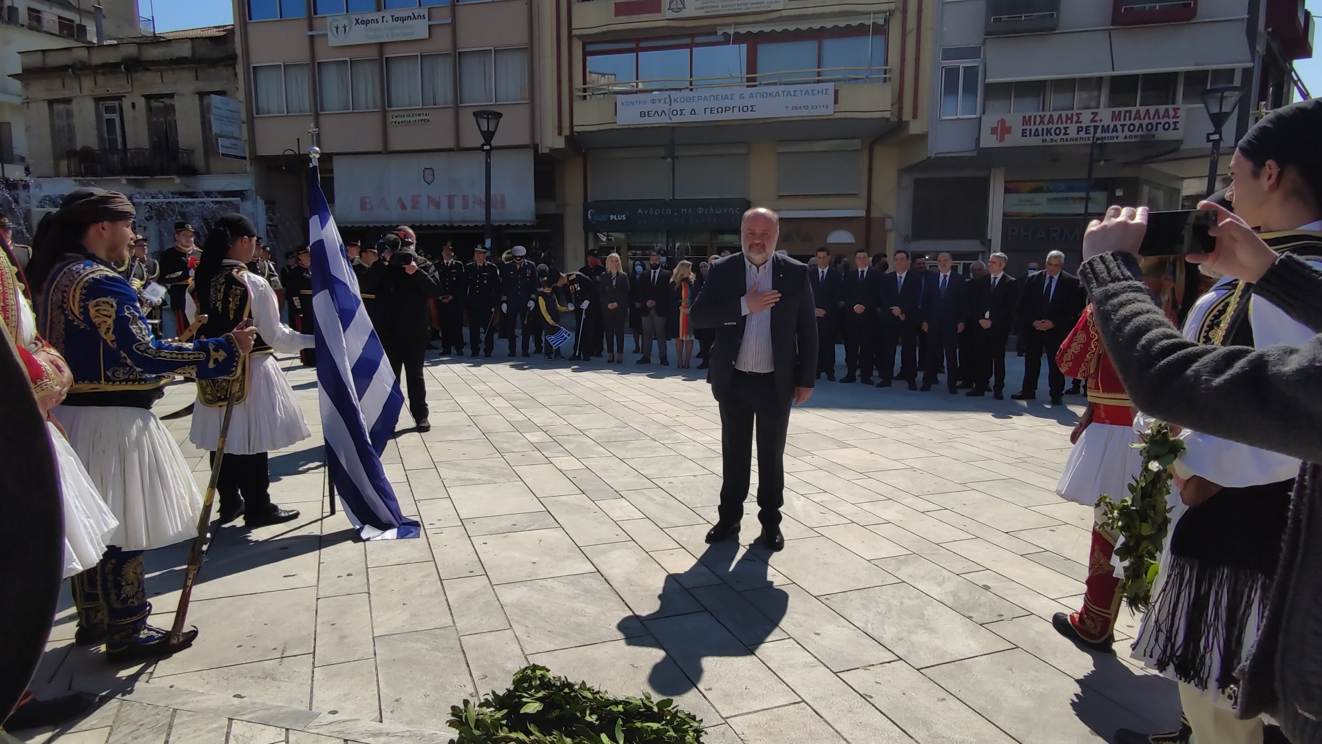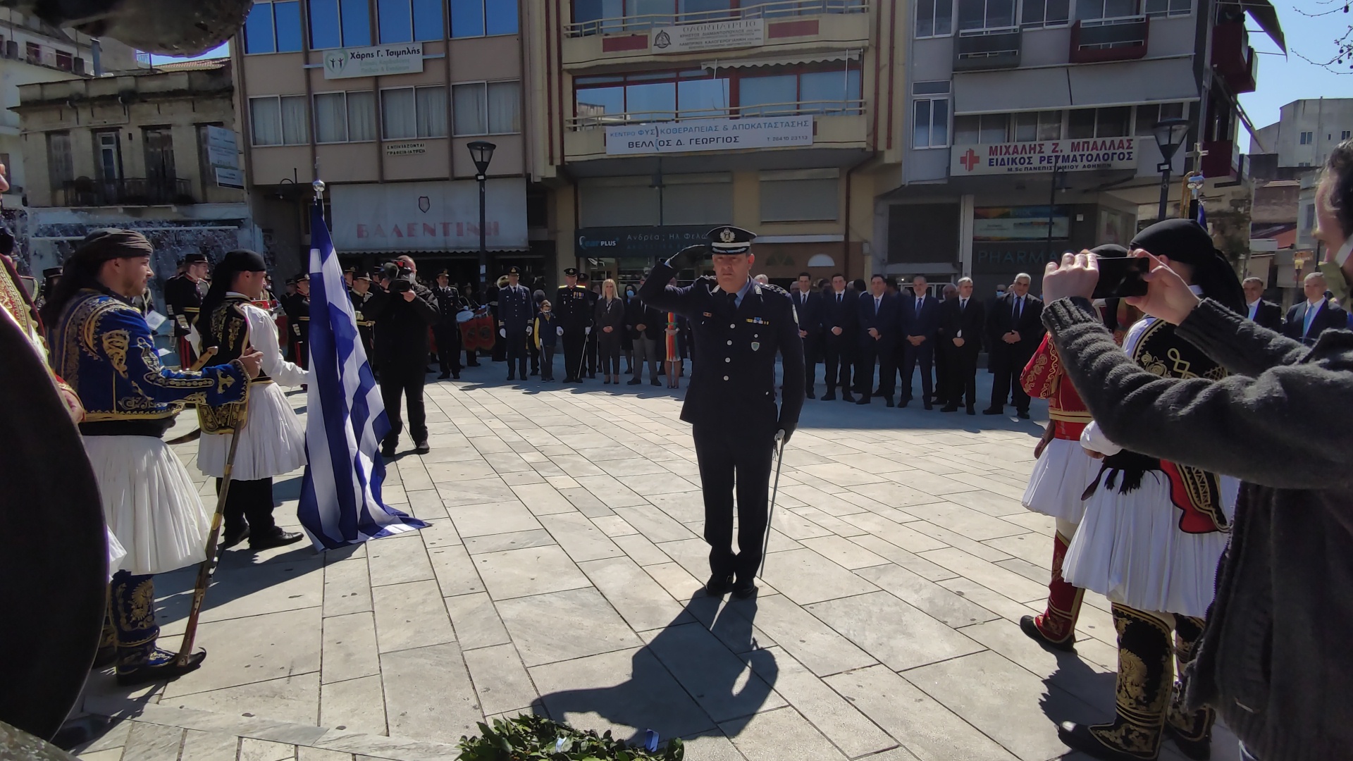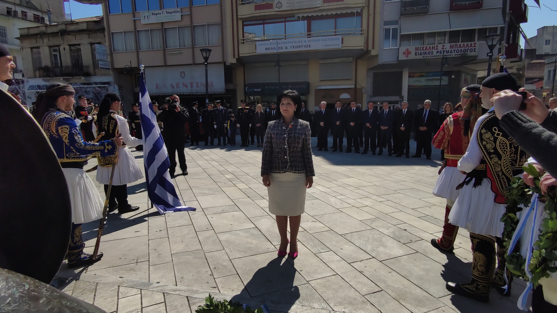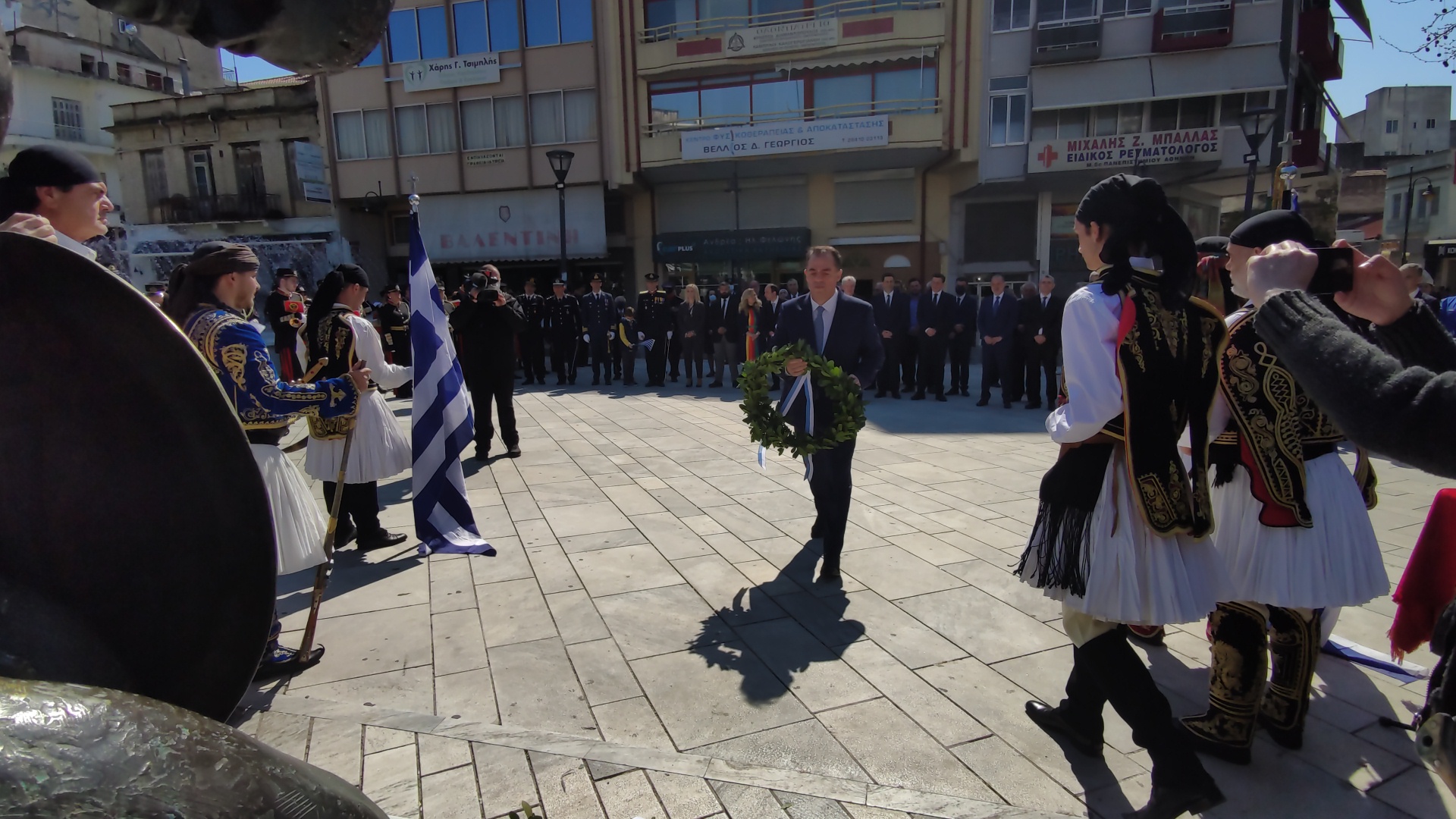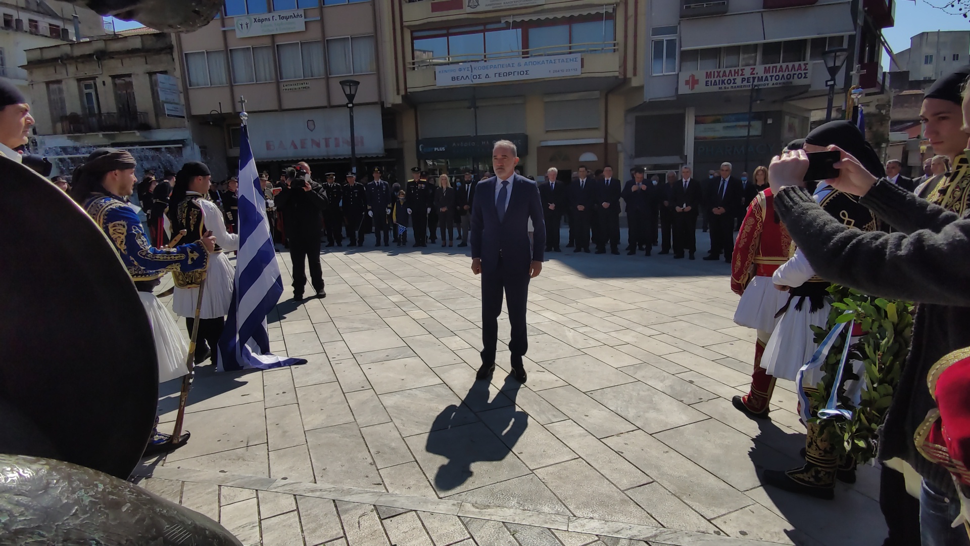 Στην συνέχεια ακολούθησε επιμνημόσυνη δέηση και κατάθεση στεφάνων στο Μνημείο των Πεσόντων στην Πλατεία Μαρίας Δημάδη.