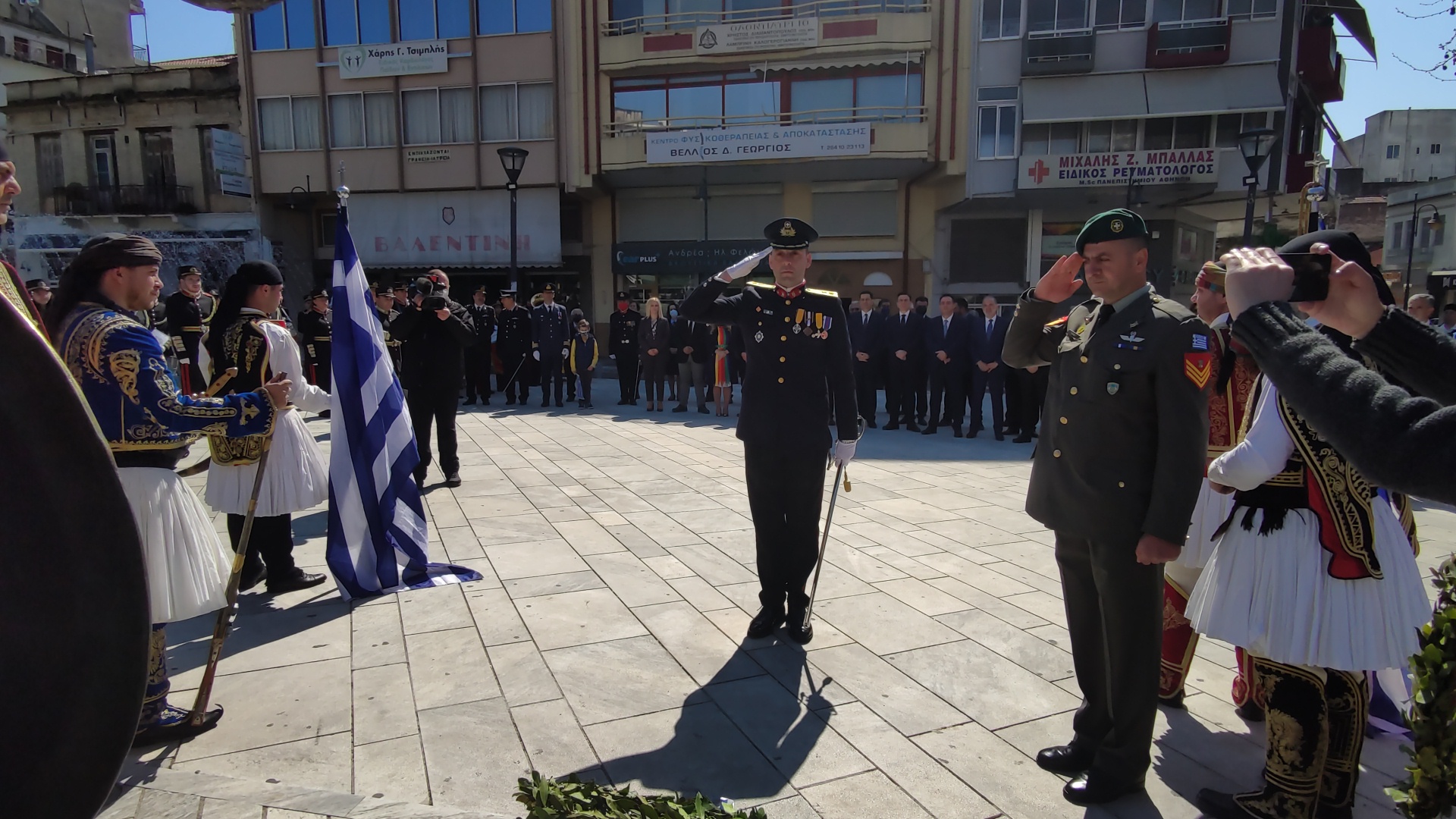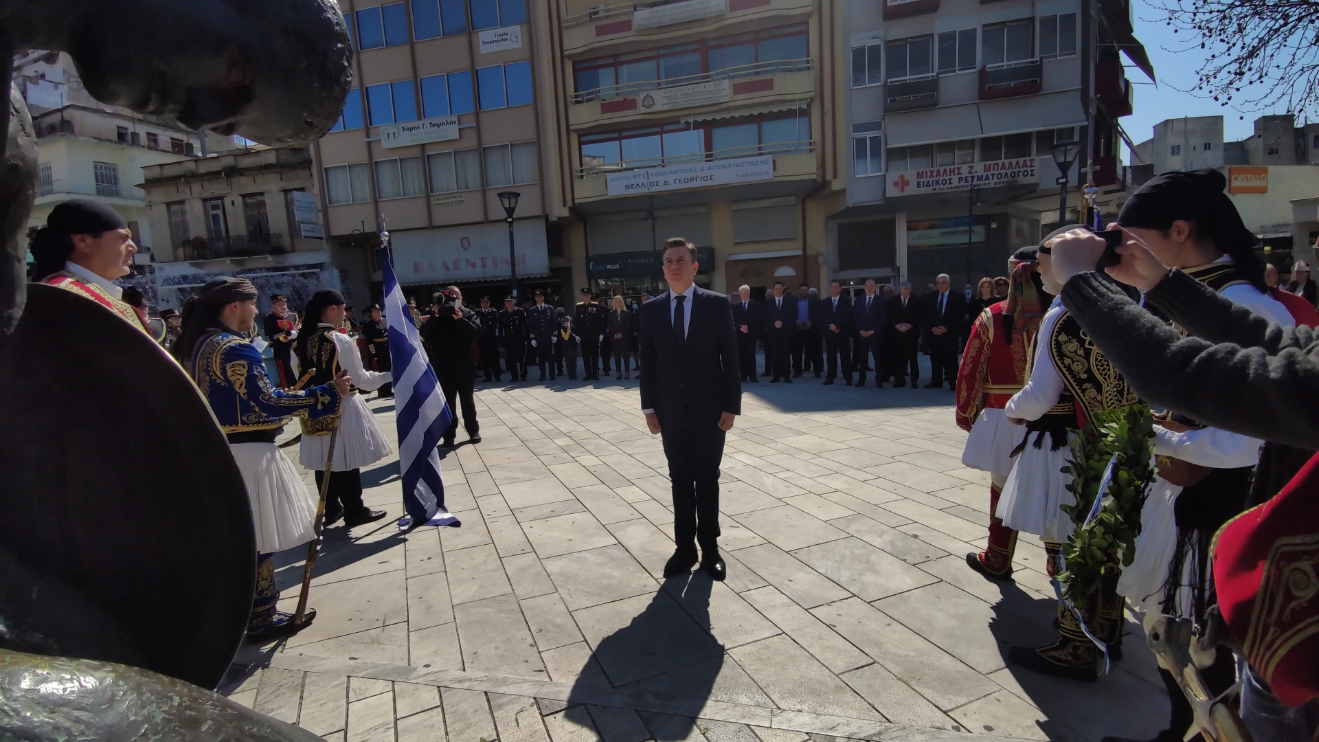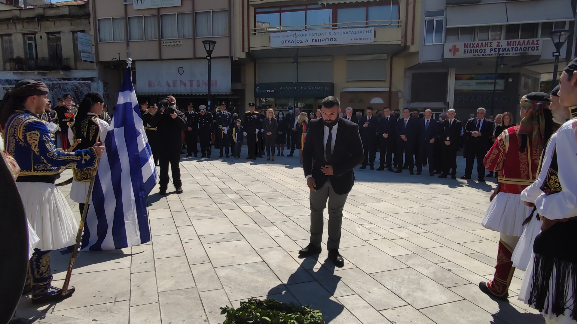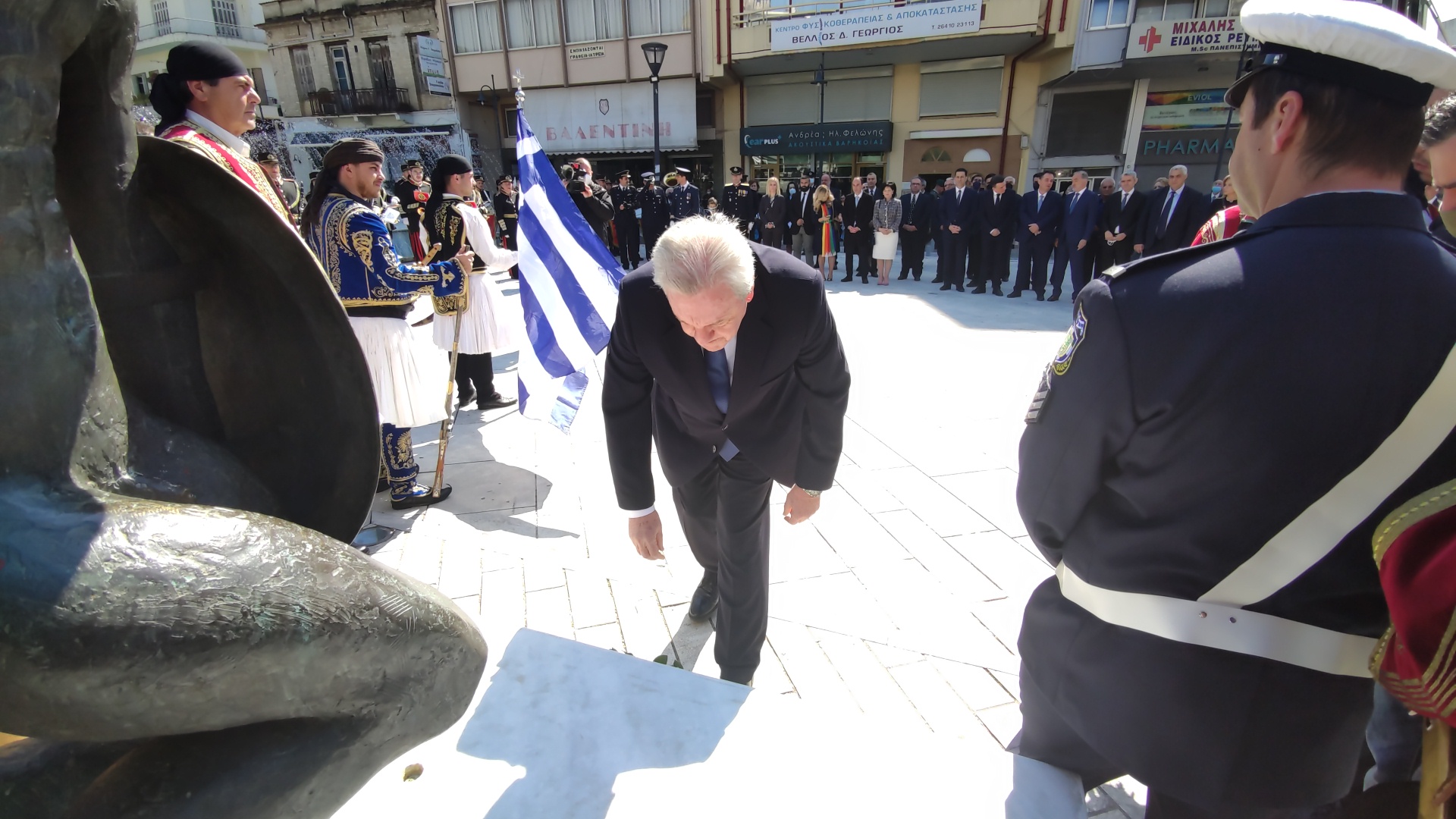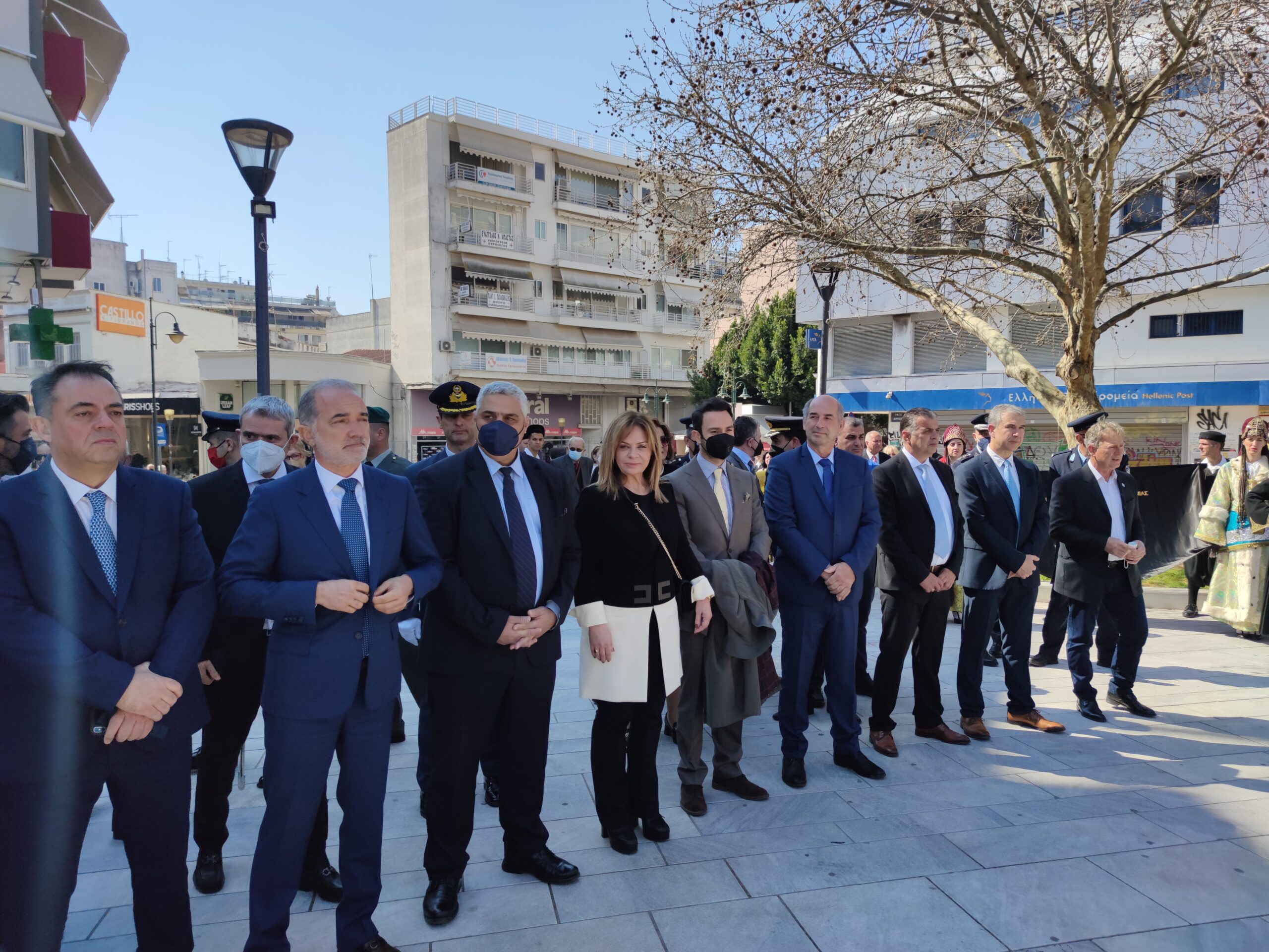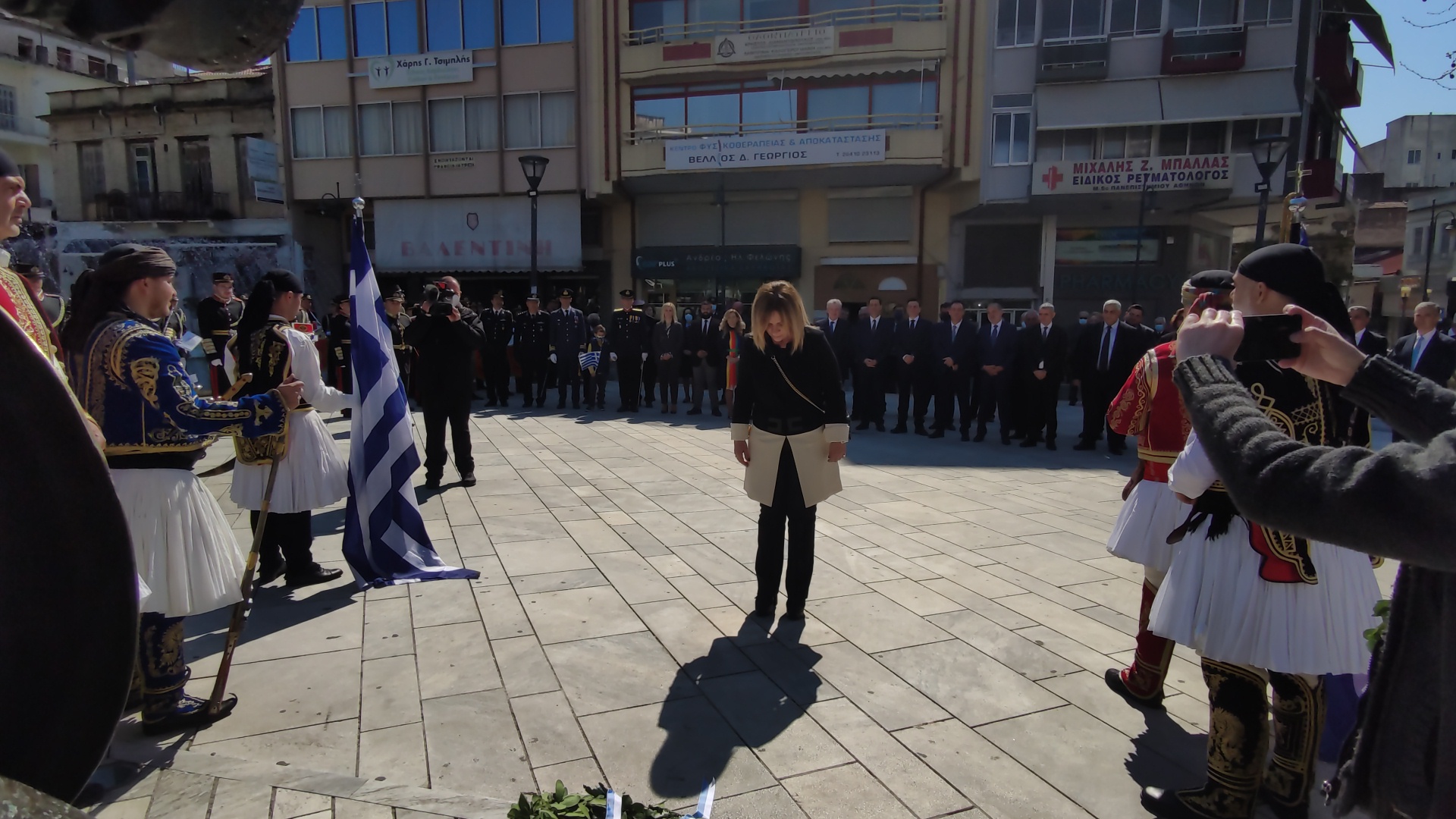 Στην συνέχεια ακολούθησε επιμνημόσυνη δέηση και κατάθεση στεφάνων στο Μνημείο των Πεσόντων στην Πλατεία Μαρίας Δημάδη.