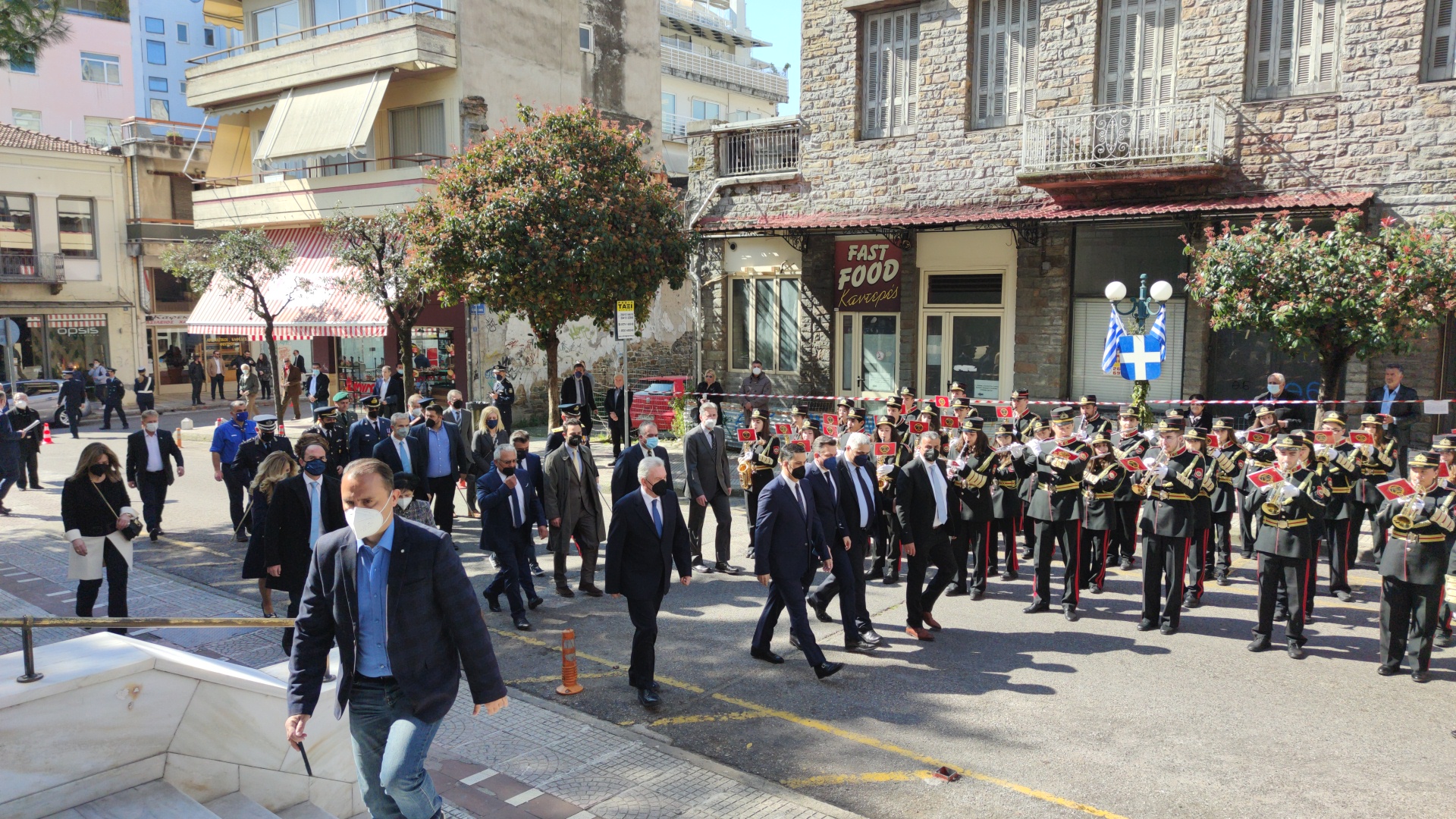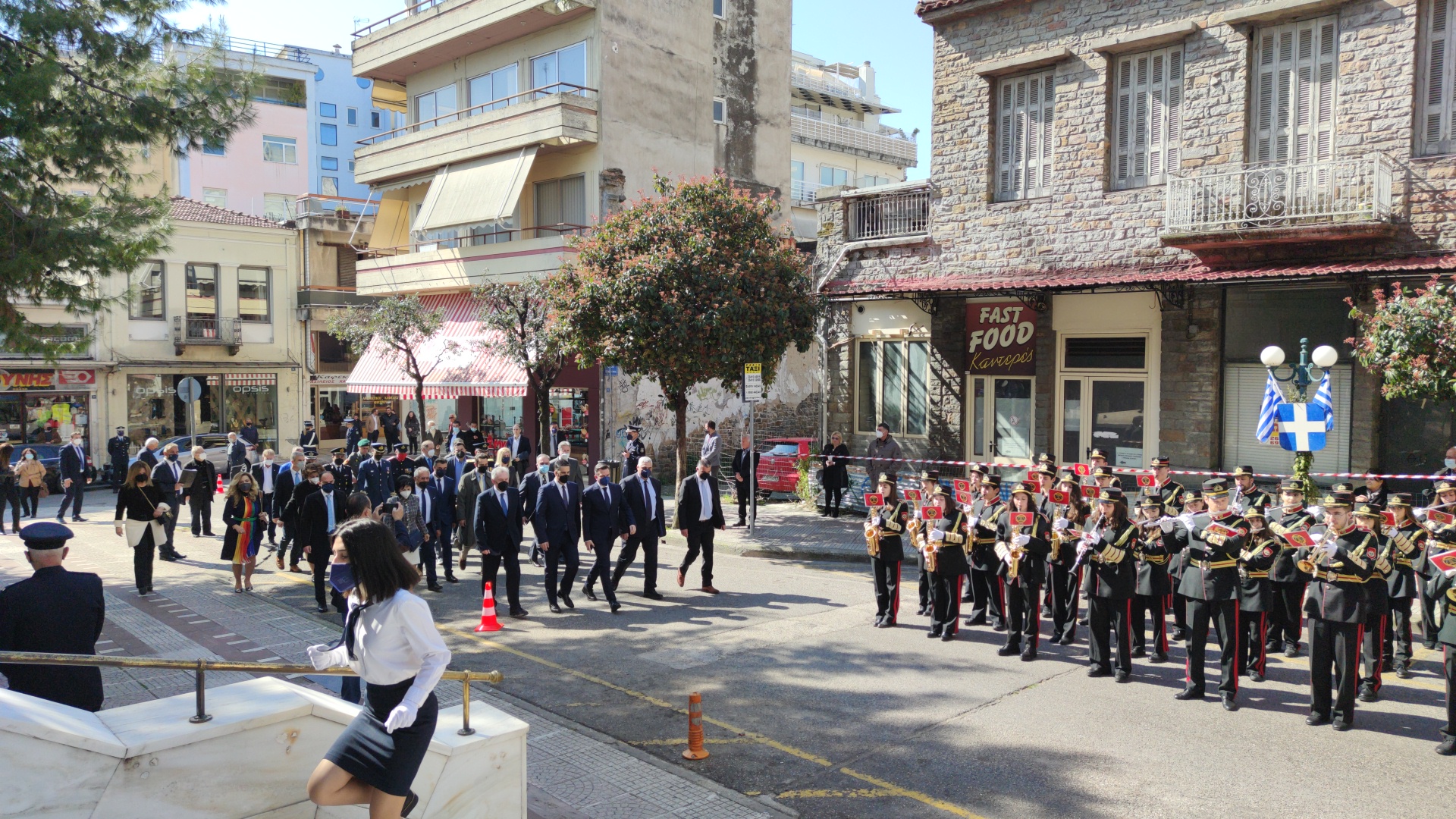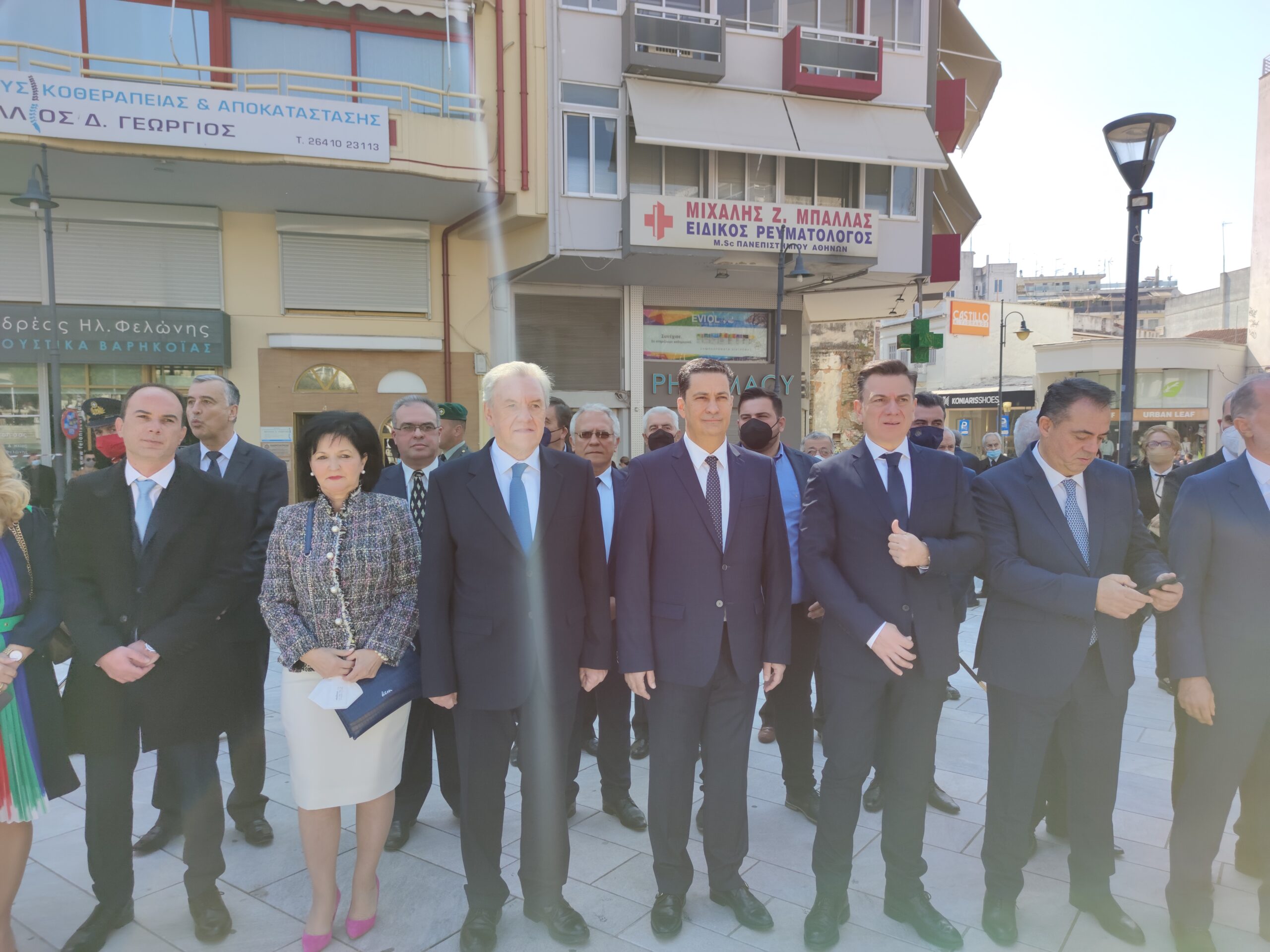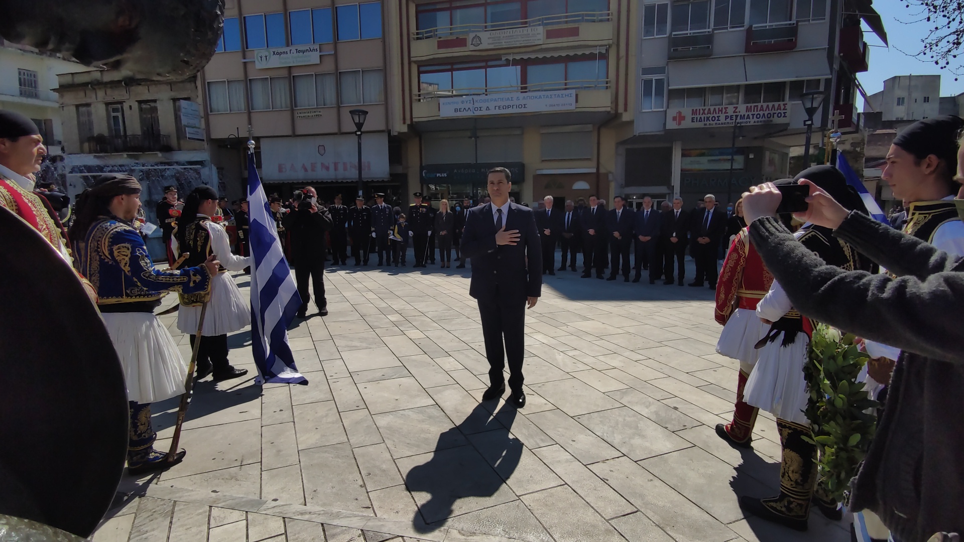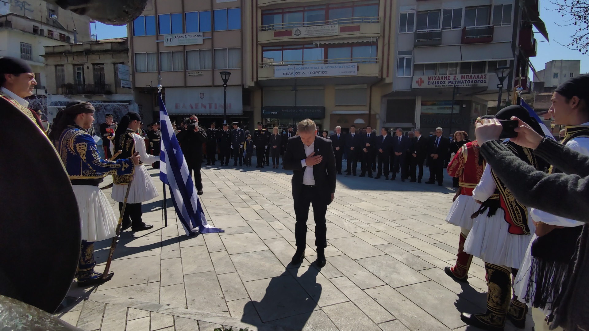 Στην συνέχεια ακολούθησε επιμνημόσυνη δέηση και κατάθεση στεφάνων στο Μνημείο των Πεσόντων στην Πλατεία Μαρίας Δημάδη.