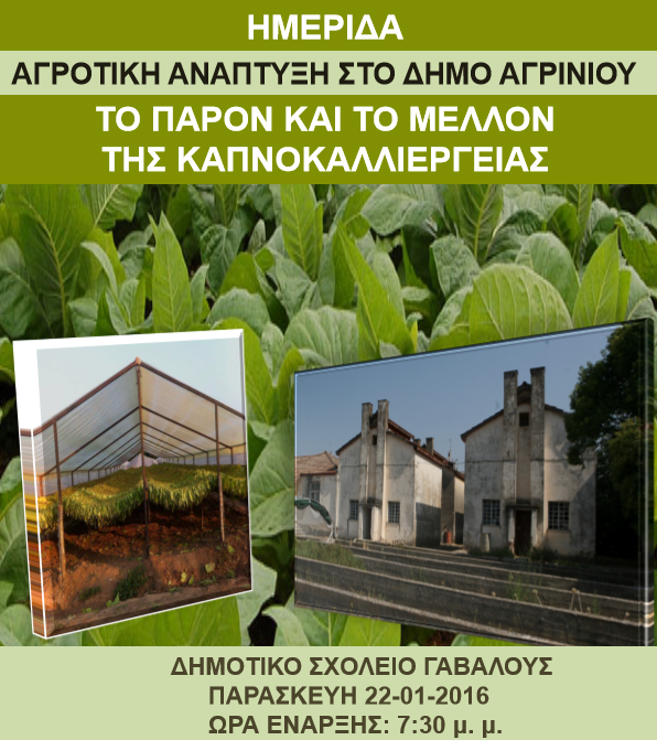 Η εκδήλωση με θέμα «Το παρόν και το μέλλον της καπνοκαλλιέργειας» θα πραγματοποιηθεί την Παρασκευή 22 Ιανουαρίου 2016 στις 7:30 το απόγευμα στο Δημοτικό Σχολείο Γαβαλούς και στοχεύει να ενημερώσει τους παραγωγούς για τις δυνατότητες καπνοκαλλιέργειας, η οποία αποτελεί μια καλή λύση για νέους αλλά και παλιούς αγρότες αφού η γνώση της καλλιεργητικής τεχνικής υπάρχει και οι κλιματολογικές συνθήκες είναι ιδανικές.