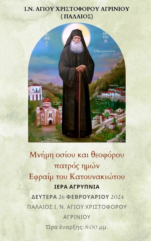 Την Δευτέρα 26 Φεβρουαρίου θα τελεστεί Ιερά Αγρυπνία στον παλαιό Ιερό Ναό του Αγίου Χριστοφόρου Αγρινίου επί τη μνήμη του οσίου και θεοφόρου πατρός ημών Εφραίμ του Κατουνακιώτου.