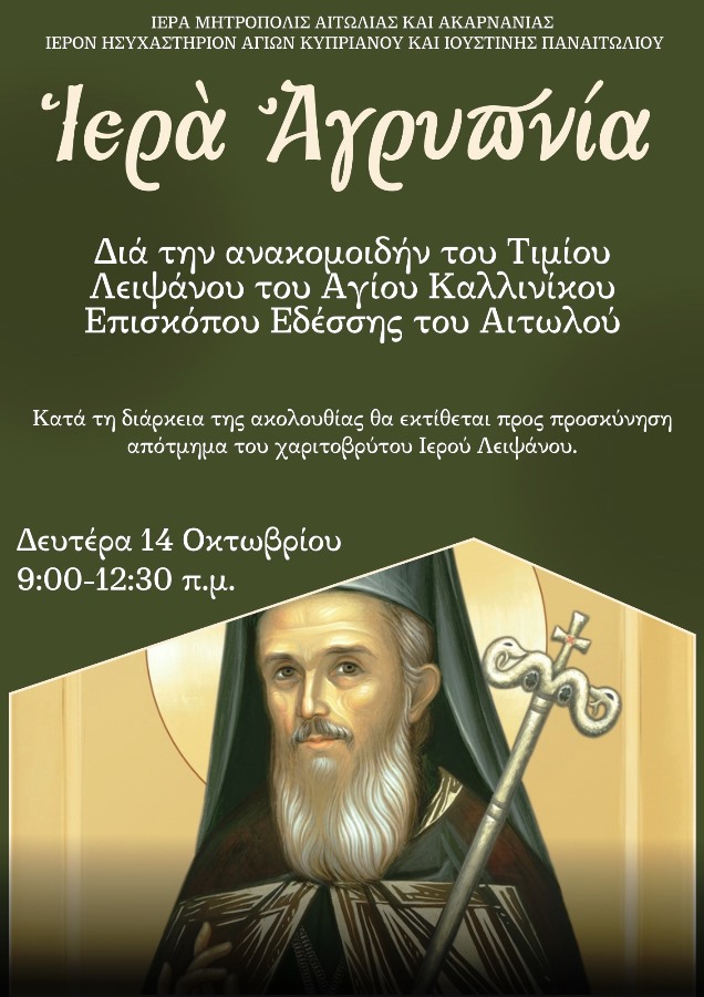 Την Δευτέρα 14/10 και ώρα 9:00-12:30 π.μ. θα τελεστεί ιερά αγρυπνία για την επέτειο ανακομιδής των λειψάνων του Αγίου Καλλινίκου Επισκόπου Εδέσσης του Αιτωλού, στο ησυχαστήριο του Αγίου Κυπριανού στο Παναιτώλιο.