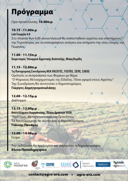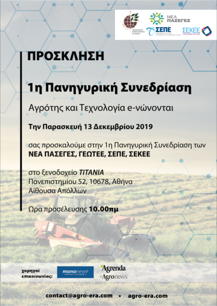 H Πανελλήνια Ομοσπονδία Αγροτικών Συνεταιρισμών & Ενώσεων Συνεργασίας Αγροτικών Συνεταιρισμών (ΝΕΑ ΠΑΣΕΓΕΣ), ο Σύνδεσμος Επιχειρήσεων Πληροφορικής & Επικοινωνιών Ελλάδας (ΣΕΠΕ) το Γεωτεχνικό Επιμελητήριο Ελλάδας (ΓΕΩΤΕΕ) και ο Σύνδεσμος Εταιρειών Κινητών Εφαρμογών Ελλάδος (ΣΕΚΕΕ) διοργανώνουν την 1η Πανηγυρική Συνεδρίαση: Αγρότης & Τεχνολογία e-νώνονται την Παρασκευή, 13 Δεκεμβρίου 2019, στο Ξενοδοχείο Τιτάνια, στην Αθήνα.