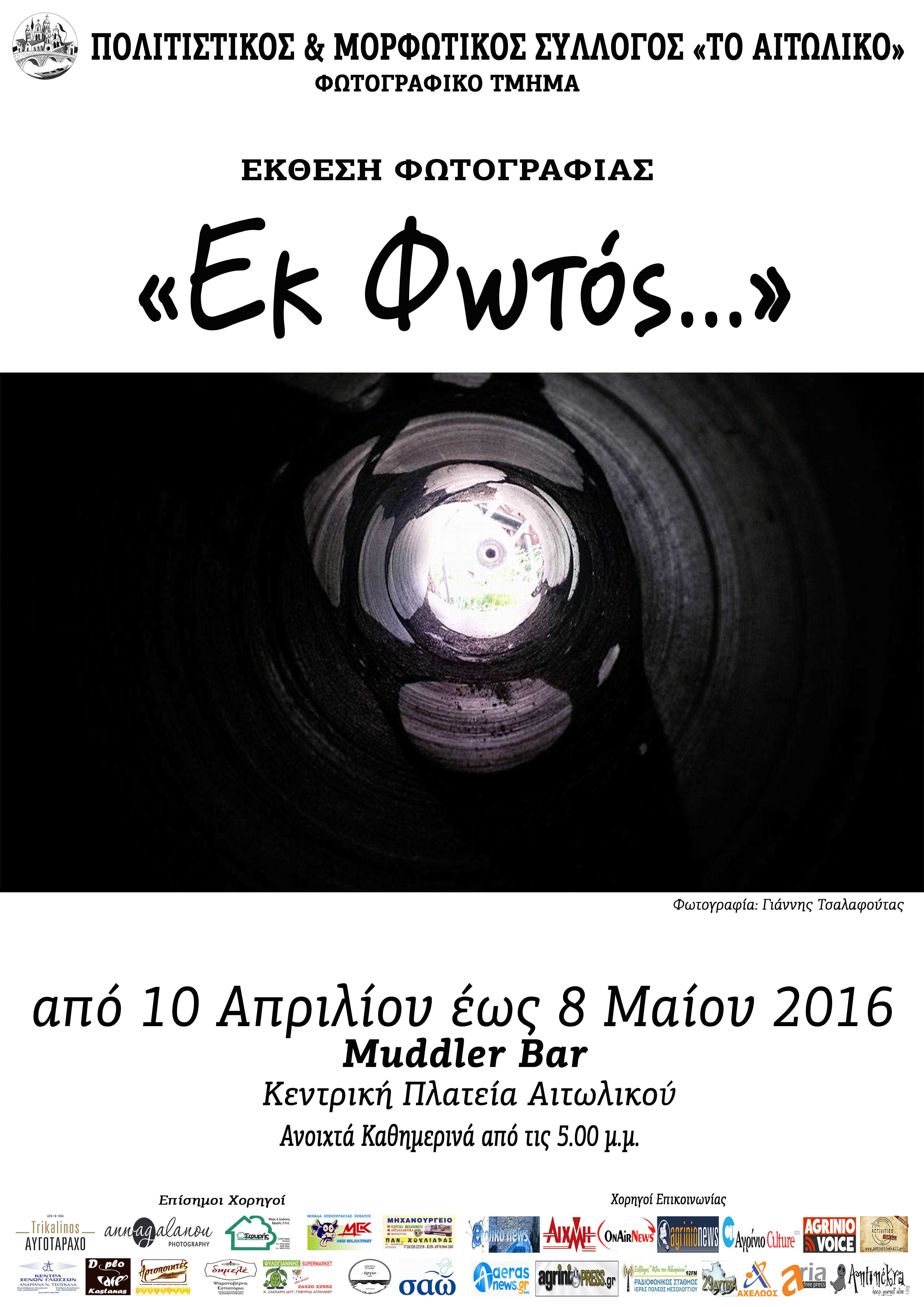 Το Φωτογραφικό Τμήμα του Πολιτιστικού & Μορφωτικού Συλλόγου “Το Αιτωλικό”, παρουσιάζει την ομαδική έκθεση φωτογραφίας με τίτλο «Εκ Φωτός» και σας προσκαλούν στα εγκαίνια της Εκθεσης που θα πραγματοποιηθούν την Κυριακή 10 Απριλίου 2016 και ώρα 8.00 μ.μ. στο Muddler Bar στην Κεντρική Πλατεία Αιτωλικού.