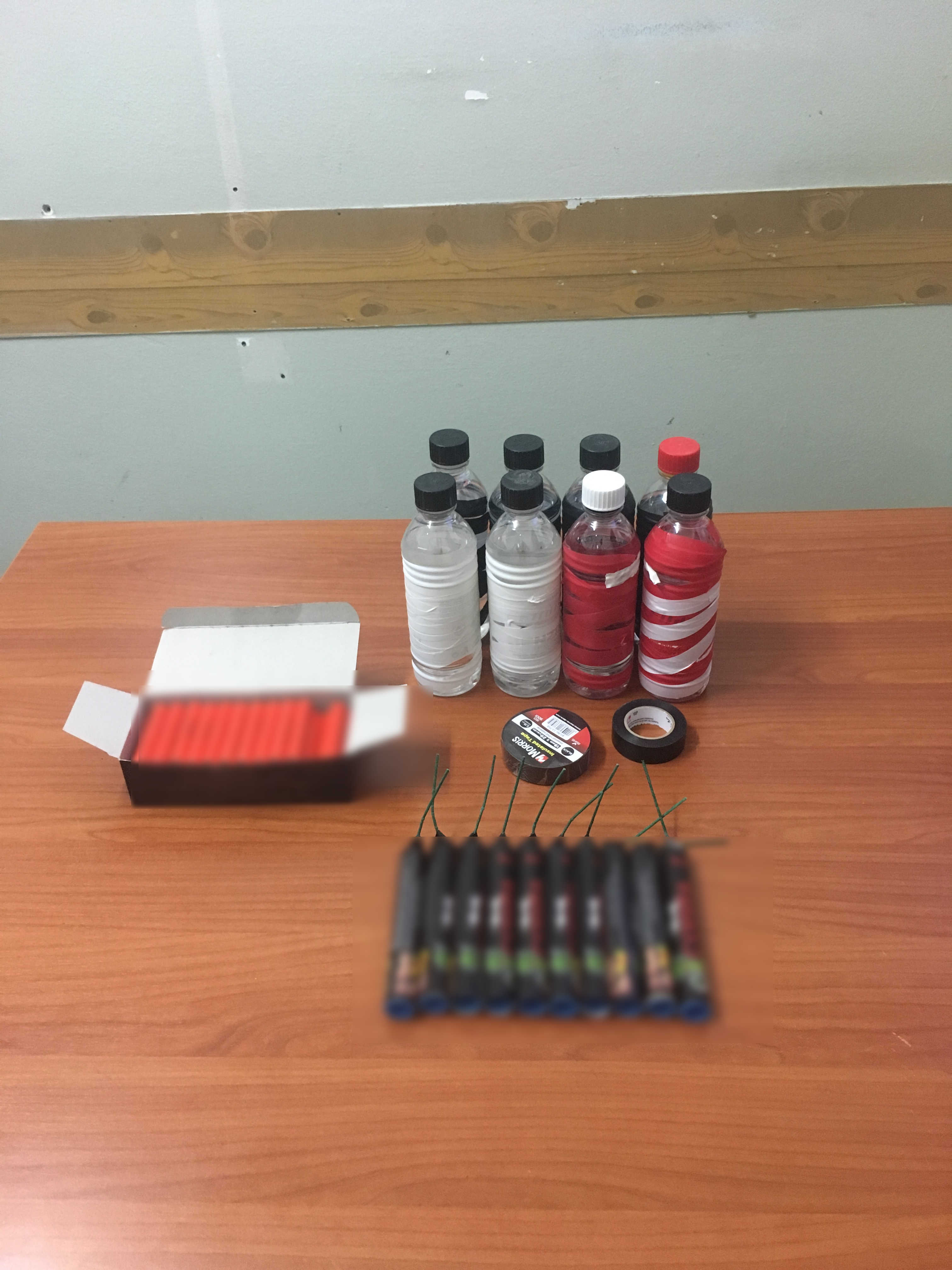 Κατασχέθηκαν πενήντα εννέα κροτίδες, οκτώ φιάλες με βενζίνη και δύο μονωτικές ταινίες.