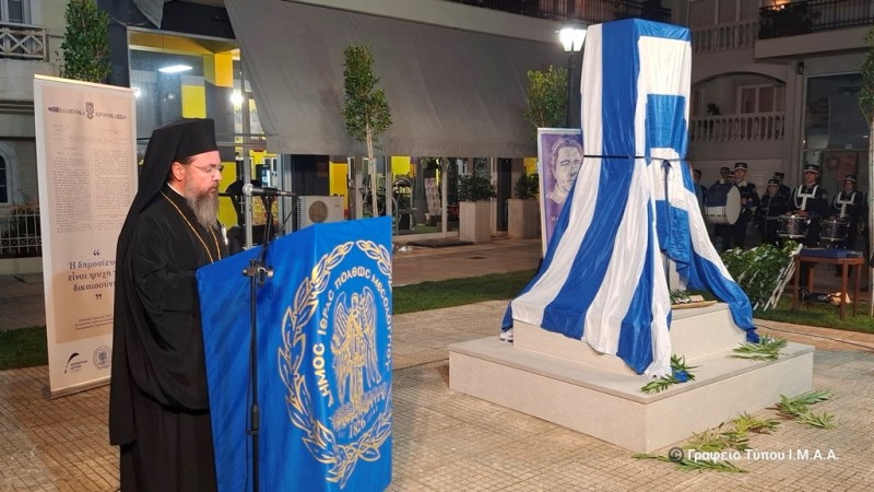 Ο Σεβασμιώτατος απηύθυνε χαιρετισμό, κατά τον οποίο αναφέρθηκε στη βαθιά πνευματική διάσταση της προσφοράς του τυπογράφου και ήρωα της Εξόδου Δημητρίου Μεσθενέα, τονίζοντας τα εξής:
