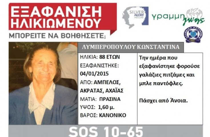 Η 88χρονη εξαφανίστηκε την Τρίτη ενώ για τον εντοπισμό της γυναίκας εκδόθηκε silver alert.