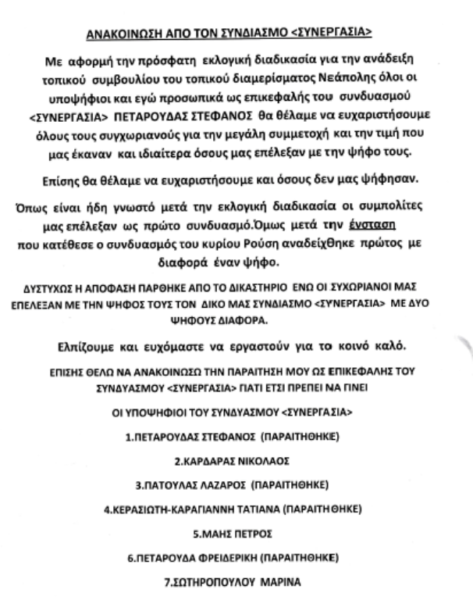 Ανακοίνωση συνδυασμού “ΣΥΝΕΡΓΑΣΙΑ” του τοπικού διαμερίσματος Νεάπολης του Δ.Αγρινίου