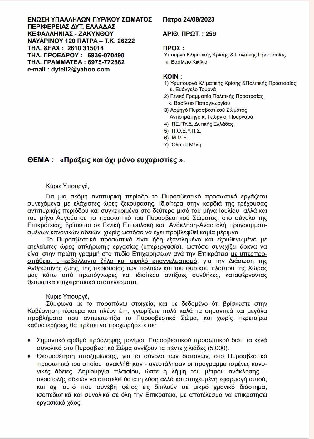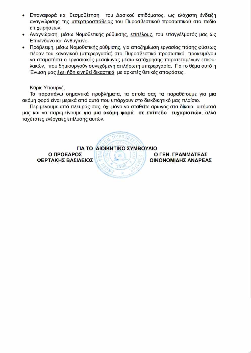 Το Πυροσβεστικό προσωπικό είναι ήδη εξαντλημένο και εξουθενωμένο με ατελείωτες ώρες απλήρωτης εργασίας (υπερεργασία), ωστόσο συνεχίζει άοκνα να είναι στην πρώτη γραμμή στο πεδίο Επιχειρήσεων ανά την Επικράτεια με υπερπρο- σπάθεια, υπερβάλλοντα ζήλο και υψηλό επαγγελματισμό, για την Διάσωση της Ανθρώπινης ζωής, της περιουσίας των πολιτών και του φυσικού πλούτου της Χώρας μας κάτω από πρωτόγνωρες και ιδιαίτερα αντίξοες συνθήκες, καταφέρνοντας θεαματικά επιχειρησιακά αποτελέσματα.