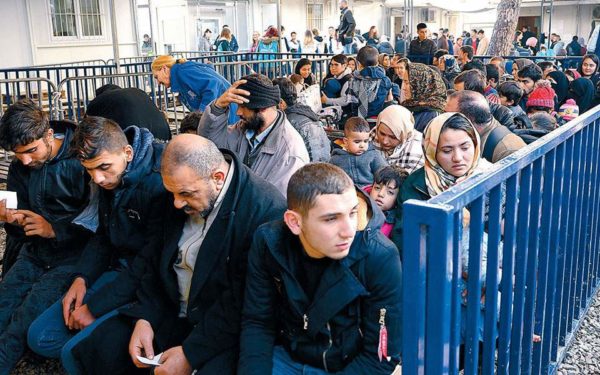 Νεοαφιχθέντες πρόσφυγες και μετανάστες περιμένουν να εξεταστούν από τους αρμοδίους στο ΚΥΤ της Μόριας.