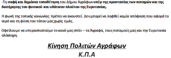 Η Κίνηση Πολιτών Αγράφων αποστέλλει την ακόλουθη Ανοιχτή Επιστολή προς την Πρόεδρο του Δημοτικού Συμβουλίου Αγράφων, σχετικά με το κυβερνητικό σχέδιο «Εύρυτος» που αφορά τη μερική εκτροπή των ποταμών Καρπενησιώτη και Κρικελοπόταμου για την ύδρευση της Αθήνας.