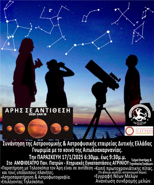 Η Αστρονομική και Αστροφυσική Εταιρεία Δυτικής Ελλάδας -“Ηρακλής” προσκαλεί το κοινό της Αιτωλοακαρνανίας στη πρώτη συγκέντρωσή της για το 2025.