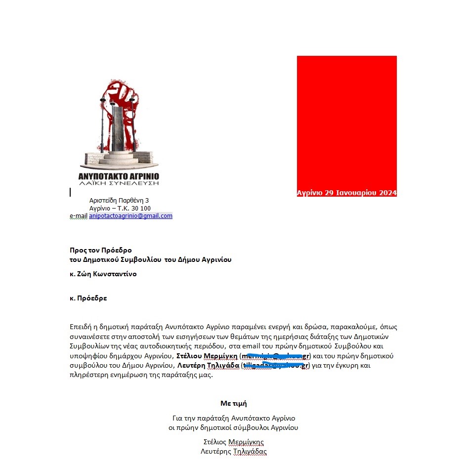 Πριν από ένα μήνα περίπου, το «Ανυπότακτο Αγρίνιο», το οποίο συμμετείχε για τρίτη φορά τα τελευταία δέκα χρόνια στην εκλογική διαδικασία του περασμένου Οκτωβρίου, παίρνοντας στη δημοτική ενότητα Αγρινίου ποσοστό 3.33% και συνολικά στο Δήμο την ψήφο 1.048 συνδημοτών μας, κατέθεσε στο προεδρείο του Δημοτικού Συμβουλίου μία πρόταση και ένα αίτημα, τα οποία και επισυνάπτουμε.