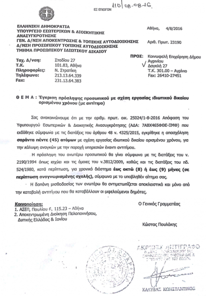 Σας παραθέτουμε το σχετικό έγγραφο του Υπουργείου Εσωτερικών και Διοικητικής Ανασυγκρότησης, απ’ το οποίο προκύπτει σαφώς ποιος «έδωσε εντολή για είσπραξη διδάκτρων ή αλλιώς κλείσιμο του τμήματος που δεν θα μας φέρνει χρήμα».