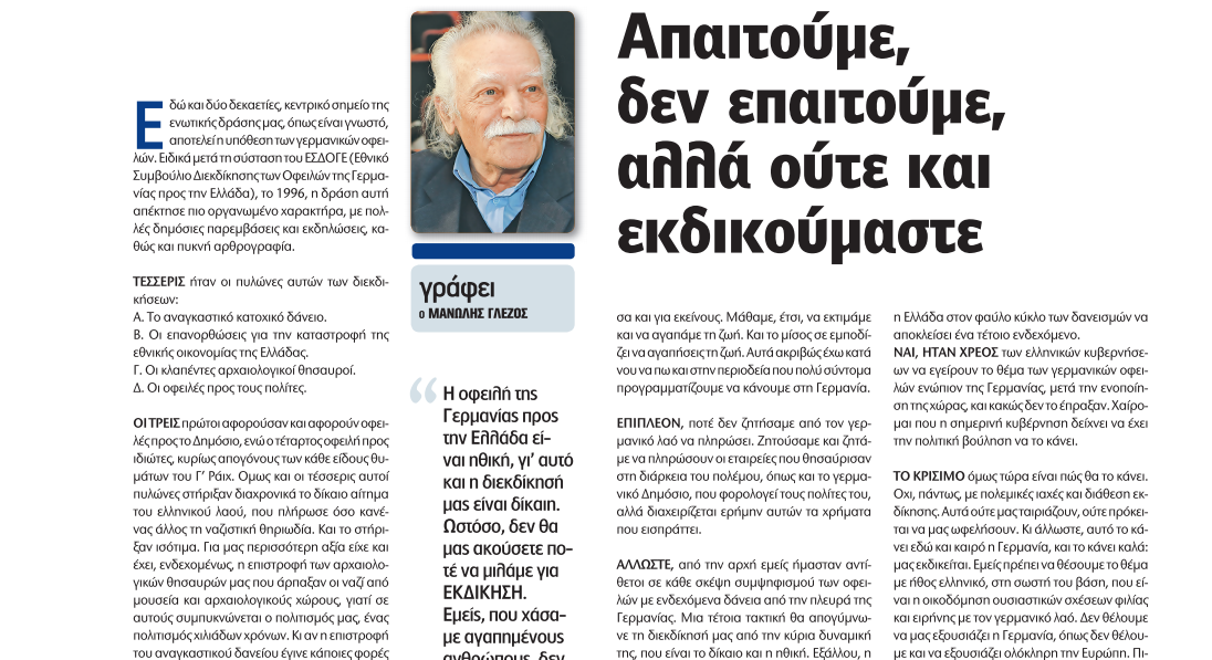 Εδώ και δύο δεκαετίες, κεντρικό σημείο της ενωτικής δράσης μας, όπως είναι γνωστό, αποτελεί η υπόθεση των γερμανικών οφειλών. Ειδικά μετά τη σύσταση του ΕΣΔΟΓΕ (Εθνικό Συμβούλιο Διεκδίκησης των Οφειλών της Γερμανίας προς την Ελλάδα), το 1996, η δράση αυτή απέκτησε πιο οργανωμένο χαρακτήρα, με πολλές δημόσιες παρεμβάσεις και εκδηλώσεις, καθώς και πυκνή αρθρογραφία.