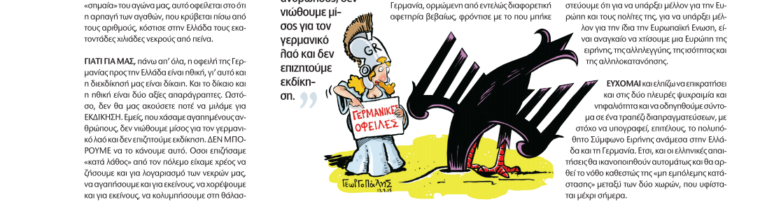 ΟΙ ΤΡΕΙΣ πρώτοι αφορούσαν και αφορούν οφειλές προς το Δημόσιο, ενώ ο τέταρτος οφειλή προς ιδιώτες, κυρίως απογόνους των κάθε είδους θυμάτων του Γ΄ Ράιχ. Όμως και οι τέσσερις αυτοί πυλώνες στήριξαν διαχρονικά το δίκαιο αίτημα του ελληνικού λαού, που πλήρωσε όσο κανένας άλλος τη ναζιστική θηριωδία. Και το στήριξαν ισότιμα. Για μας περισσότερη αξία είχε και έχει, ενδεχομένως, η επιστροφή των αρχαιολογικών θησαυρών μας που άρπαξαν οι ναζί από μουσεία και αρχαιολογικούς χώρους, γιατί σε αυτούς συμπυκνώνεται ο πολιτισμός μας, ένας πολιτισμός χιλιάδων χρόνων. Κι αν η επιστροφή του αναγκαστικού δανείου έγινε κάποιες φορές «σημαία» του αγώνα μας, αυτό οφείλεται στο ότι η αρπαγή των αγαθών, που κρύβεται πίσω από τους αριθμούς, κόστισε στην Ελλάδα τους εκατοντάδες χιλιάδες νεκρούς από πείνα.