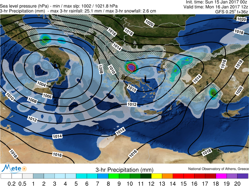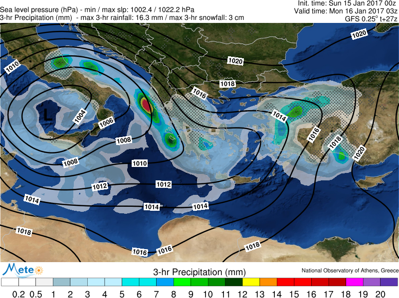 Οι παρακάτω χάρτες δίνουν την κατανομή της πίεσης και του υετού (βροχοπτώσεις και χιονοπτώσεις) τη νύχτα της Κυριακής 15/01 και το μεσημέρι της Δευτέρας 16/01.