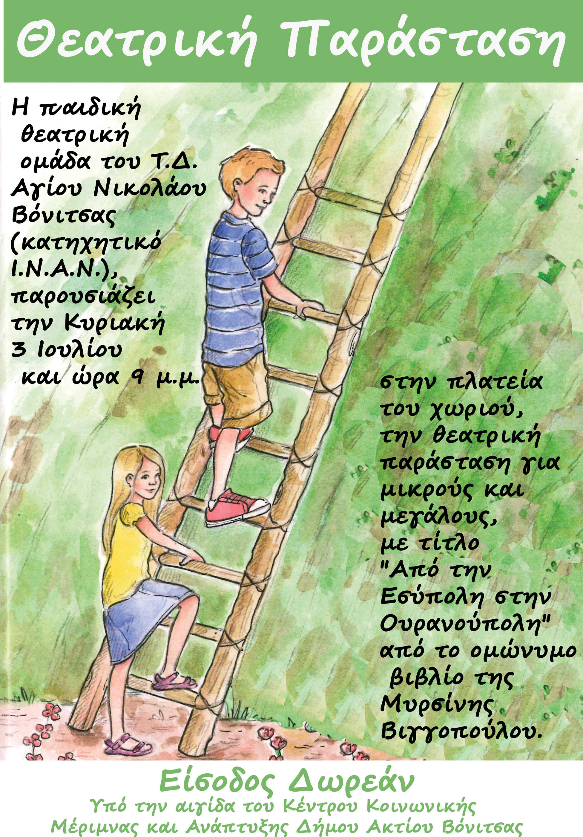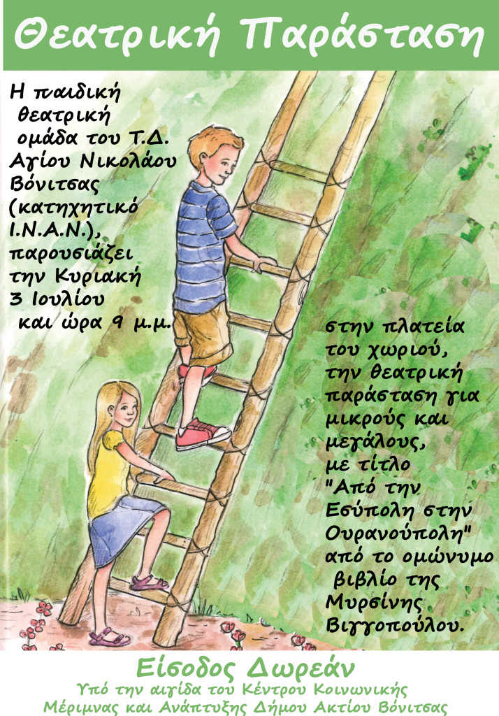 Η παιδική θεατρική ομάδα του Αγίου Νικολάου Βόνιτσας (κατηχητικό Ι.Ν.Α.Ν.) θα παρουσιάσει την Κυριακή 3 Ιουλίου 2016 και ώρα 21:00 στον Άγιο Νικόλαο την θεατρική παράσταση