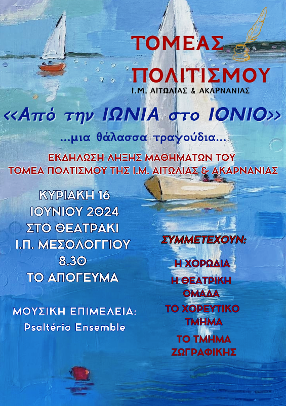 Με τη χάρη του Θεού, ο Τομέας Πολιτισμού της Ιεράς Μητροπόλεως Αιτωλίας και Ακαρνανίας, ολοκληρώνει τις ετήσιες δράσεις του για το τρέχον εκπαιδευτικό έτος και μας προσκαλεί να τιμήσουμε με την παρουσία μας την καταληκτήρια εκδήλωση που θα πραγματοποιηθεί την Κυριακή, 16 Ιουνίου 2024 και ώρα 8:30 το βράδυ, στο Ανοιχτό Θέατρο της Ιεράς Πόλεως του Μεσολογγίου στο Λιμάνι (Θεατράκι).