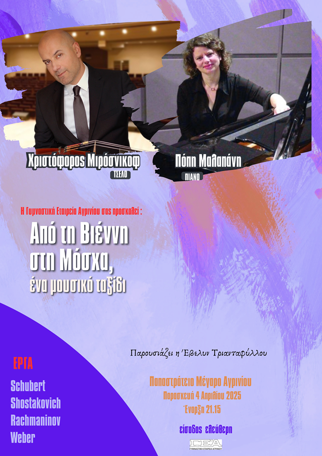 Το Τμήμα ”Πνευματικών και Καλλιτεχνικών Εκδηλώσεων” της Γυμναστικής Εταιρείας Αγρινίου παρουσιάζει την Παρασκευή 4 Απριλίου στις 21.15 στο Παπαστράτειο Μέγαρο μια συναυλία μουσικής δωματίου για βιολοντσέλο και πιάνο με τίτλο «Από τη Βιέννη στη Μόσχα, ένα μουσικό ταξίδι» και συντελεστές το Χριστόφορο Μιρόσνικοφ στο τσέλο και την Πόπη Μαλαπάνη στο πιάνο.