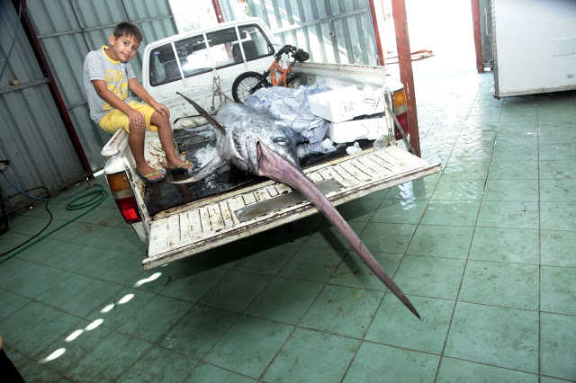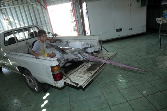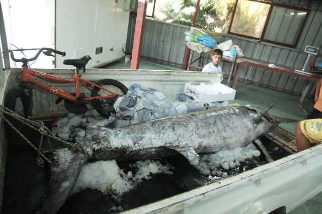 Ένας ξιφίας 4μ και βάρος 360 κιλά. Σπάνιο για ψαρά στα μέρη μας να έχει ψαρέψει τέτοιο είδος. Πρώτη φορά μου είπαν ψαράδες έχει αλιευτεί τόσο μεγάλο κήτος είτε ακούσια είτε εκούσια, αλλά και πρώτη φορά εμφανίζεται το είδος ψαριού αυτό στα νερά μας. Τελικά μεταφέρθηκε σε αποθήκη που διατηρεί ο ψαράς και αφού τεμαχίστηκε ένας μέρος μοιράστηκε σε φίλους ένα άλλο δε έγινε μεζές στα ουζάδικα για τους καθημερινούς ουζο-μπυρο καταναλωτές της πόλης του Αστακού.