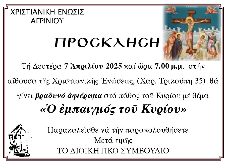 Η Χριστιανική Ένωσις Αγρινίου διοργανώνει την Δευτέρα 7 Απριλίου 2025 και ώρα 7:00 μ.μ. αφιέρωμα στο πάθος του Κυρίου, μια ευκαιρία ψυχικής προετοιμασίας για τα γεγονότα της Μεγάλης Εβδομάδας.