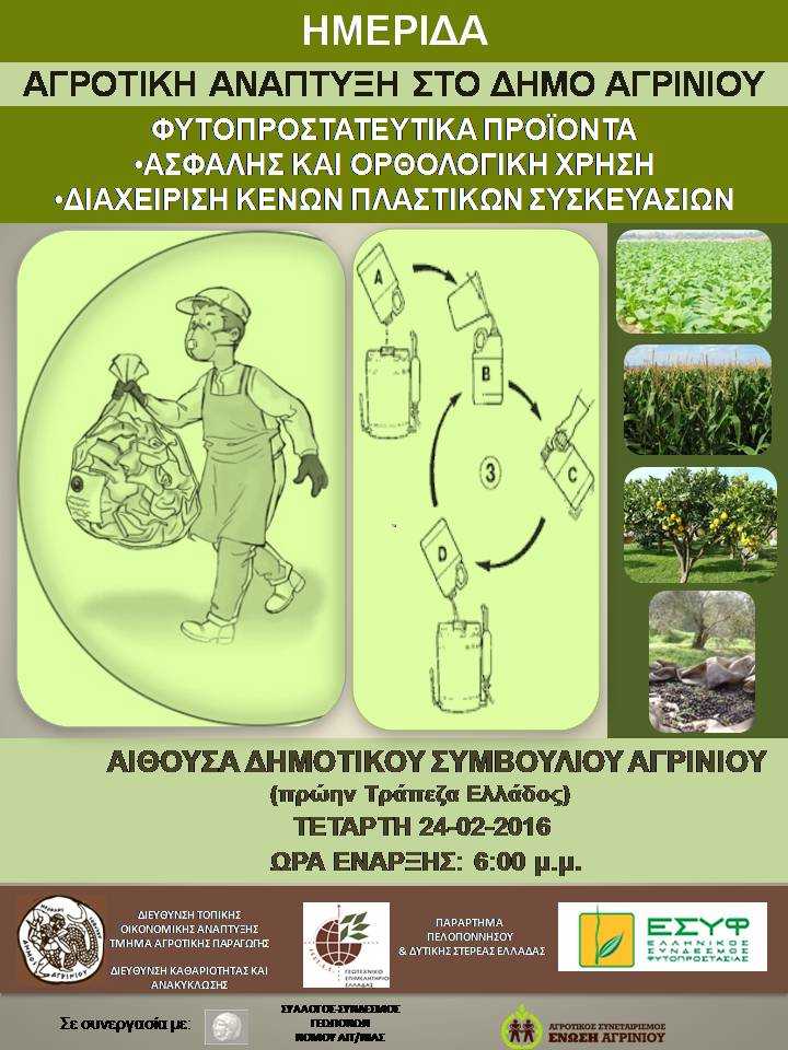 Ο Δήμος Αγρινίου και η Διοικούσα Επιτροπή του Παραρτήματος Πελοποννήσου &Δυτικής Στερεάς Ελλάδας του ΓΕΩΤΕΕ, διοργανώνουν αύριο, Τετάρτη (24/2/2016) ημερίδα με θέμα «Φυτοπροστατευτικά προϊόντα: ασφαλής και ορθολογική χρήση, διαχείριση κενών πλαστικών συσκευασιών» βάσει της κείμενης νομοθεσίας για τη διάθεση, ορθολογική χρήση των γεωργικών φαρμάκων (Ν. 4036/2012, Ν. 4253/2014) καθώς και την ορθή διαχείριση των κενών συσκευασιών τους (Ν. 2939/2001 ΚΥΑ 9268/469/2007 Εθνικό σχέδιο Δράσης, ΦΕΚ Β’ 1883/2013).