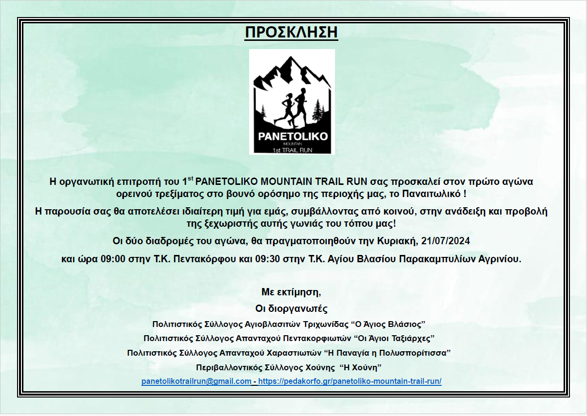 σας ευχαριστούμε θερμά για την υποστήριξή σας στην προβολή του αγώνα μας, 1st Panetoliko Mountain Trail Run στα Παρακαμπύλια Αγρινίου!!