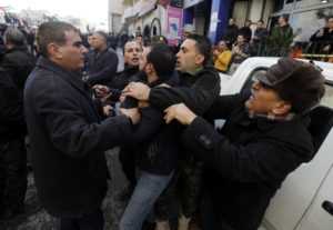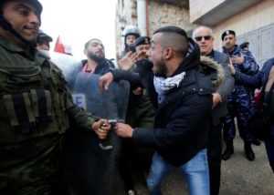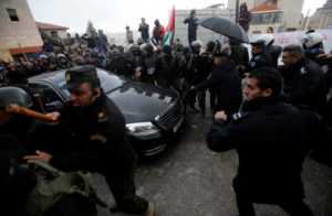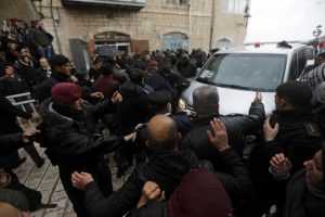 epa06419980 Palestinian security forces push away demonstrators from the convoy of Greek Orthodox Patriarch of Jerusalem Theophilos III, during a protest against his visit in the West Bank city of Bethlehem, 06 January 2018. The protest are against the Church’s alleged sale of church lands to Israelis. EPA/ABED AL HASHLAMOUN